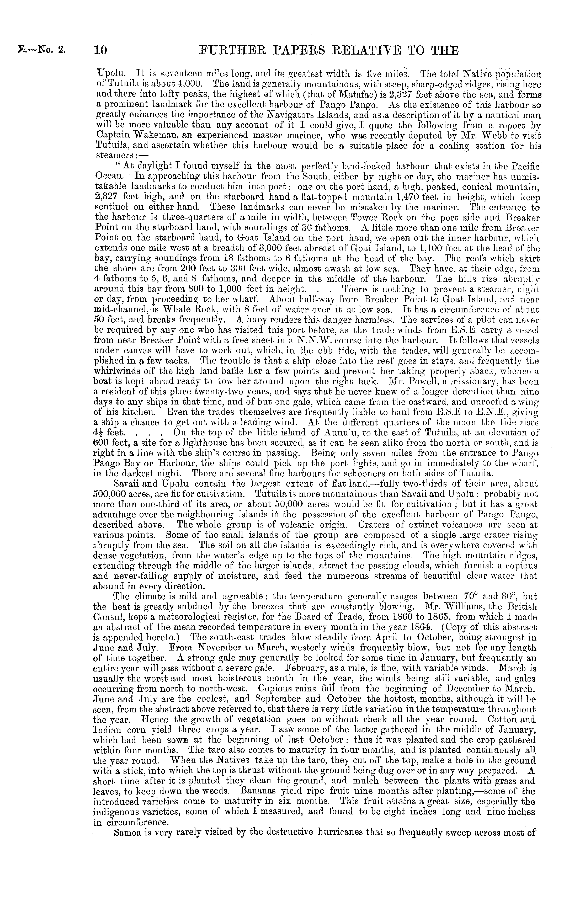 Upolu. It is seventeen miles long, and its greatest width is five miles. The total Native population of Tutuila is about 4,000. The land is generally mountainous, with steep, sharp-edged ridges, rising here and there into lofty peaks, the highest of which (that of Matafae) is 2,327 feet above the sea, and forms a prominent landmark for the excellent harbour of Pango Pango. As the existence of this harbour so greatly enhances the importance of the Navigators Islands, and as,a description of it by a nautical man will be more valuable than any account of it I could give, I quote the following from a report by Captain Wakeman, an experienced master mariner, who was recently deputed by Mr. Webb to visit Tutuila, and ascertain whether this harbour would be a suitable place for a coaling station for his steamers: — " At daylight I found myself in the most perfectly land-locked harbour that exists in the Pacific Ocean. In approaching this harbour from the South, either by night or day, the mariner has unmistakable landmarks to conduct him into port: one on the port hand, a high, peaked, conical mountain, 2,327 feet high, and on the starboard hand a flat-topped mountain 1,470 feet in height, which keep sentinel on either hand. These landmarks can never be mistaken by the mariner. The entrance to the harbour is three-quarters of a mile in width, between Tower Rock on the port side and Breaker Point on the starboard hand, with soundings of 36 fathoms. A little more than one mile from Breaker Point on the starboard hand, to Goat Island on the port hand, we open out the inner harbour, which extends one mile west at a breadth of 3,000 feet abreast of Goat Island, to 1,100 feet at the head of the bay, carrying soundings from 18 fathoms to 6 fathoms at the head of the bay. The reefs which skirt the shore are from 200 feet to 300 feet wide, almost awash at low sea. They have, at their edge, from 4 fathoms to 5, 6, and 8 fathoms, and deeper in the middle of the harbour. The hills rise abruptly around this bay from 800 to 1,000 feet in height. . . There is nothing to prevent a steamer, night or day, from proceeding to her wharf. About half-way from Breaker Point to Goat Island, and near mid-channel, is Whale Rock, with 8 feet of water over it at low sea. It has a circumference of about 50 feet, and breaks frequently. A buoy renders this danger harmless. The services of a pilot can never be required by any one who has visited this port before, as the trade winds from E.S.E. carry a vessel from near Breaker Point with a free sheet in a N.N. W. course into the harbour. It follows that vessels under canvas will have to work out, which, in the ebb tide, with the trades, will generally be accomplished in a few tacks. The trouble is that a ship close into the reef goes in stays, and frequently the whirlwinds off tho high land baffle her a few points and prevent her taking properly aback, whence a boat is kept ahead ready to tow her around upon the right tack. Mr. Powell, a missionary, has been a resident of this place twenty-two years, and says that he never knew of a longer detention than nine days to any ships in that time, and of but one gale, which came from the eastward, and unroofed a wing of his kitchen. Even the trades themselves are frequently liable to haul from E.S.E to E.N.E., giving a ship a chance to get out with a leading wind. At the different quarters of the moon the tide rises 4|- feet. . . . On the top of tho little island of Aunu'u, to the east of Tutuila, at an elevation of 600 feet, a site for a lighthouse has been secured, as it can be seen alike from the north or south, and is right in a line with the ship's course in passing. Being only seven miles from the entrance to Pango Pango Bay or Harbour, the ships could pick up the port lights, and go in immediately to the wharf, in the darkest night. There are several fine harbours for schooners on both sides of Tutuila. Savaii and Upolu contain the largest extent of fiat land, —fully two-thirds of their area, about 500,000 acres, are fit for cultivation. Tutuila is more mountainous than Savaii and Upolu: probably not more than one-third of its area, or about 50,000 acres would be fit for cultivation ; but it has a great advantage over the neighbouring islands in the possession of the excellent harbour of Pango Pango, described above. The whole group is of volcanic origin. Craters of extinct volcanoes are seen at various points. Some of the small islands of the group are composed of a single large crater rising abruptly from the sea. The soil on all the islands is exceedingly rich, and is everywhere covered with dense vegetation, from the water's edge up to the tops of the mountains. The high mountain ridges, extending through the middle of the larger islands, attract the passing clouds, which furnish a copious and never-failing supply of moisture, and feed the numerous streams of beautiful clear water that abound in every direction. The climate is mild and agreeable; the temperature generally ranges between 70° and 80°, but the heat is greatly subdued by the breezes that are constantly blowing. Mr. Williams, the British •Consul, kept a meteorological register, for the Board of Trade, from 1860 to 1865, from which I made an abstract of the mean recorded temperature in every month in the year 1864. (Copy of this abstract is appended hereto.) The south-east trades blow steadily from April to October, being strongest in June and July. From November to March, westerly winds frequently blow, but not for any length of time together. A strong gale may generally be looked for some time in January, but frequently an entire year will pass without a severe gale. February, as a rule, is fine, with variable winds. March is usually the worst and most boisterous month in the year, the winds being still variable, and gales occurring from north to north-west. Copious rains fall from the beginning of December to March. June and July are the coolest, and S