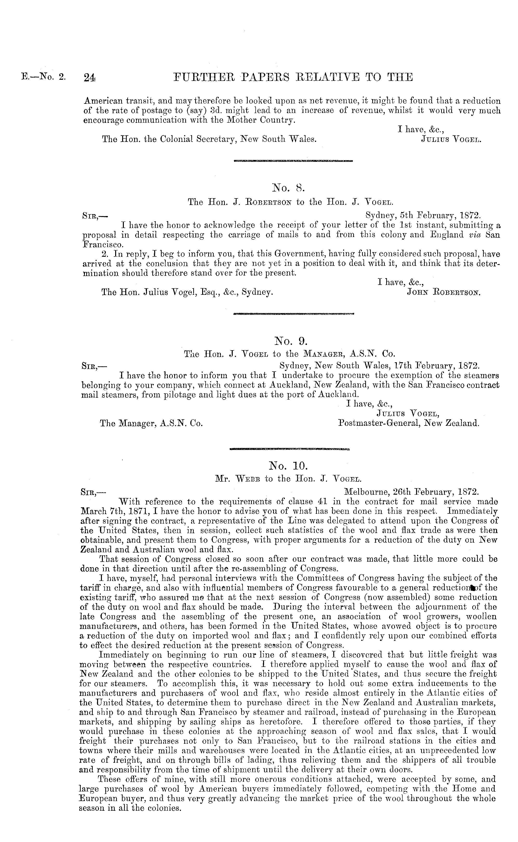 No. 8. The Hon. J. Eobeetson to the Hon. J. Vogel. Sic,— Sydney, sth February, 1872. I have the honor to acknowledge the receipt of your letter of the Ist instant, submitting a proposal in detail respecting the carriage of mails to and from this colony and England via San Francisco. 2. In reply, I beg to inform you, that this Government, having fully considered such proposal, have arrived at the conclusion that they are not yet in a position to deal with it, and think that its determination should therefore stand over for the present. I have, &c, The Hon. Julius Vogel, Esq., &c, Sydney. John Eobeetson.