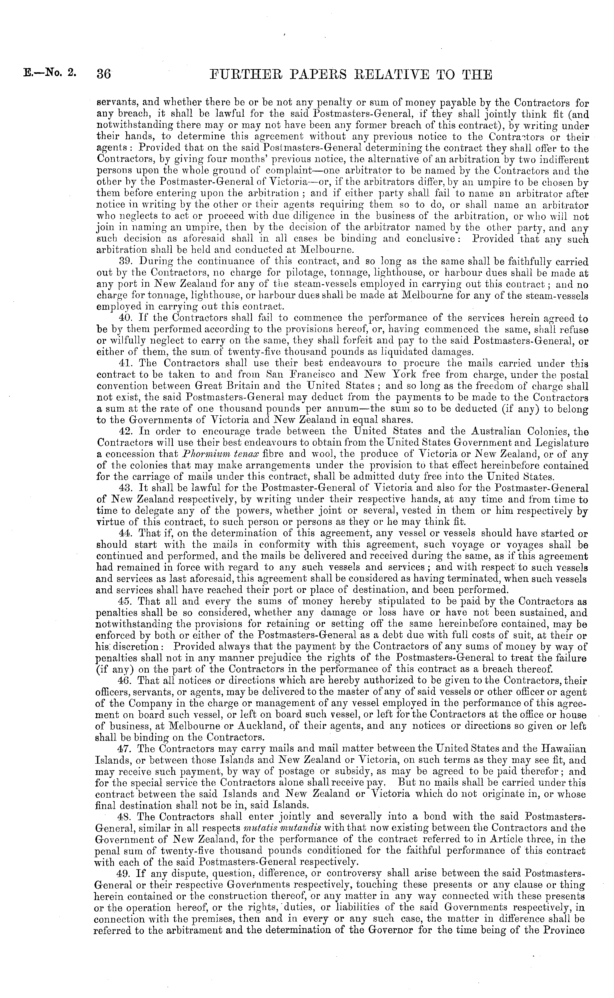 servants, and whether there be or be not any penalty or sum of money payable by the Contractors for any breach, it shall be lawful, for the said Postmasters-General, if they shall jointly think fit (and notwithstanding there may or may not have been any former breach of this contract), by writing under their hands, to determine this agreement without any previous notice to the Contractors or their agents : Provided that on the said Post masters-General determining the contract they shall offer to the Contractors, by giving four months' previous notice, the alternative of an arbitration by two indifferent persons upon the whole ground of complaint—one arbitrator to be named by the Contractors and the other by the Postmaster-General of Victoria —or, if the arbitrators differ, by an umpire to be chosen by them before entering upon the arbitration ; and if either party shall, fail to name an arbitrator after notice in writing by the other or their agents requiring them so to do, or shall name an arbitrator who neglects to act or proceed with due diligence in the business of the arbitration, or who will not join in naming an umpire, then by the decision of the arbitrator named by the other party, and any such decision as aforesaid shall in all eases bo binding and conclusive : Provided that any such arbitration shall be held and conducted at Melbourne. 39. During the continuance of this contract, and so long as the same shall be faithfully carried out by the Contractors, no charge for pilotage, tonnage, lighthouse, or harbour dues shall be made at any port in New Zealand for any of the steam-vessels employed in carrying out this contract; and no charge for tonnage, lighthouse, or harbour dues shall be made at Melbourne for any of the steam-vessels employed in carrying out this contract. 40. If the Contractors shall fail to commence the performance of the services herein agreed to be by them performed according to the provisions hereof, or, having commenced the same, shall refuse or wilfully neglect to carry on the same, they shall forfeit and pay to the said Postmasters-General, or either of them, the sum. of twenty-five thousand pounds as liquidated damages. 41. The Contractors shall use their best endeavours to procure the mails carried under this contract to be taken to and from San Francisco and New Tork free from charge, under the postal convention between Great Britain and the United States ; and so long as the freedom of charge shall not exist, the said Postmasters-General may deduct from the payments to be made to the Contractors a sum at the rate of one thousand pounds per annum —the sum so to be deducted (if any) to belong to the Governments of Victoria and New Zealand in equal shares. 42. In order to encourage trade between the United States and the Australian Colonies, the Contractors will use their best endeavours to obtain from the United States Government and Legislature a concession that Phormium tenax fibre and wool, the produce of Victoria or New Zealand, or of any of the colonies that may make arrangements under the provision to that effect hereinbefore contained for the carriage of mails under this contract, shall be admitted duty free into the United States. 43. It shall be lawful for the Postmaster-General of Victoria and also for the Postmaster-General of New Zealand respectively, by writing under their respective hands, at any time and from time to time to delegate any of the powers, whether joint or several, vested in them or him respectively by virtue of this contract, to such person or persons as they or he may think fit. 44. That if, on the determination of this agreement, any vessel or vessels should have started or should start with the mails in conformity with this agreement, such voyage or voyages shall be continued and performed, and the mails be delivered and received during the same, as if this agreement had remained in force with regard to any such vessels and services ; and with respect to such vessels and services as last aforesaid, this agreement shall be considered as having terminated, when such vessels and services shall have reached their port or place of destination, and been performed. 45. That all and &very the sums of money hereby stipulated to be paid by the Contractors as penalties shall be so considered, whether any damage or loss have or have not been sustained, and notwithstanding the provisions for retaining or setting off the same hereinbefore contained, may be enforced by both or either of the Postmasters-General as a debt due with full costs of suit, at their or his; discretion : Provided always that the payment by the Contractors of any sums of money by way of penalties shall not in any manner prejudice the rights of the Postmasters-General to treat the failure (if any) on the part of the Contractors in the performance of this contract as a breach thereof. 46. That all notices or directions which are hereby authorized to be given to the Contractors, their officers, servants, or agents, may be delivered to the master of any of said vessels or other officer or agent of the Company in the charge or management of any vessel employed in the performance of this agreement on board such vessel, or left on board such vessel, or left for the Contractors at the office or house of business, at Melbourne or Auckland, of their agents, and any notices or directions so given or left shall be binding on the Contractors. 47. The Contractors may carry mails and mail matter between the United States and the Hawaiian Islands, or between those Islands and New Zealand or Victoria, on such terms as they may see fit, and may receive such payment, by way of postage or subsidy, as may be agreed to be paid therefor; and for the special service the Contractors alone shall receive pay. But no mails shall be carried under this contract between the said Islands and New Zealand or Victoria which do not originate in, or whose final destination shall not be in, sai