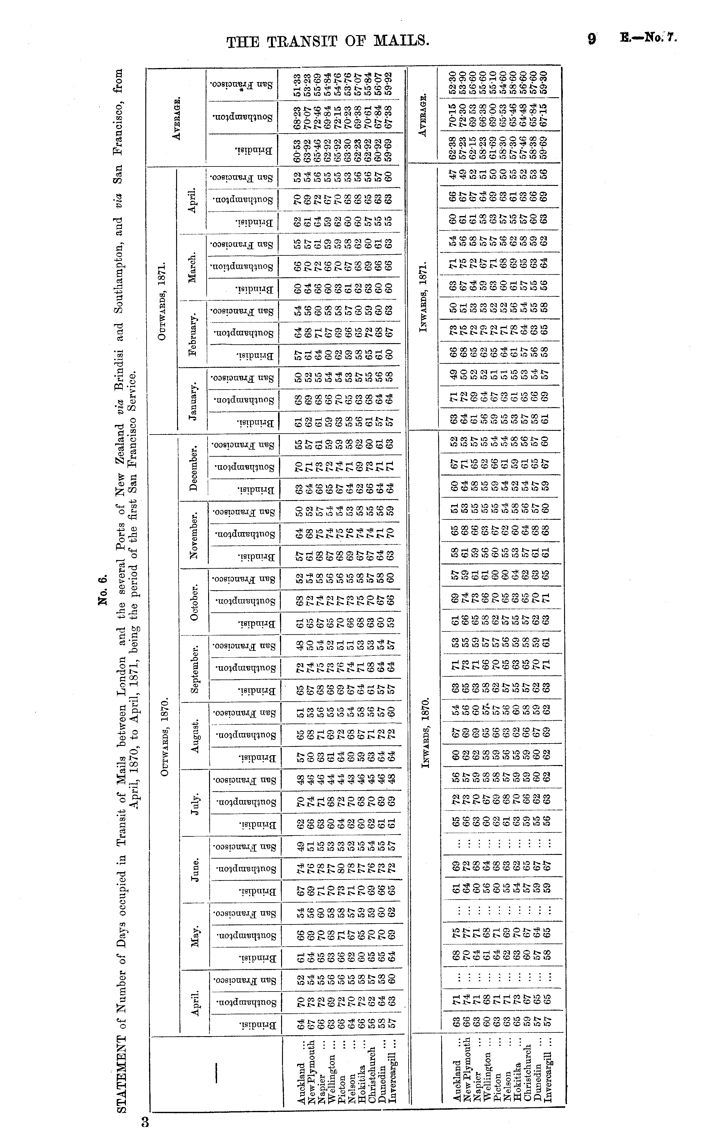 No. 6. STATEMENT of Number of Days occupied in Transit of Mails between London and the several Ports of New Zealand via Brindisi and Southampton, and via San Francisco, from April, 1870, to April, 1871, being the period of the first San Francisco Service.