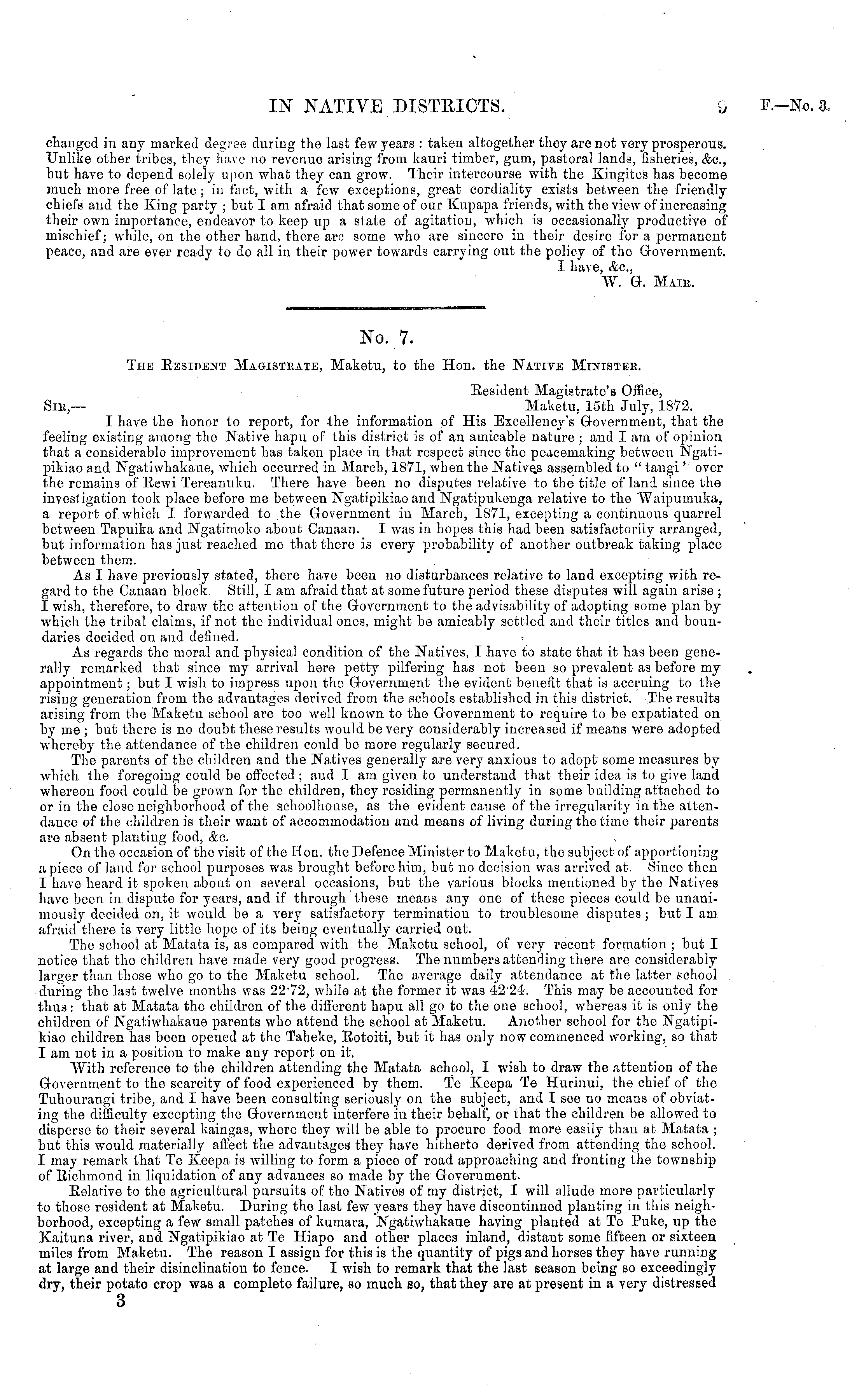 No. 7. The Eesident Magistrate, Maketu, to the Hon. the Native Minister. Eesident Magistrate's Office, Sir,— Maketu, 15th July, 1872. I have the honor to report, for the information of His Excellency's Government, that the feeling existing among the Native hapu of this district is of an amicable nature ; and I am of opinion that a considerable improvement has taken place in that respect since the peacemaking between Ngatipikiao and Ngatiwhakaue, which occurred in March, 1871, when the Natives assembled to " tangi' over the remains of Eewi Tereanuku. There have been no disputes relative to the title of land since the investigation took place before me between Ngatipikiao and Ngatipukenga relative to the Waipumuka, a report of which I forwarded to the Government in March, 1871, excepting a continuous quarrel between Tapuika and Ngatimoko about Canaan. I was in hopes this had been satisfactorily arranged, but information has just reached me that there is every probability of another outbreak taking place between them. As I have previously stated, there have been no disturbances relative to land excepting with regard to the Canaan block. Still, lam afraid that at some future period these disputes will again arise ; I wish, therefore, to draw the attention of the Government to the advisability of adopting some plan by which the tribal claims, if not the individual ones, might be amicably settled and their titles and boundaries decided on and defined. As regards the moral and physical condition of the Natives, I have to state that it has been generally remarked that since my arrival here petty pilfering has not been so prevalent as before my appointment; but I wish to impress upon the Government the evident benefit that is accruing to the rising generation from tho advantages derived from the schools established in this district. The results arising from the Maketu school are too well known to the Government to require to be expatiated on by me ; but there is no doubt these results would be very considerably increased if means were adopted whereby the attendance of the children could be more regularly secured. The parents of the children and the Natives generally are very anxious to adopt some measures by which the foregoing could be effected ; and I am given to understand that their idea is to give land whereon food could be grown for the children, they residing permanently in some building attached to or in the close neighborhood of the schoolhouse, as the evident cause of the irregularity in the attendance of the children is their want of accommodation and means of living during the time their parents are absent planting food, &c. On the occasion of the visit of the Hon. the Defence Minister to Maketu, the subject of apportioning a piece of land for school purposes was brought before him, but no decision was arrived at. Since then I have heard it spoken about on several occasions, but the various blocks mentioned by the Natives have been in dispute for years, and if through these means any one of these pieces could be unanimously decided on, it would be a very satisfactory termination to troublesome disputes ; but I am afraid there is very little hope of its being eventually carried out. Tho school at Matata is, as compared with the Maketu school, of very recent formation ; but I notice that the children have made very good progress. The numbers attending there are considerably larger than those who go to the Maketu school. The average daily attendance at the latter school during the last twelve months was 2272, while at the former it was 4224. This may be accounted for thus: that at Matata the children of the different hapu all go to the one school, whereas it is only the children of Ngatiwhakaue parents who attend the school at Maketu. Another school for the Ngatipikiao children has been opened at the Taheke, Eotoiti, but it has only now commenced working, so that I am not in a position to make any report on it. With reference to the children attending the Matata school, I wish to draw the attention of the Government to the scarcity of food experienced by them. Te Keepa Te Hurinui, the chief of the Tuhourangi tribe, and I have been consulting seriously on the subject, and I see no means of obviating tho difficulty excepting the Government interfere in their behalf, or that the children be allowed to disperse to their several kaingas, where they will be able to procure food more easily than at Matata ; but this would materially affect the advantages they have hitherto derived from attending the school. I may remark that Te Keepa is willing to form a piece of road approaching and fronting the township of Eichmond in liquidation of any advances so made by the Government. Eelative to the agricultural pursuits of tho Natives of my district, I will allude more particularly to those resident at Maketu. During tho last few years they have discontinned planting in this neighborhood, excepting a few small patches of kumara, Ngatiwhakaue having planted at Te Puke, up the Kaituna river, and Ngatipikiao at Te Hiapo and other places inland, distant some fifteen or sixteen miles from Maketu. The reason I assign for this is the quantity of pigs and horses they have running at large and their disinclination to fence. I wish to remark that the last season being so exceedingly dry, their potato crop was a complete failure, so much so, that they are at present in a very distressed 3