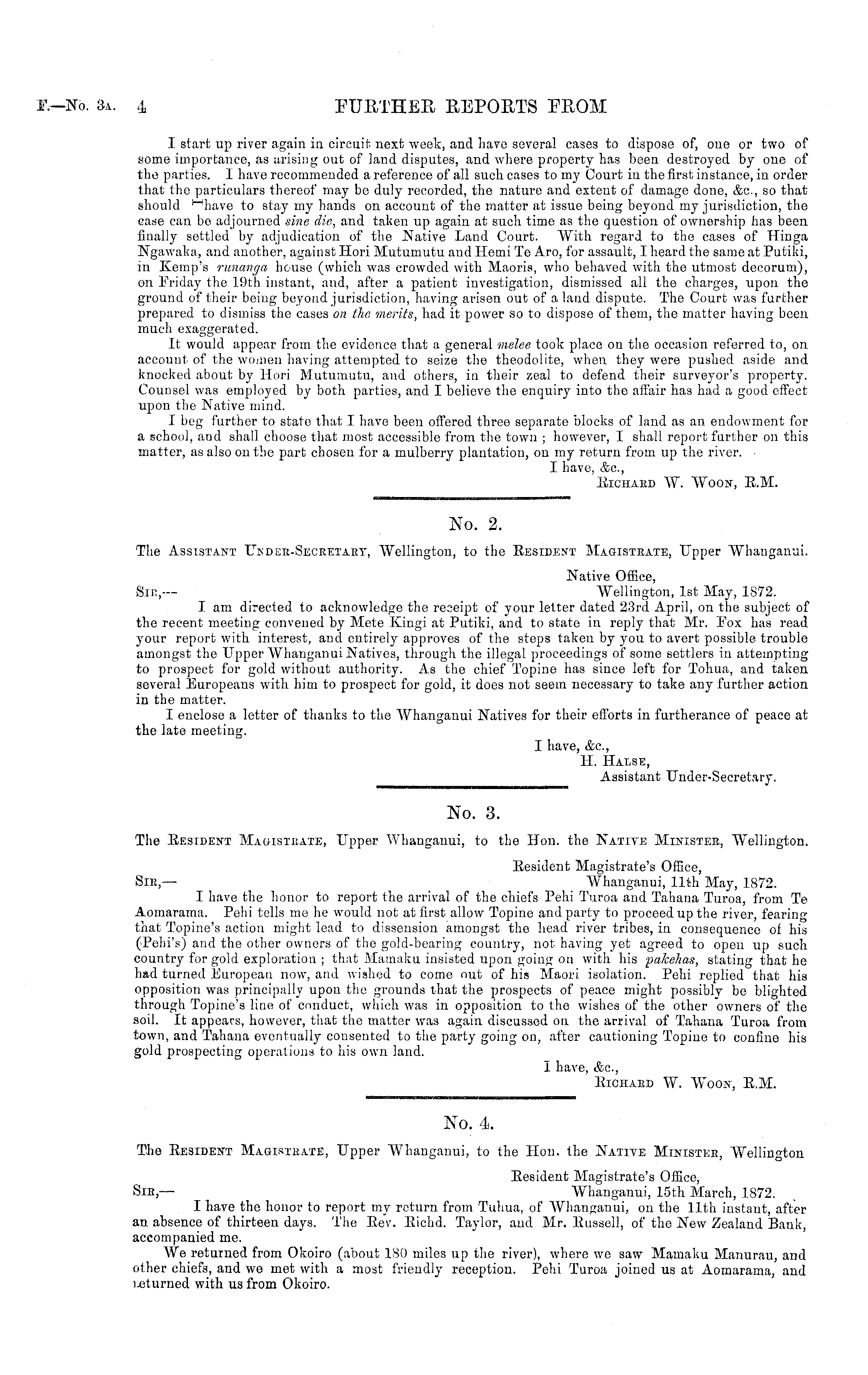 No. 3. The Eesident Magisteate, Upper Whanganui, to the Hon. the Native Ministee, Wellington. Eesident Magistrate's Office, Sic,— Whanganui, 11th May, 1872. I have the honor to report the arrival of the chiefs Pehi Turoa and Tahana Turoa, from Te Aomarama. Pehi tells me he would not at first allow Topine and party to proceed up the river, fearing that Topine's action might lead to dissension amongst the head river tribes, in consequence of his (Pebi's) and the other owners of the gold-bearing country, not having yet agreed to open up such country for gold exploration ; that Mamaku insisted upon going on with his paleehas, stating that he had turned European now, and wished to come out of his Maori isolation. Pehi replied that his opposition was principally upon the grounds that the prospects of peace might possibly be blighted through Topine's line of conduct, which was in opposition to the wishes of the other owners of the soil. It appears, however, that the matter w ras again discussed on the arrival of Tahana Turoa from town, and Tahana eventually consented to the party going on, after cautioning Topine to confine his gold prospecting operations to his own land. I have, &c, ' Eichaed W. Woos-, E.M.