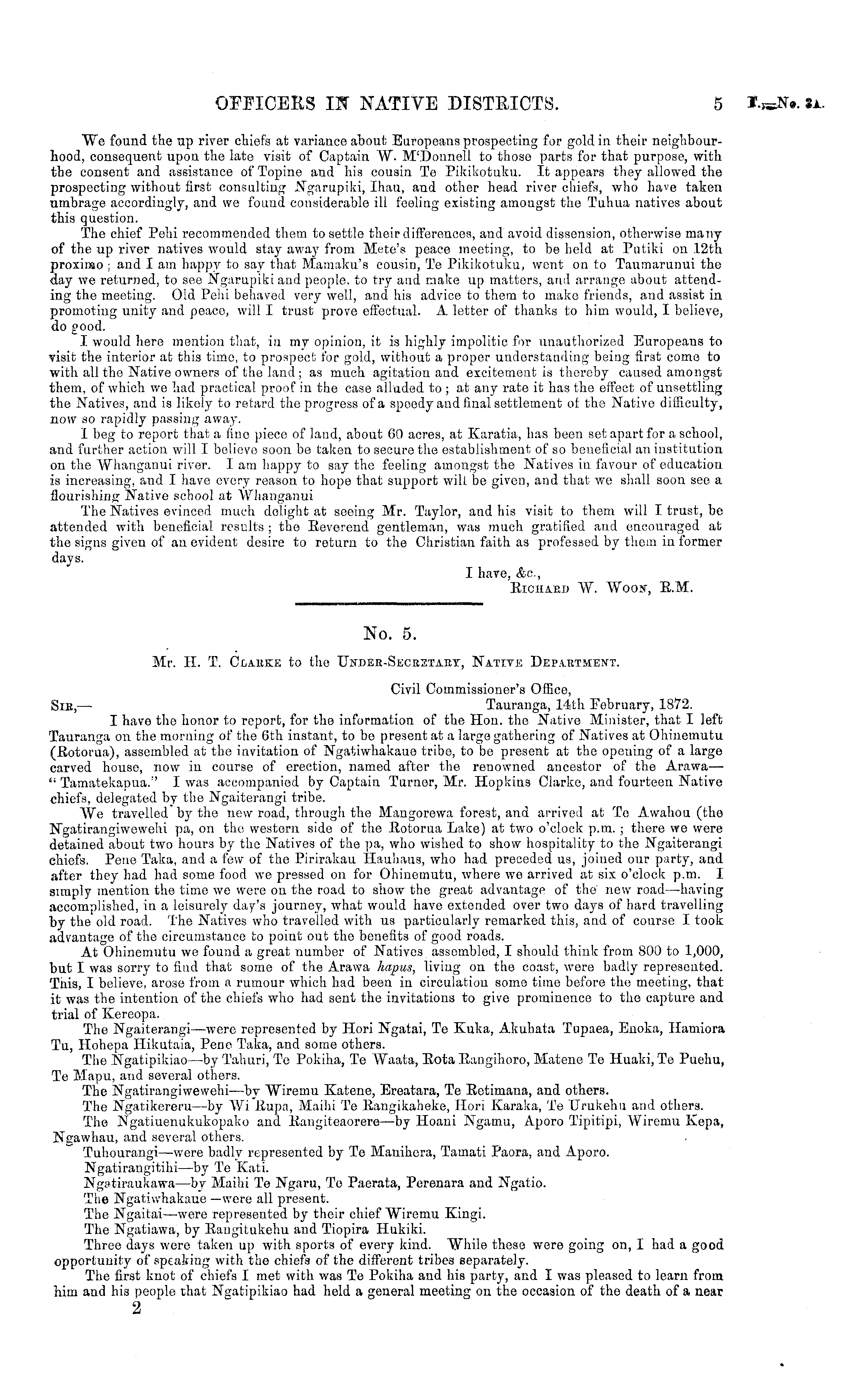 No. 5. Mr. H. T. Ccaeke to the Undee-Secestaey, Native Depaethent. Civil Commissioner's Office, Sic, — Tauranga, 14th February, 1872. I have the honor to report, for the information of the Hon. the Native Minister, that I left Tauranga on the morning of the 6th instant, to be present at a large gathering of Natives at Ohinemutu (Eotorua), assembled at the invitation of Ngativvhakaue tribe, to be present at the opening of a large carved house, now in course of erection, named after the renowned ancestor of the Arawa— " Tamatekapua." I was accompanied by Captain Turner, Mr. Hopkins Clarke, and fourteen Native chiefs, delegated by the Ngaiterangi tribe. We travelled by the new road, through the Mangorewa forest, and arrived at Te Awahou (the N^atirangiwewehi pa, on the western side of the Eotorua Lake) at two o'clock p.m. ; there we were detained about two hours by the Natives of the pa, who wished to show hospitality to the Ngaiterangi chiefs. Pene Taka, and a few of the Pirirakau Hauhaus, who had preceded us, joined our party, and after they had had some food we pressed on for Ohinemutu, where we arrived at six o'clock p.m. I simply mention the time we were on the road to show the great advantage of the new road —having accomplished, in a leisurely day's journey, what would have extended over two days of hard travelling by the old road. The Natives who travelled with us particularly remarked this, and of course I took advantage of the circumstance to point out the benefits of good roads. At Ohinemutu we found a great number of Natives assembled, I should think from 800 to 1,000, but I was sorry to find that some of the Arawa hapus, living on the coast, were badly represented. Tnis, I believe, arose from a rumour which had been in circulation some time before the meeting, that it was the intention of the chiefs who had sent the invitations to give prominence to the capture and trial of Kereopa. The Ngaiterangi —were represented by Hori Ngatai, Te Kuka, Akuhata Tupaea, Enoka, Hamiora Tv, Hohepa Hikutaia, Pene Taka, and some others. The Ngatipikiao —by Tahuri, Te Pokiha, Te Waata, Eota Eangihoro, Matene Te Huaki, Te Puehu, Te Mapu, and several others. The Ngatirangiwewehi —by Wiremu Katene, Ereatara, Te Eetimana, and others. The Ngatikereru —by Wi Eupa, Maihi Te Eangikaheke, Hori Karaka, Te Urukehu and others. The Ngatiuenukukopako and Eangiteaorere —by Hoani Ngamu, Aporo Tipitipi, Wiremu Kepa, Ngawhau, and several others. Tuhourangi—were badly represented by Te Manihera, Tamati Paora, and Aporo. Ngatirangitihi —by Te Kati. Ngatiraukawa —by Maihi Te Ngaru, To Paerata, Perenara and Ngatio. The Ngatiwhakaue —were all present. The Ngaitai —were represented by their chief Wiremu Kingi. The Ngatiawa, by Eaugitukehu and Tiopira Hukiki. Three days were taken up with sports of every kind. While these were going on, I had a good opportunity of speaking with the chiefs of the different tribes separately. The first knot of chiefs I met with was Te Pokiha and his party, and I was pleased to learn from him and his people that Ngatipikiao had held a general meeting on the occasion of the death of a near 2