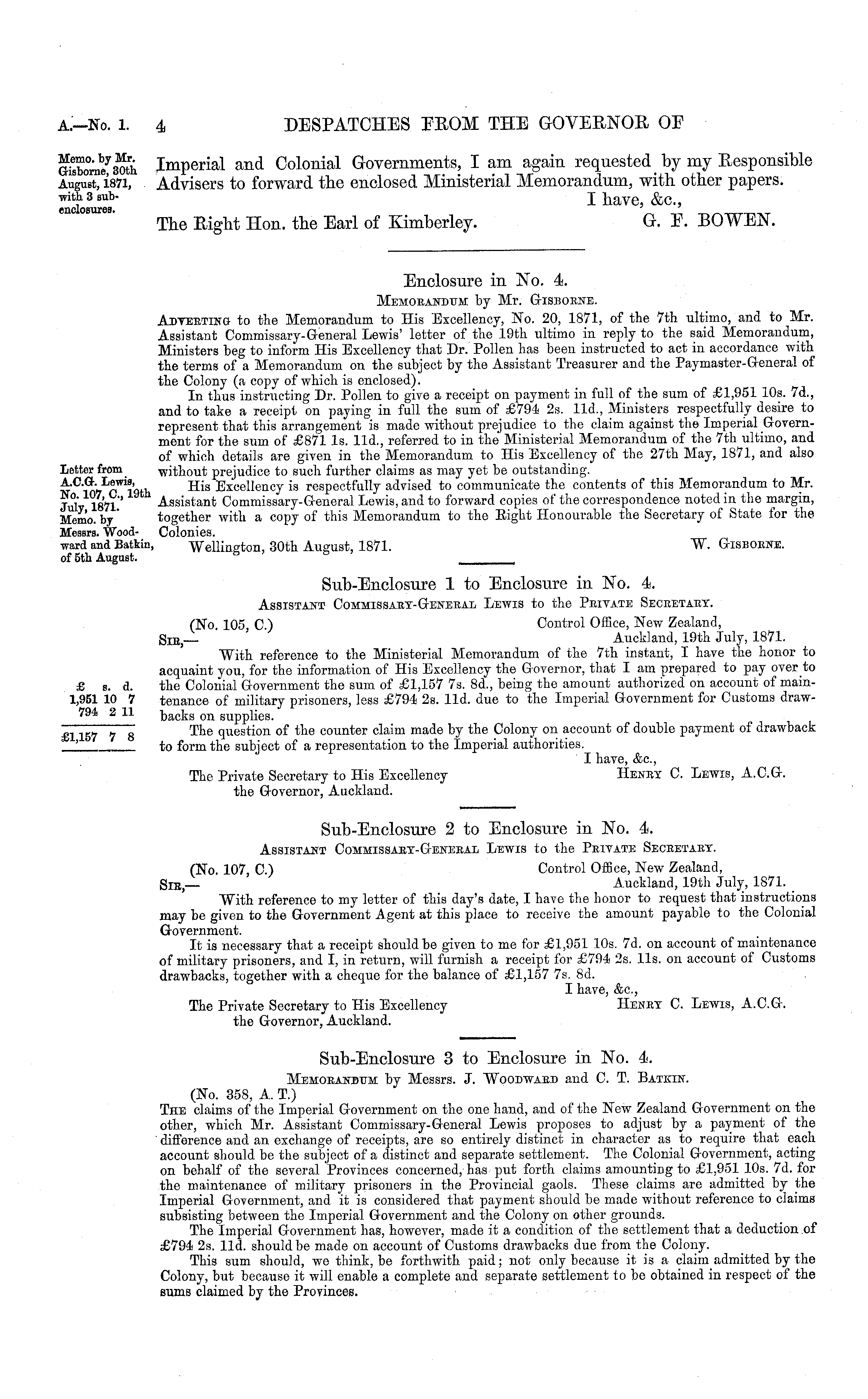 Enclosure in No. 4. Memorandum by Mr. Gisboene. Adyeeting to the Memorandum to His Excellency, No. 20, 1871, of the 7th ultimo, and to Mr. Assistant Commissary-General Lewis' letter of the 19th ultimo in reply to the said Memorandum, Ministers beg to inform His Excellency that Dr. Pollen has been instructed to act in accordance with the terms of a Memorandum on the subject by the Assistant Treasurer and the Paymaster-General of the Colony (a copy of which is enclosed). In thus instructing Dr. Pollen to give a receipt on payment in full of the sum of £1,951 10s. 7cL, and to take a receipt on paying in full the sum of £794 2s. lid., Ministers respectfully desire to represent that this arrangement is made without prejudice to the claim against the Imperial Government for the sum of £871 Is. lid., referred to in the Ministerial Memorandum of the 7th ultimo, and of which details are given in the Memorandum to His Excellency of the 27th May, 1871, and also without prejudice to such further claims as may yet be outstanding. , His Excellency is respectfully advised to communicate the contents of this Memorandum to Mr. Assistant Commissary-General Lewis, and to forward copies of the correspondence noted in the margin, together with a copy of this Memorandum to the Eight Honourable the Secretary of State for the Colonies. °. Wellington, 30th August, 1871. "W. Gisboene.