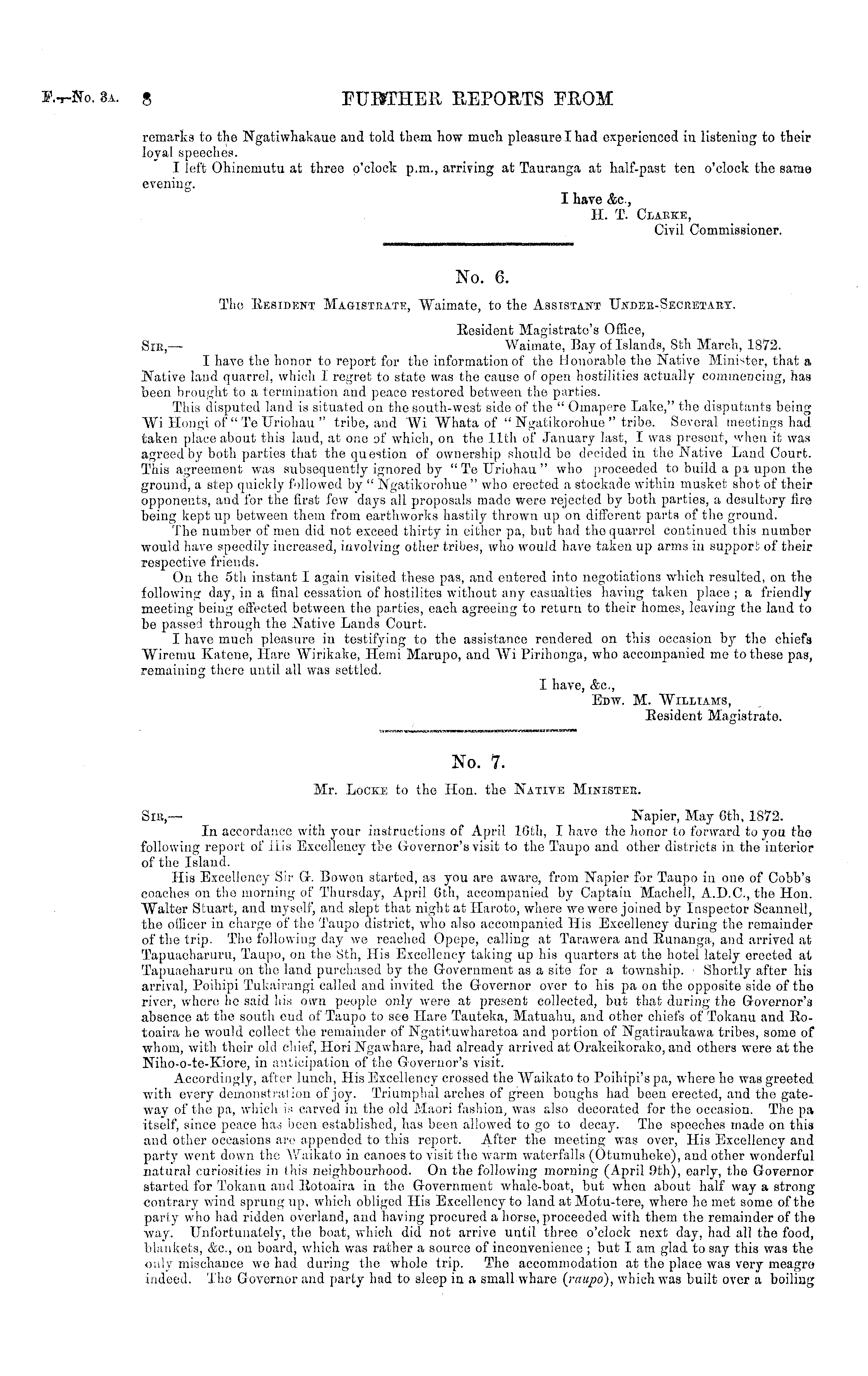 No. 7. Mr. Locke to the Hon. the Native Ministee. Sir.,— Napier, May 6th, 1872. In accordance with your instructions of April 16th, I have the honor to forward to you the following report of His Excellency the Governor's visit to the Taupo and other districts in the interior of the Island. His Excellency Sir G. Bowon started, as you are aware, from Napier for Taupo in one of Cobb's coaches on the morning of Thursday, April 6th, accompanied by Captain Machell, A.D.C., the Hon. Walter Stuart, and myself, and slept that night at Haroto, where we were joined by Inspector Scannell, the officer in charge of the Taupo district, who also accompanied His Excellency during the remainder of the trip. The following day we reached Opcpe, calling at Tarawera and Bunanga, and arrived at Tapuaeharuru, Taupo, on the Bth, His Excellency taking up his quarters at the hotel lately erected at Tapuaeharuru on the land purchased by the Government as a site for a township. ' Shortly after his arrival, Poihipi Tukairangi called and invited the Governor over to his pa on the opposite side of the river, where he said his own people only were at present collected, but that during the Governor's absence at the south end of Taupo to see Hare Tauteka, Matuahu, and other chiefs of Tokanu and Eotoaira he would collect the remainder of Ngafituwharetoa and portion of Ngatiraukawa tribes, some of whom, with their old chief, Hori Ngawhare, had already arrived at Orakeikorako, and others were at the Niho-o-te-Kiore, in anticipation of the Governor's visit. Accordingly, after lunch, His Excellency crossed the Waikato to Poihipi's pa, where he was greeted with every demonstration of joy. Triumphal arches of green boughs had been erected, and the gateway of the pa, which is carved in the old Maori fashion, was also decorated for the occasion. The pa itself, since peace has been established, has been allowed to go to decay. The speeches made on this and other occasions are appended to this report. After the meeting was over, His Excellency and party went down the Waikato in canoes to visit the warm waterfalls (Otumuhoke), and other wonderful natural curiosities in this neighbourhood. On the following morning (April 9th), early, the Governor started for Tokanu and Eotoaira in the Government whale-boat, but when about half way a strong contrary wind sprung up, which obliged His Excellency to land at Motu-tere, where he met some of the party who had ridden overland, and having procured a horse, proceeded with them the remainder of the way. Unfortunately, the boat, which did not arrive until three o'clock next day, had all the food, blankets, &c, on board, which was rather a source of inconvenience ; but I am glad to say this was the only mischance we had during the whole trip. The accommodation at the place was very meagre indeed. The Governor and party had to sleep in a small whare (raupo), which was built over a boiling