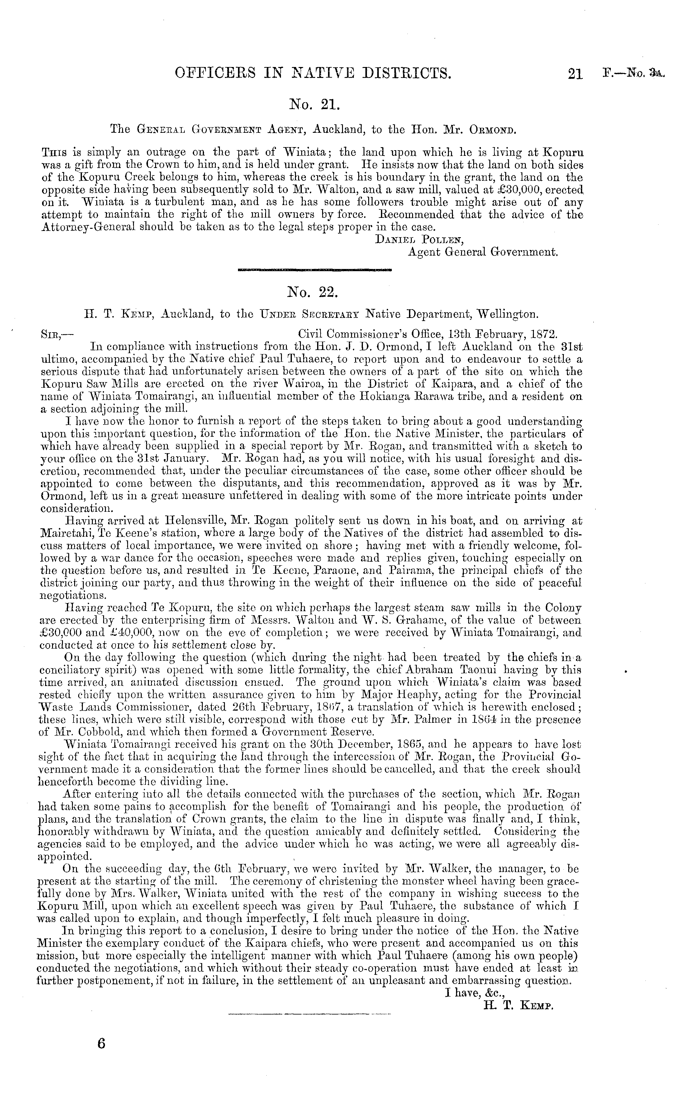 No. 22. 11. T. Kemp, Auckland, to the Undee Secbetaby Native Department, Wellington. Sib, — Civil Commissioner's Office, 13th February, 1872. In compliance with instructions from the Hon. J. D. Ormond, I left Auckland on the 31st ultimo, accompanied by the Native chief Paul Tuhaere, to report upon and to endeavour to settle a serious dispute that had unfortunately arisen between the owners of a part of the site on which the Kopuru Saw Mills are erected on the river Wairoa, in the District of Kaipara, and a chief of the name of Winiata Tomairangi, an influential member of the Hokianga Earawa tribe, and a resident on a section adjoining the mill. I have now the honor to furnish a report of the steps taken to bring about a good understanding upon this important question, for the information of the Hon. the Native Minister, the particulars of which have already been supplied in a special report by Mr. Eogan, and transmitted with a sketch to your office on the 31st January. Mr. Eogan had, as you will notice, with his usual foresight and discretion, recommended that, under the peculiar circumstances of the case, some other officer should be appointed to come between the disputants, and this recommendation, approved as it was by Mr. Ormond, left us in a great measure unfettered in dealing with some of the more intricate points under consideration. Having arrived at Helensville, Mr. Eogan politely sent us down in his boat, and on arriving at Mairetahi, To Keene's station, where a large body of the Natives of the district had assembled to discuss matters of local importance, we were invited on shore ; having met with a friendly welcome, followed by a war dance for the occasion, speeches were made and replies given, touching especially on the question before us, and resulted in Te Kecne, Paraone, and Pairama, the principal chiefs of the district joining our party, and thus throwing in the weight of their influence on the side of peaceful negotiations. Having reached Te Kopuru, the site on which perhaps the largest steam saw mills in the Colony are erected by the enterprising firm of Messrs. Walton and W. S. Grahame, of the value of between £30,000 and £40,000, now on the eve of completion; we were received by Winiata Tomairangi, and conducted at once to his settlement close by. On the day following the question (which during the night had been treated by the chiefs in a conciliatory spirit) was opened with some little formality, the chief Abraham Taonui having by this time arrived, an animated discussion ensued. The ground upon which Winiata's claim was based rested chiefly upon the written assurance given to him by Major Heaphy, acting for the Provincial Waste Lands Commissioner, dated 26th February, 1807, a translation of which is herewith enclosed; these lines, which were still visible, correspond with those cut by Mr. Palmer in 18G4 in the presence of Mr. Cobbold, and which then formed a Government Eeservo. Winiata Tomairangi received his grant on the 30th December, 1865, and he appears to have lost sight of the fact that in acquiring the land through the intercession of Mr. Eogan, the Provincial Government made it a consideration that the former lines should be cancelled, and that the creek should henceforth become the dividing line. After entering into all the details connected with the purchases of the section, which Mr. Eogan had taken some pains to accomplish for the benefit of Tomairangi and his people, the production of plans, and the translation of Crown grants, the claim to the line in dispute was finally and, I think, honorably withdrawn by Winiata, and the question amicably and definitely settled. Considering the agencies said to be employed, and the advice under which he was acting, we were all agreeably disappointed. On the succeeding day, the 6th February, we were invited by Mr. Walker, the manager, to be present at the starting of the mill. The ceremony of christening the monster wheel having been gracefully done by Mrs. Walker, Winiata united with the rest of the company in wishing success to the Kopuru Mill, upon which an excellent speech was given by Paul Tuhaere, the substance of which I was called upon to explain, and though imperfectly, I felt much pleasure in doing. In bringing this report to a conclusion, I desire to bring under the notice of the Hon. the Native Minister the exemplary conduct of the Kaipara chiefs, who were present and accompanied us on this mission, but more especially the intelligent manner with which Paul Tuhaere (among his own people) conducted the negotiations, and which without their steady co-operation must have ended at least in further postponement, if not in failure, in the settlement of an unpleasant and embarrassing question. I have, &c, EL T. Kemp.