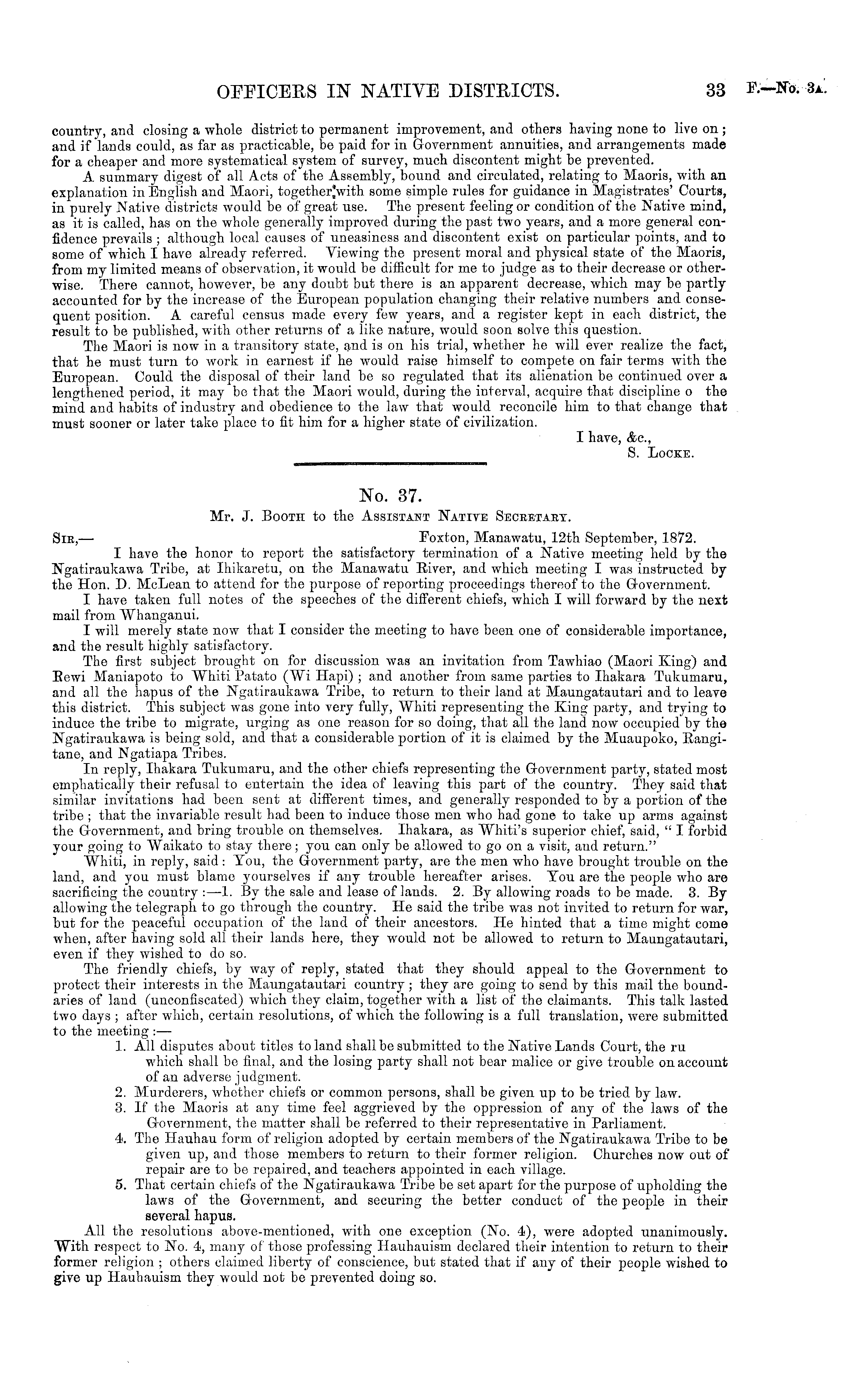 No. 37. Mr. J. Booth to the Assistant Native Seceetaby. Sic, — Foxton, Manawatu, 12th September, 1872. I have the honor to report the satisfactory termination of a Native meeting held by the Ngatiraukawa Tribe, at Ihikaretu, on the Manawatu Eiver, and which meeting I was instructed by the Hon. D. McLean to attend for the purpose of reporting proceedings thereof to the Government. I have taken full notes of the speeches of the different chiefs, which I will forward by the next mail from Whanganui. I will merely state now that I consider the meeting to have been one of considerable importance, and the result highly satisfactory. The first subject brought on for discussion was an invitation from Tawhiao (Maori King) and Eewi Maniapoto to Whiti Patato (Wi Hapi) ; and another from same parties to Ihakara Tukumaru, and all the hapus of the Ngatiraukawa Tribe, to return to their land at Maungatautari and to leave this district. This subject was gone into very fully, Whiti representing the King party, and trying to induce the tribe to migrate, urging as one reason for so doing, that all the land now occupied by the Ngatiraukawa is being sold, and that a considerable portion of it is claimed by the Muaupoko, Eangitane, and Ngatiapa Tribes, In reply, Ihakara Tukumaru, and the other chiefs representing the Government party, stated most emphatically their refusal to entertain the idea of leaving this part of the country. They said that similar invitations had been sent at different times, and generally responded to by a portion of the tribe ; that the invariable result had been to induce those men who had gone to take up arms against the Government, and bring trouble on themselves. Ihakara, as Whiti's superior chief, said, " I forbid your going to Waikato to stay there; you can only be allowed to go on a visit, and return." Whiti, in reply, said : You, the Government party, are the men who have brought trouble on the land, and you must blame yourselves if any trouble hereafter arises. You are the people who are sacrificing the country : —l. By the sale and lease of lands. 2. By allowing roads to be made. 3. By allowing the telegraph to go through the country. He said the tribe was not invited to return for war, but for the peaceful occupation of the land of their ancestors. He hinted that a time might come when, after having sold all their lands here, they would not be allowed to return to Maungatautari, even if they wished to do so. The friendly chiefs, by way of reply, stated that they should appeal to the Government to protect their interests in the Maungatautari country ; they are going to send by this mail the boundaries of land (unconfiscated) which they claim, together with a list of the claimants. This talk lasted two days ; after which, certain resolutions, of which the following is a full translation, were submitted to the meeting : — 1. All disputes about titles to land shall be submitted to the Native Lands Court, the ru which shall be final, and the losing party shall not bear malice or give trouble on account of an adverse judgment. 2. Murderers, whether chiefs or common persons, shall be given up to be tried by law. 3. If the Maoris at any time feel aggrieved by the oppression of any of the laws of the Government, the matter shall be referred to their representative in Parliament. 4. The Hauhau form of religion adopted by certain members of the Ngatiraukawa Tribe to be given up, and those members to return to their former religion. Churches now out of repair are to be repaired, and teachers appointed in each village. 5. That certain chiefs of the Ngatiraukawa Tribe be set apart for the purpose of upholding the laws of the Government, and securing the better conduct of the people in their several hapus. All the resolutions above-mentioned, with one exception (No. 4), were adopted unanimously. With respect to No. 4, many of those professing Hauhauism declared their intention to return to their former religion ; others claimed liberty of conscience, but stated that if any of their people wished to give up Hauhauism they would not be prevented doing so.