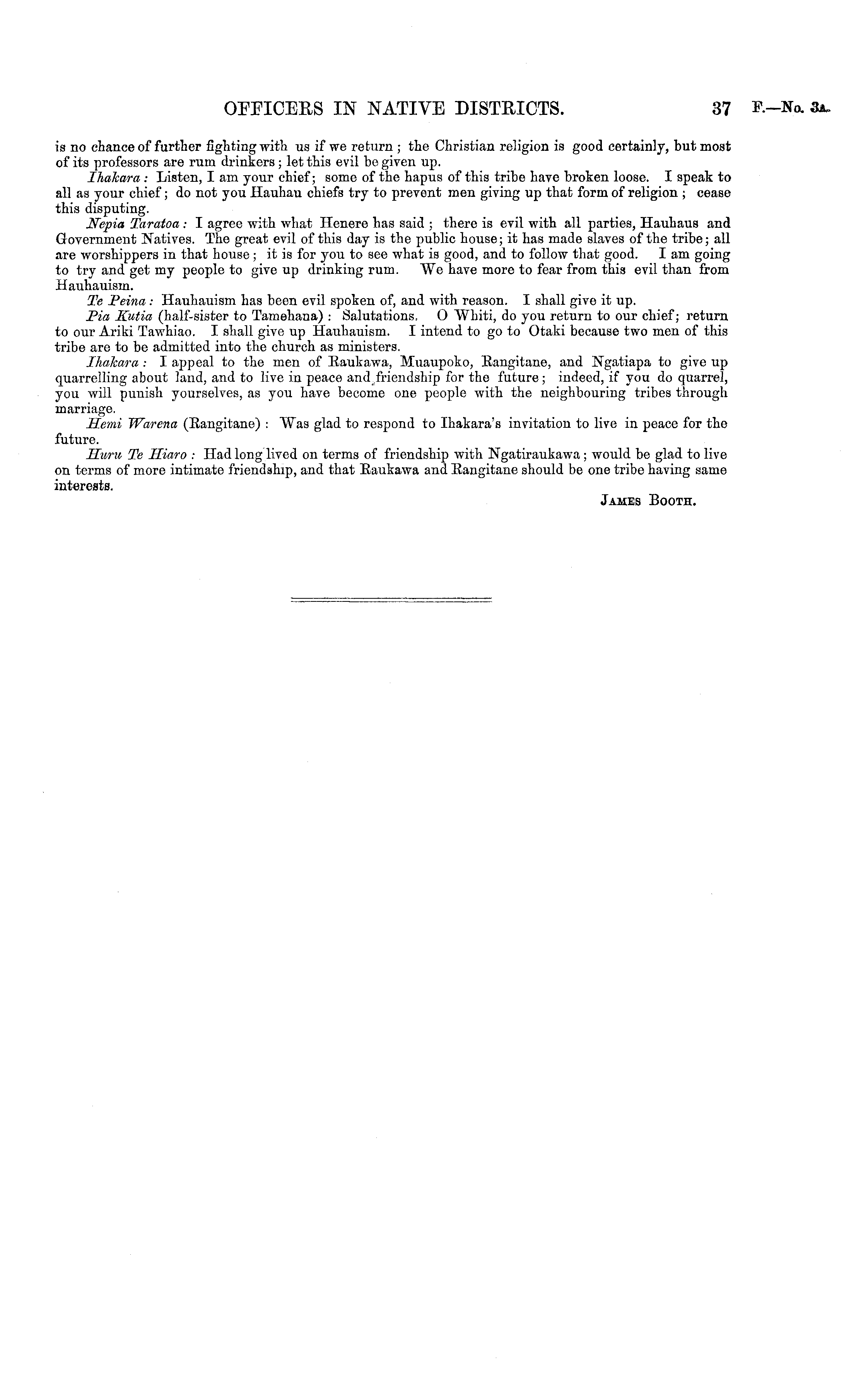 is no chance of further fighting with us if we return; the Christian religion is good certainly, but most of its professors are rum drinkers ; let this evil be given up. Ihakara : Listen, lam your chief; some of the hapus of this tribe have broken loose. I speak to all as your chief; do not you Hauhau chiefs try to prevent men giving up that form of religion ; cease this disputing. Nepia Taratoa: I agree with what Henere has said ; there is evil with all parties, Hauhaus and Government Natives. The great evil of this day is the public house; it has made slaves of the tribe; all are worshippers in that house; it is for you to see what is good, and to follow that good. lam going to try and get my people to give up drinking rum. We have more to fear from this evil than from Hauhauism. Te Peina : Hauhauism has been evil spoken of, and with reason. I shall give it up. Pia Kutia (half-sister to Tamehana) : Salutations. O Whiti, do you return to our chief; return to our Ariki Tawhiao. I shall give up Hauhauism. I intend to go to Otaki because two men of this tribe are to be admitted into the church as ministers. Ihakara: I appeal to the men of Eaukawa, Muaupoko, Eangitane, and Ngatiapa to give up quarrelling about land, and to live in peace and friendship for the future; indeed, if you do quarrel, you will punish yourselves, as you have become one people with the neighbouring tribes through marriage. Hemi Warena (Eangitane) : Was glad to respond to Ihakara's invitation to live in peace for the future. Huru Te Hiaro : Had long lived on terms of friendship with Ngatiraukawa ; would be glad to live on terms of more intimate friendship, and that Eaukawa and Eangitane should be one tribe having same interests. James Booth.