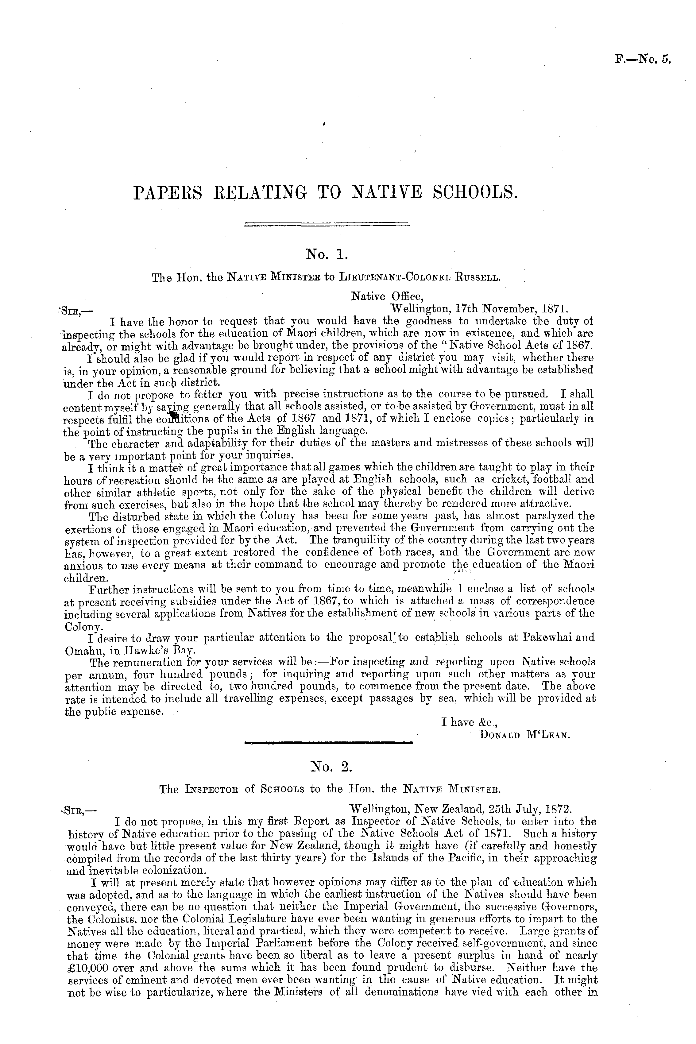 No. 1. The Hon. the Native Ministeb to Lieutenant-Colonel Eussell. Native Office, ;S IK) — Wellington, 17th November, 1871. I have the honor to request that you would have the goodness to undertake the duty ot inspecting the schools for the education of Maori children, which are now in existence, and which are already, or might with advantage be brought under, the provisions of the " Native School Acts of 1867. I should also be glad if you would report in respect of any district you may visit, whether there is, in your opinion, a reasonable ground for believing that a- school might with advantage be established under the Act in such district. Ido not propose to fetter you with precise instructions as to the course to be pursued. I shall content myself by saving generally that all schools assisted, or to be assisted by Government, must in all respects fulfil the coMitions of the Acts pf 1867 and 1871, of which I enclose copies; particularly in the point of instructing the pupils in the English language. The character and adaptability for their duties of the masters and mistresses of these schools will be a very important point for your inquiries. I think it a matter of great importance that all games which the children are taught to play in their hours of recreation should be the same as are played at English schools, such as cricket, football and other similar athletic sports, not only for the sake of the physical benefit the children will derive from such exercises, but also in the hope that the school may thereby be rendered more attractive. The disturbed state in which the Colony has been for some years past, has almost paralyzed the exertions of those engaged in Maori education, and prevented the Government from carrying out the system of inspection provided for by the Act. The tranquillity of the country during the last two years has, however, to a great extent restored the confidence of bofh races, and the Government are now anxious to use every means at their command to encourage and promote the education of the Maori children. Eurther instructions will bo sent to you from time to time, meanwhile I enclose a list of schools at present receiving subsidies under the Act of 1867, to which is attached a mass of correspondence including several applications from Natives for the establishment of new schools in various parts of the Colony. I desire to draw your particular attention to the proposal^ to establish schools at Pak.whai and Omahu, in Hawke's Bay. The remuneration for your services will be :■ —Eor inspecting and reporting upon Native schools per annum, four hundred pounds ; for inquiring and reporting upon such other matters as your attention may be directed to, two hundred pounds, to commence from the present date. The above rate is intended to include all travelling expenses, except passages by sea, which will be provided at the public expense. I have &c, Donald M'Lean.