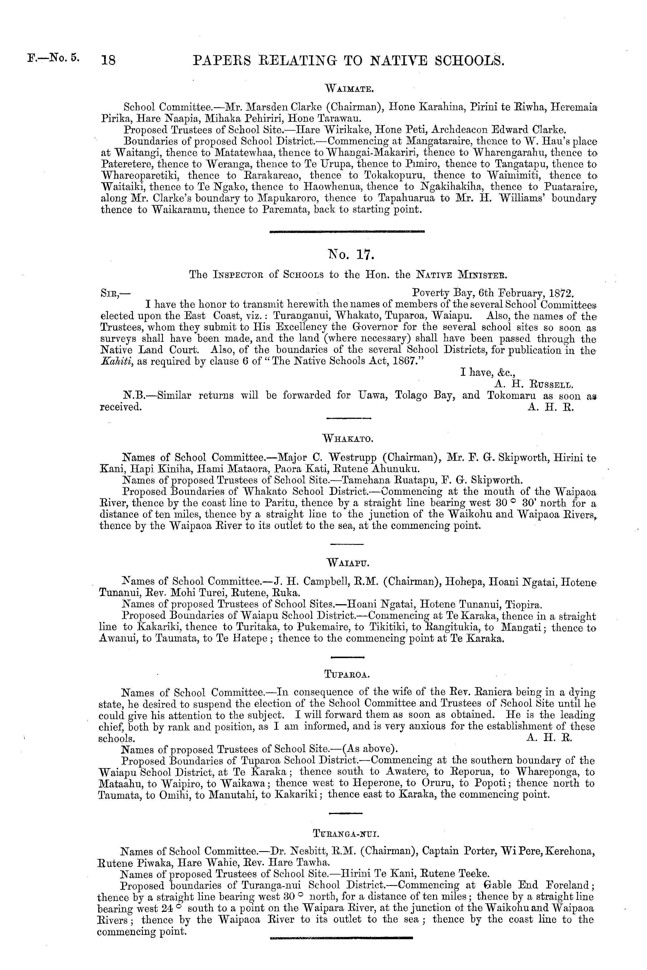 No. 17. The Inspectoe of Schools to the Hon. the Native Ministeb. Sic,— Poverty Bay, 6th February, 1872. I have the honor to transmit herewith the names of members of the several School Committees elected upon the East Coast, viz.: Turanganui, Whakato, Tuparoa, Waiapu. Also, the names of the Trustees, whom they submit to His Excellency the Governor for the several school sites so soon as surveys shall have been made, and the land (where necessary) shall have been passed through the Native Land Court. Also, of the boundaries of the several School Districts, for publication in the Kahiti, as required by clause 6 of " The Native Schools Act, 1867." I have, See., A. H. Russell. N.B. —Similar returns will be forwarded for LTawa, Tolago Bay, and Tokomaru as soon a* received. A. H. R.