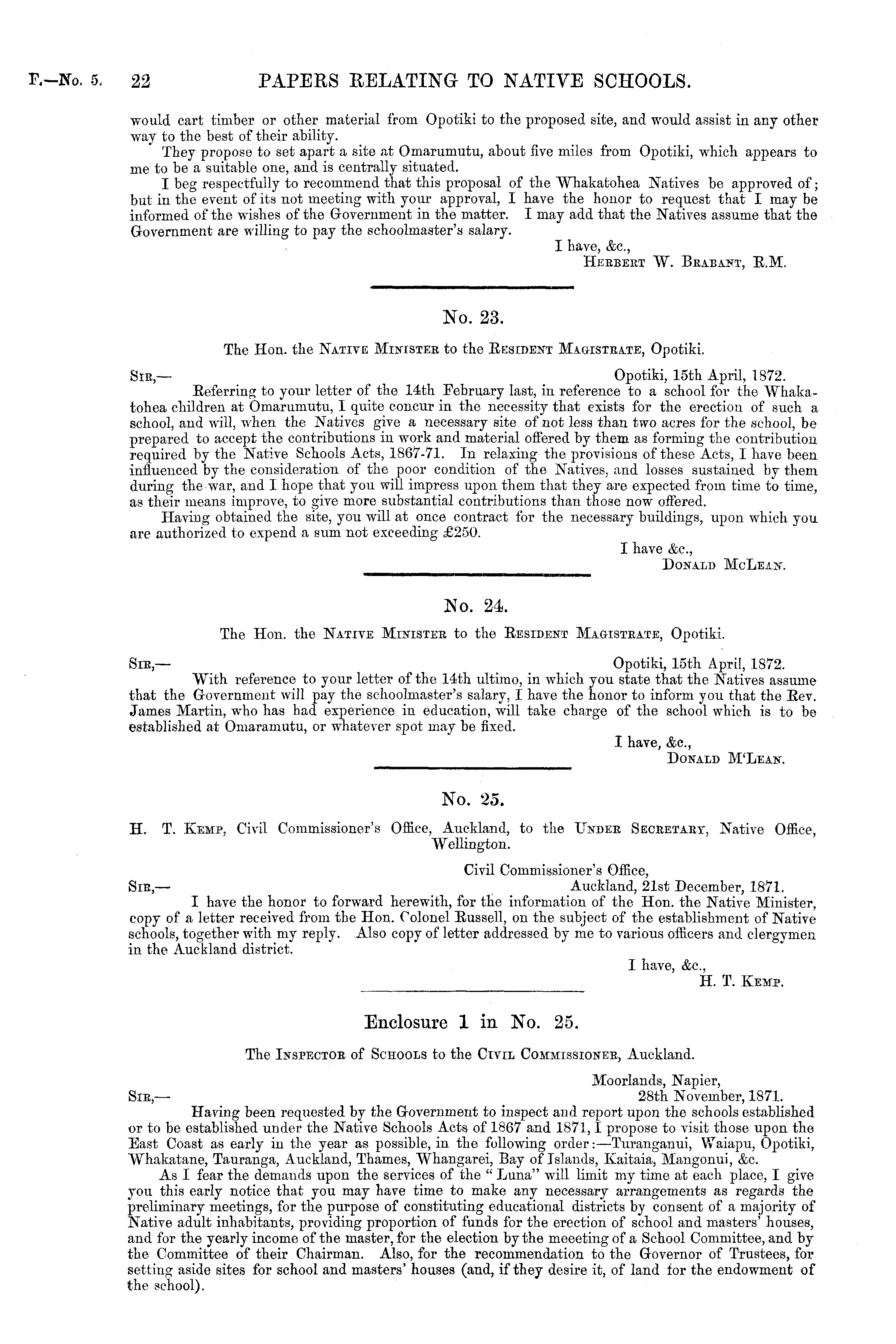 No. 23. The Hon. the Native Ministee to the Resident Magisteate, Opotiki. Sic,— Opotiki, 15th April, 1872. Referring to your letter of the 14th February last, in reference to a school for the Whakatohea children at Omarumutu, I quite concur in the necessity that exists for the erection of such a school, and will, when the Natives give a necessary site of not less than two acres for the school, be prepared to accept the contributions in work and material offered by them as forming the contribution required by the Native Schools Acts, 1867-71. In relaxing the provisions of these Acts, I have been influenced by the consideration of the poor condition of the Natives, and losses sustained by them during the war, and I hope that you will impress upon them that they are expected from time to time, as their means improve, to give more substantial contributions than those now offered. Having obtained the site, you will at once contract for the necessary buildings, upon which you are authorized to expend a sum not exceeding £250. I have Sec., Donald McLean.