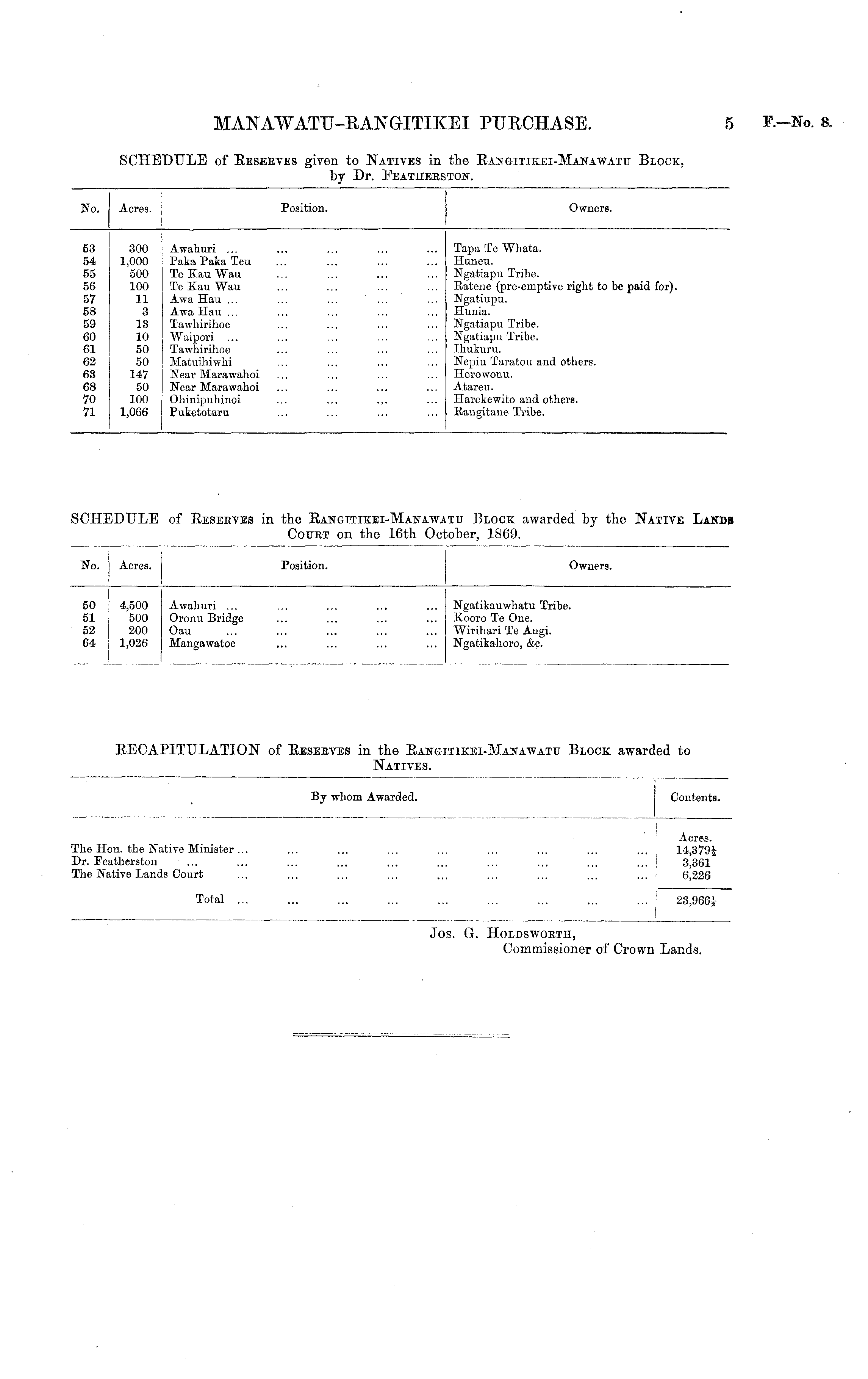 SCHEDULE of RESERVES given to NATIVES in the RANGITIKEI-MANAWATU BLOCK, by Dr. FEATHERSTON.