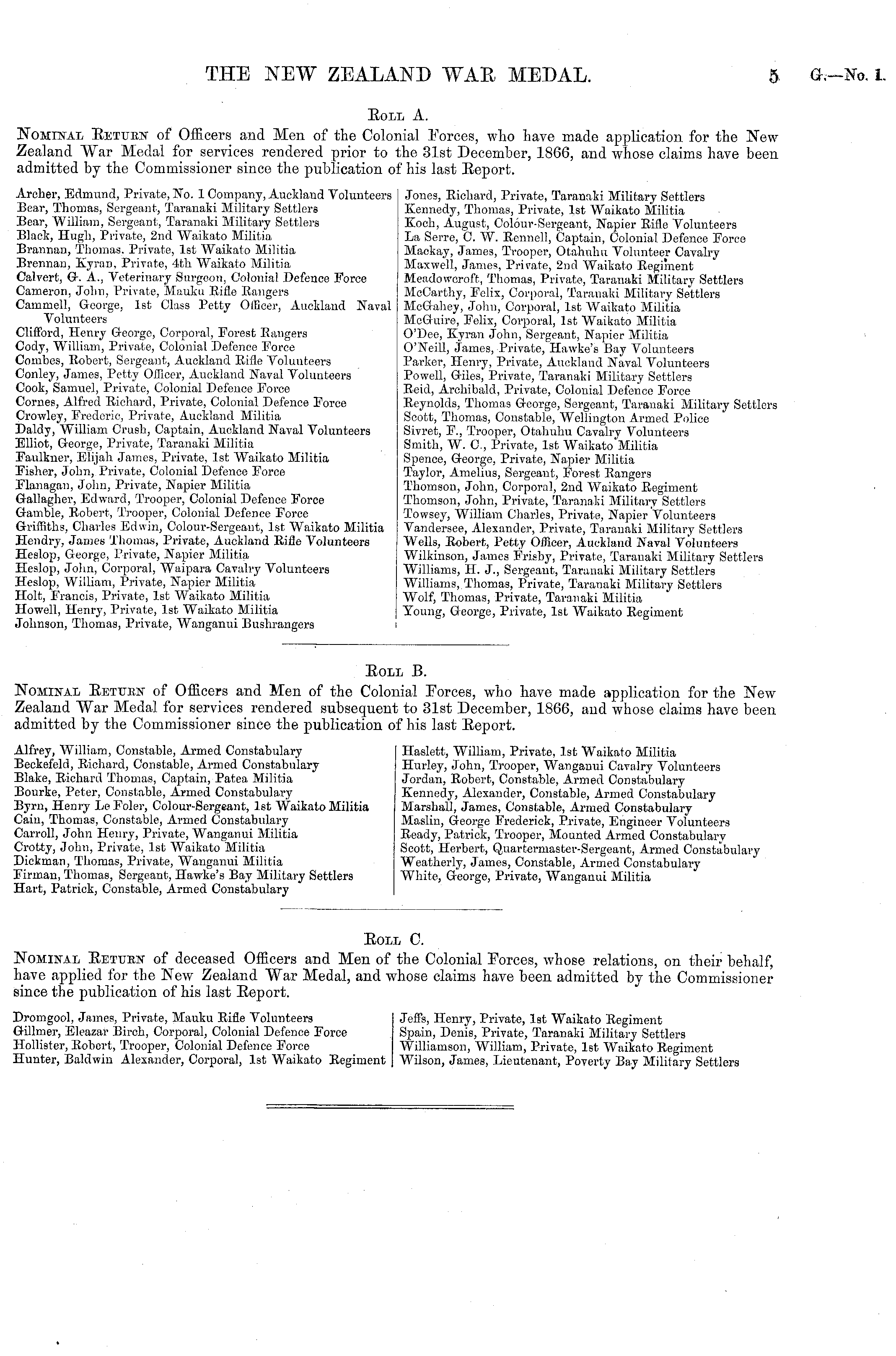 Roll A. Nominal Return of Officers and Men of the Colonial Forces, who have made application for the New Zealand War Medal for services rendered prior to the 31st December, 1866, and whose claims have been admitted by the Commissioner since the publication of his last Report. Archer, Edmund, Private, No. 1 Company, Auckland Volunteers Jones, Richard, Private, Taranaki Military Settlers Bear, Thomas, Sergeant, Taranaki Military Settlers Kennedy, Thomas, Private, 1st Wnikato Militia Bear, William, Sergeant, Taranaki Military Settlers Koch, August, Colour-Sergeant, Napier Rifle Volunteers Black, Hugh, Private, 2nd Waikato Militia La Serre, C. W. Rennell, Captain, Colonial Defence Force Brannau, Thomas. Private, 1st Waikato Militia Mackay, James, Trooper, Otahuhu Volunteer Cavalry Brennan, Kyran, Private, 4th Waikato Militia i Maxwell, James, Private, 2nd Waikato Regiment Calvert, G. A., Veterinary Surgeon, Colonial Defence Force Meadowcroft, Thomas, Private, Taranaki Military Settlers Cameron, John, Private, Mauku Rifle Rangers McCarthy, Felix, Corporal, Taranaki Military Settlers Cammell, George, 1st Class Petty Officer, Auckland Naval McGahey, John, Corporal, 1st Waikato Militia Volunteers McGuire, Felix, Corporal, 1st Waikato Militia Clifford, Henry George, Corporal, Forest Rangers , O'Dee, Kyran John, Sergeant, Napier Militia Cody, William, Private, Colonial Defence Force O'Neill, James, Private, Hawke's Bay Volunteers Combes, Robert, Sergeant, Auckland Rifle Volunteers Parker, Henry, Private, Auckland Naval Volunteers Conley, James, Petty Officer, Auckland Naval Volunteers Powell, Giles, Private, Taranaki Military Settlers Cook, Samuel, Private, Colonial Defence Force Reid, Archibald, Private, Colonial Defence Force Cornes, Alfred Richard, Private, Colonial Defence Force Reynolds, Thoma3 George, Sergeant, Taranaki Military Settlers Crowlcy, Frederic, Private, Auckland Militia Scott, Thomas, Constable, Wellington Armed Police Daldy, William Crush, Captain, Auckland Naval Volunteers Sivret, F., Trooper, Otahuhu Cavalry Volunteers Elliot, George, Private, Taranaki Militia Smith, W. C, Private, 1st Waikato Militia Faulkner, Elijah James, Private, 1st Waikato Militia Spcnce, George, Private, Napier Militia Fisher, John, Private, Colouial Defence Force Taylor, Amelius, Sergeant, Forest Rangers Flanagan, John, Private, Napier Militia Thomson, John, Corporal, 2nd Waikato Regiment Gallagher, Edward, Trooper, Colonial Defence Force Thomson, John, Private, Taranaki Military Settlers Gamble, Robert, Trooper, Colonial Defence Force Towsey, William Charles, Private, Napier Volunteers Griffiths, Charles Edwin, Colour-Sergeant, 1st Waikato Militia Vandersee, Alexander, Private, Taranaki Military Settlers Hendry, James Thomas, Private, Auckland Rifle Volunteers Wells, Robert, Petty Officer, Auckland Naval Volunteers Heslop, George, Private, Napier Militia Wilkinson, James Frisby, Private, Taranaki Military Settlers Heslop, John, Corporal, Waipara Cavalry Volunteers Williams, H. J., Sergeant, Taranaki Military Settlers Heslop, William, Private, Napier Militia Williams, Thomas, Private, Taranaki Military Settlers Holt, Francis, Private, 1st Waikato Militia Wolf, Thomas, Private, Taranaki Militia Howell, Henry, Private, 1st Waikato Militia Young, George, Private, 1st Waikato Regiment Johnson, Thomas, Private, Wanganui Bushrangers i
