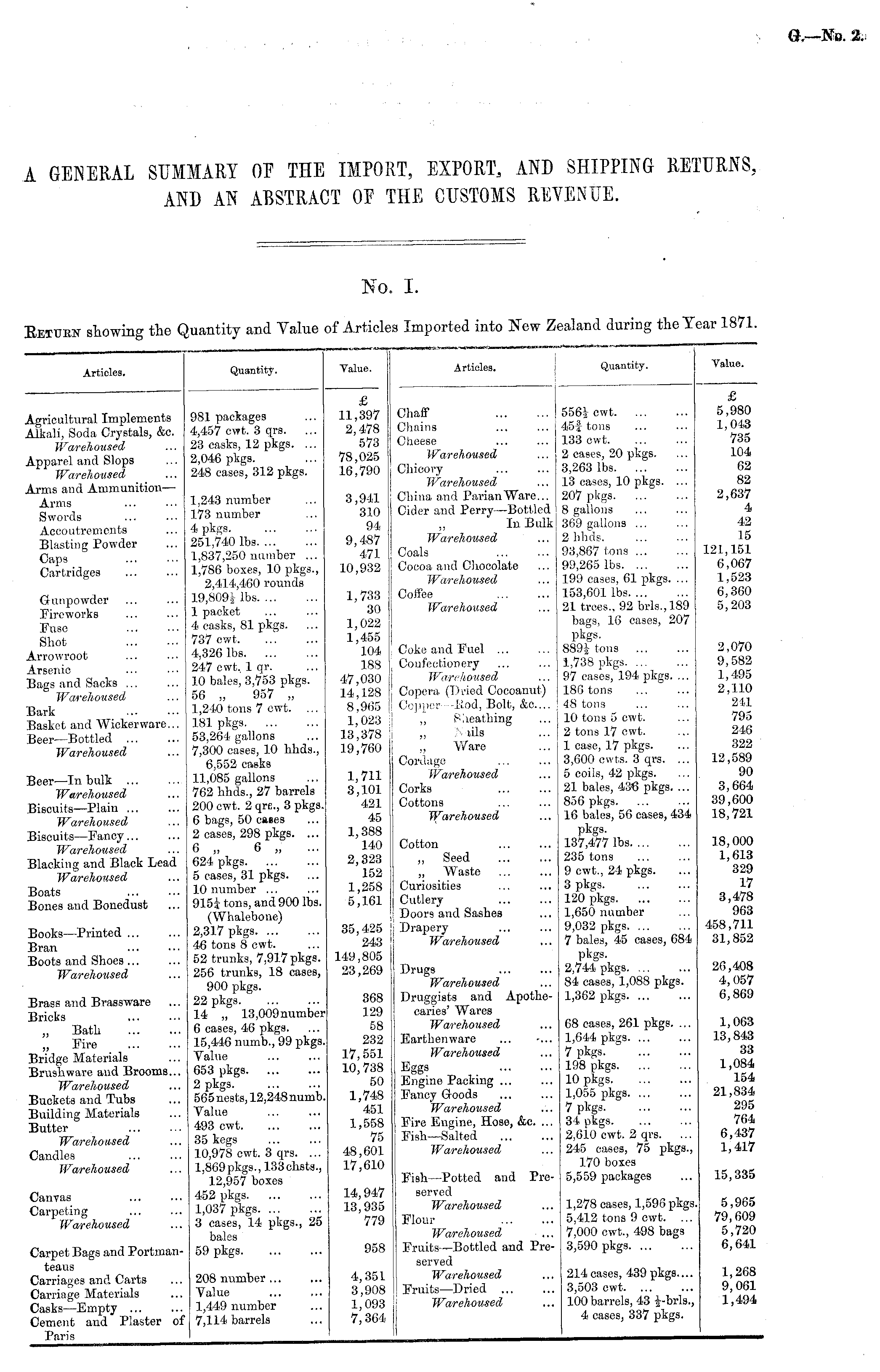 No. I. RETURN showing the Quantity and Value of Articles Imported into New Zealand during the Year 1871.