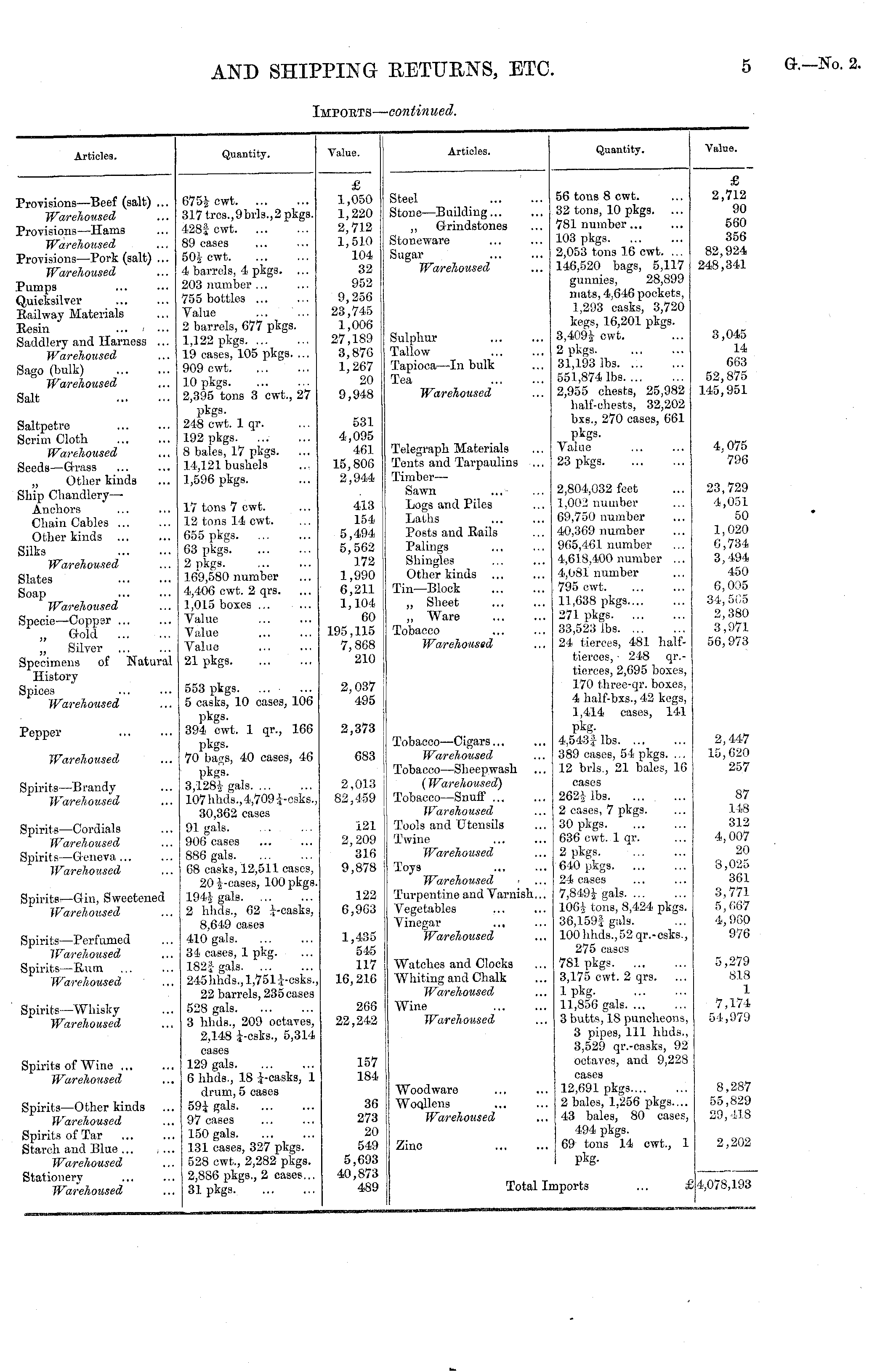 Quantity. Value. Articles. Quantity. Value. Articles. Provisions —Beef (salt) ... Warehoused Provisions —Hams Warehoused Provisions —Pork (salt) ... Warehoused Pumps Quicksilver Bailway Materials Besin ... i ... Saddlery and Harness ... Warehoused Sago (bulk) Warehoused 675J cwt 317trcs.,9brls.,2pkgs. 428-J cwt 89 cases 50i cwt. 4 barrels, 4 pkgs. ... 203 number ... 755 bottles ... Value 2 barrels, 677 pkgs. 1,122 pkgs 19 eases, 105 pkgs. ... 909 cwt 10 pkgs. 2,395 tons 3 cwt., 27 pkgs. 248 cwt. 1 qr. 192 pkgs 8 bales, 17 pkgs. 14,121 bushels 1,596 pkgs. £ 1,050 1,220 2,712 1,510 104 32 952 9,256 23,745 1,006 27,189 3,876 1,267 20 9,948 Steel Stone —Building ,, Grindstones Stoneware Sugar Warehoused 56 tons 8 cwt. 32 tons, 10 pkgs. ... 781 number ... 103 pkgs 2,053 tons 16 cwt. ... 146,520 bags, 5,117 gunnies, 28,899 mats, 4,646 pockets, 1,293 casks, 3,720 kegs, 16,201 pkgs. 3,409$ cwt. 2 pkgs. 31,193 lbs 551,874 lbs 2,955 chests, 25,982 half-chests, 32,202 bxs., 270 cases, 661 pkgs. Value 23 pkgs £ 2,712 90 560 356 82,924 248,341 Sulphur Tallow Tapioca —In bulk Tea Warehoused 3,045 14 663 52,875 145,951 Salt Saltpetre Scrim Cloth Warehoused Seeds —Grass „ Other kinds Ship Chandlery — Anchors Chain Cables Other kinds Silks Warehoused 531 4,095 461 15,806 2,944 Telegraph Materials Tents and Tarpaulins ... Timber — Sawn ..." Logs and Piles Laths Posts and Bails Palings Shingles Other kinds ... Tin —Block ,, Sheet ,, Ware Tobacco Warehoused 4,075 796 Slates Soap Warehoused Specie —Copper „ Gold „ Silver ... Specimens of Natural History Spices Warehoused 17 tons 7 cwt. 12 tons 14 cwt. 655 pkgs. 63 pkgs. 2 pkgs 169,580 number 4,406 cwt. 2 qrs. 1,015 boxes ... ... Value Value Value 21 pkgs. 413 154 5,494 5,562 172 1,990 6,211 1,104 60 | 195,115 7,868 210 2,804,032 feet 1,002 number 69,750 number 40,369 number 965,461 number 4,618,400 number ... 4,081 number 795 cwt 11,638 pkgs 271 pkgs. 33,523 lbs 24 tierces, 481 halftierces, • 248 qr.tierees, 2,695 boxes, 170 three-qr. boxes, 4 half-bxs., 42 kegs, 1,414 eases, 141 pkg. 4,5434 lbs 389 cases, 54 pkgs. ... 12 brls., 21 bales, 16 23,729 4,051 50 1,020 6,734 3,494 450 6,005 34,505 2,380 3,971 56,973 553 pkgs. 5 casks, 10 cases, 106 pkgs. 394 cwt, 1 qr., 166 pkgs. 70 bags, 40 cases, 46 pkgs. 3,128| gals 107hhds.,4,709|-csks., 30,362 cases 91 gals. 906 cases 886 gals. 68 casks, 12,511 cases, 20 i-cases, 100 pkgs. 194igalB 2 hhds., 62 J-casks, 8,649 cases 410 gals. 34 cases, 1 pkg. 1825 gals 2451ihds.,l,751|-csks., 22 barrels, 235 cases 528 gals. 3 hhds., 209 octaves, 2,148 i-csks., 5,314 cases 129 gals 6 hhds., 18 i-casks, 1 drum, 5 cases 59-i gals. 97 eases 150 gals. 131 cases, 327 pkgs. 528 cwt., 2,282 pkgs. 2,8S6 pkgs., 2 cases... 31 pkgs 2,037 495 Tobacco —Cigars... Warehoused Tobacco —Shecpwash ( Warehoused) Tobacco —Snuff Warehoused Tools and Utensils Twine Warehoused 2, 447 15,620 257 Pepper 2,373 Warehoused 683 Spirits —Brandy Warehoused 2,013 82,459 cases 262$ lbs. ... 2 cases, 7 pkgs. 30 pkgs 636 cwt. 1 qr. 2 pkgs 610 pkgs 24 cases 7,849$ gals 106$ tons, 8,424 pkgs. 36,159f gals. 100 hhds., 52 qr.-csks., 275 cases 781 pkgs 3,175 cwt. 2 qrs. Ipbg 11,856 gals. ... 3 butts, 18 puncheons, 3 pipes, 111 hhds., 3,529 qr.-casks, 92 octaves, and 9,228 cases 12,691 pkgs 2 bales, 1,256 pkgs.... 43 bales, 80 cases, 494 pkgs. 69 tons 14 cwt., 1 pkg87 148 312 4,007 20 8,025 361 3,771 5,667 4,980 976 Spirits —Cordials Warehoused Spirit s—Geneva Warehoused 121 2,209 316 9,878 Spirits—Gin, Sweetened Warehoused 122 6,963 Toys Warehoused Turpentine and Varnish... Vegetables Vinegar ... Warehoused Spirits —Perfumed Warehoused Spirits —Bum Warehoused 1,435 545 117 16,216 Watches and Clocks Whiting and Chalk Warehoused 5,279 818 1 7,174 54,979 Spirits —Whisky Warehoused 266 22,242 Wine Warehoused Spirits of Wine ... Warehoused 157 184 Wood ware Woollens Warehoused 8,287 55,829 29,418 Spirits —Other kinds Warehoused Spirits of Tar Starch and Blue ... i.. . Warehoused Stationery Warehoused 36 273 20 549 5,693 40,873 489 Zinc 2,202 Total I uports ... i 4,078,193