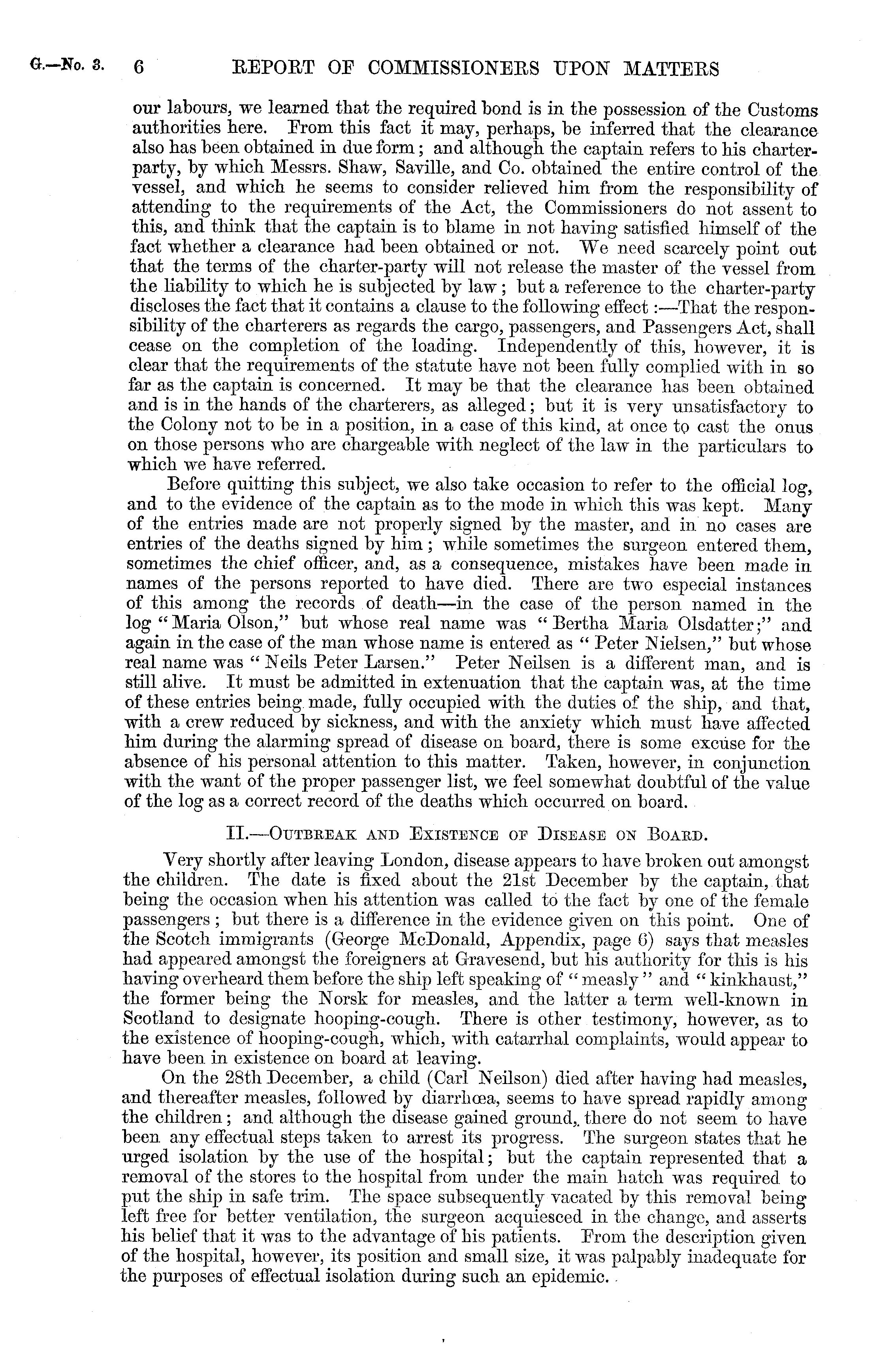 our labours, we learned that the required bond is in the possession of the Customs authorities here. Erom this fact it may, perhaps, be inferred that the clearance also has been obtained in due form; and although the captain refers to his charterparty, by which Messrs. Shaw, Saville, and Co. obtained the entire control of the vessel, and which he seems to consider relieved him from the responsibility of attending to the requirements of the Act, the Commissioners do not assent to this, and think that the captain is to blame in not having satisfied himself of the fact whether a clearance had been obtained or not. We need scarcely point out that the terms of the charter-party will not release the master of the vessel from the liability to which he is subjected by law ; but a reference to the charter-party discloses the fact that it contains a clause to the following effect:—That the responsibility of the charterers as regards the cargo, passengers, and Passengers Act, shall cease on the completion of the loading. Independently of this, however, it is clear that the requirements of the statute have not been fully complied with in so far as the captain is concerned. It may be that the clearance has been obtained and is in the hands of the charterers, as alleged; but it is very unsatisfactory to the Colony not to be in a position, in a case of this kind, at once to cast the onus on those persons who are chargeable with neglect of the law in the particulars to which we have referred. Before quitting this subject, we also take occasion to refer to the official log, and to the evidence of the captain as to the mode in which this was kept. Many of the entries made are not properly signed by the master, and in no cases are entries of the deaths signed by him; while sometimes the surgeon entered them, sometimes the chief officer, and, as a consequence, mistakes have been made in names of the persons reported to have died. There are two especial instances of this among the records of death—in the case of the person named in the log "Maria Olson," but whose real name was "Bertha Maria Olsdatter;" and again in the case of the man whose name is entered as " Peter Nielsen," but whose real name was " Neils Peter Larsen." Peter Neilsen is a different man, and is still alive. It must be admitted in extenuation that the captain was, at the time of these entries being made, fully occupied with the duties of the ship, and that, with a crew reduced by sickness, and with the anxiety which must have affected him during the alarming spread of disease on board, there is some excuse for the absence of his personal attention to this matter. Taken, however, in conjunction with the want of the proper passenger list, we feel somewhat doubtful of the value of the log as a correct record of the deaths which occurred on board. ll.—Outbreak and Existence of Disease on Board. Very shortly after leaving London, disease appears to have broken out amongst the children. The date is fixed about the 21st December by the captain, that being the occasion when his attention was called to the fact by one of the female passengers ; but there is a difference in the evidence given on this point. One of the Scotch immigrants (George McDonald, Appendix, page 6) says that measles had appeared amongst the foreigners at Gravesend, but his authority for this is his having overheard them before the ship left speaking of " measly " and " kinkhaust," the former being the Norsk for measles, and the latter a term well-known in Scotland to designate hooping-cough. There is other testimony, however, as to the existence of hooping-cough, which, with catarrhal complaints, would appear to have been in existence on board at leaving. On the 28th December, a child (Carl Neilson) died after having had measles, and thereafter measles, followed by diarrhoea, seems to have spread rapidly among the children; and although the disease gained ground,, there do not seem to have been any effectual steps taken to arrest its progress. The surgeon states that he urged isolation by the use of the hospital; but the captain represented that a removal of the stores to the hospital from under the main hatch was required to put the ship in safe trim. The space subsequently vacated by this removal being left free for better ventilation, the surgeon acquiesced in the change, and asserts his belief that it was to the advantage of his patients. Erom the description given of the hospital, however, its position and small size, it was palpably inadequate for the purposes of effectual isolation during such an epidemic.