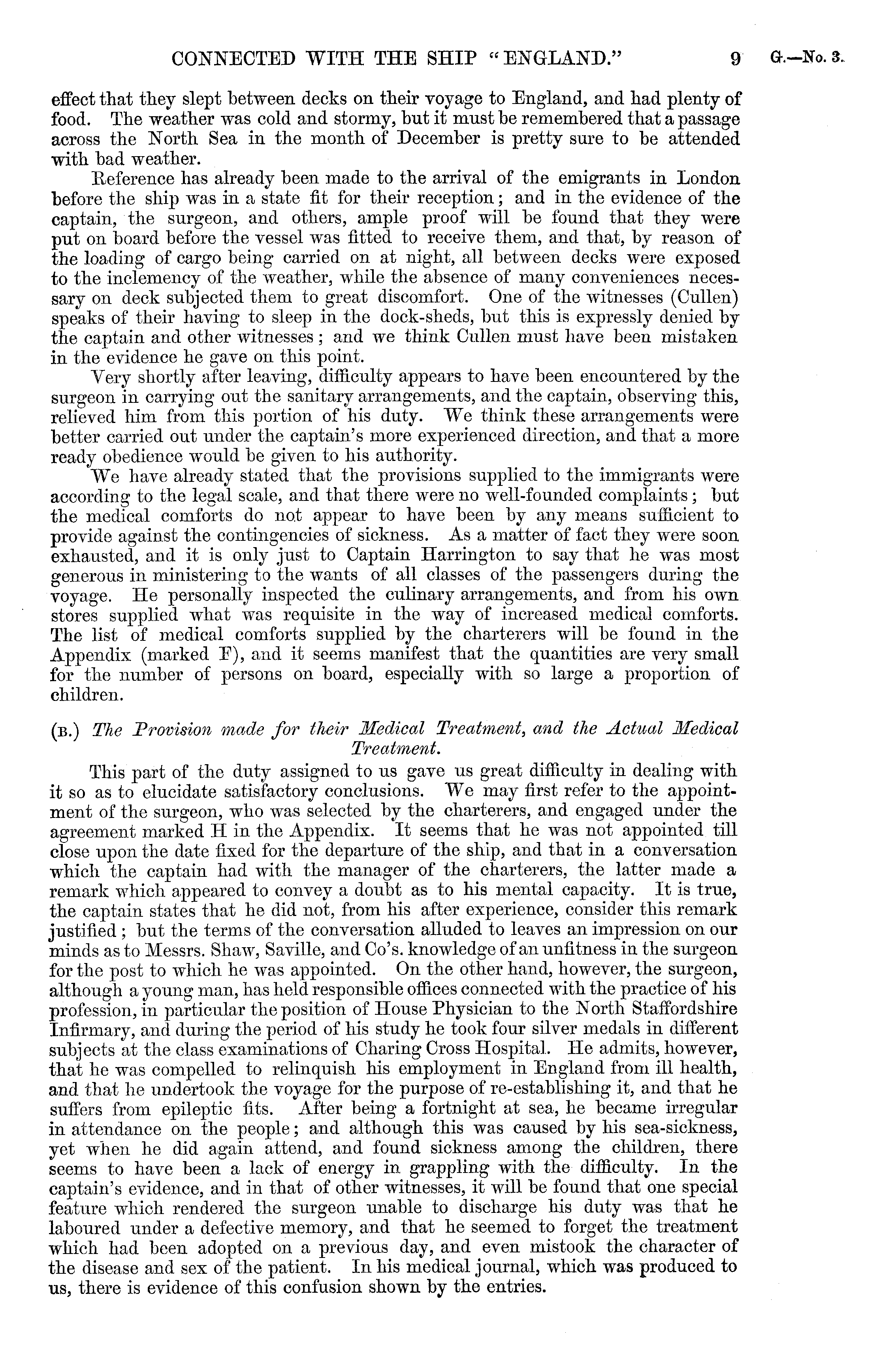 effect that they slept betvf een decks on their voyage to England, and had plenty of food. The weather was cold and stormy, but it must be remembered that a passage across the North Sea in the month of December is pretty sure to be attended with bad weather. Reference has already been made to the arrival of the emigrants in London before the ship was in a state fit for their reception; and in the evidence of the captain, the surgeon, and others, ample proof will be found that they were put on board before the vessel was fitted to receive them, and that, by reason of the loading of cargo being carried on at night, all between decks were exposed to the inclemency of the weather, while the absence of many conveniences necessary on deck subjected them to great discomfort. One of the witnesses (Cullen) speaks of their having to sleep in the dock-sheds, but this is expressly denied by the captain and other witnesses ; and we think Cullen must have been mistaken in the evidence he gave on this point. Very shortly after leaving, difficulty appears to have been encountered by the surgeon in carrying out the sanitary arrangements, and the captain, observing this, relieved him from this portion of his duty. We think these arrangements were better carried out under the captain's more experienced direction, and that a more ready obedience w Tould be given to his authority. We have already stated that the provisions supplied to the immigrants were according to the legal scale, and that there were no well-founded complaints; but the medical comforts do not appear to have been by any means sufficient to provide against the contingencies of sickness. As a matter of fact they were soon exhausted, and it is only just to Captain Harrington to say that he was most generous in ministering to the wants of all classes of the passengers during the voyage. He personally inspected the culinary arrangements, and from his own stores supplied what was requisite in the way of increased medical comforts. The list of medical comforts supplied by the charterers will be found in the Appendix (marked E), and it seems manifest that the quantities are very small for the number of persons on board, especially with so large a proportion of children. (b.) The Provision made for their Medical Treatment, and the Actual Medical Treatment. This part of the duty assigned to us gave us great difficulty in dealing with it so as to elucidate satisfactory conclusions. We may first refer to the appointment of the surgeon, who was selected by the charterers, and engaged under the agreement marked Hin the Appendix. It seems that he was not appointed till close upon the elate fixed for the departure of the ship, and that in a conversation which the captain had with the manager of the charterers, the latter made a remark which appeared to convey a doubt as to his mental capacity. It is true, the captain states that he did not, from his after experience, consider this remark justified ; but the terms of the conversation alluded to leaves an impression on our minds as to Messrs. Shaw, Saville, and Go's, knowledge of an unfitness in the surgeon for the post to which he was appointed. On the other hand, however, the surgeon, although a young man, has held responsible offices connected with the practice of his profession, in particular the position of House Physician to the North Staffordshire Infirmary, and during the period of his study he took four silver medals in different subjects at the class examinations of Charing Cross Hospital. He admits, however, that he was compelled to relinquish his employment in England from ill health, and that he undertook the voyage for the purpose of re-establishing it, and that he suffers from epileptic fits. After being a fortnight at sea, he became irregular in attendance on the people; and although this was caused by his sea-sickness, yet when he did again attend, and found sickness among the children, there seems to have been a lack of energy in grappling with the difficulty. In the captain's evidence, and in that of other witnesses, it will be found that one special feature which rendered the surgeon unable to discharge his duty was that he laboured under a defective memory, and that he seemed to forget the treatment which had been adopted on a previous day, and even mistook the character of the disease and sex of the patient. In his medical journal, which was produced to us, there is evidence of this confusion shown by the entries.