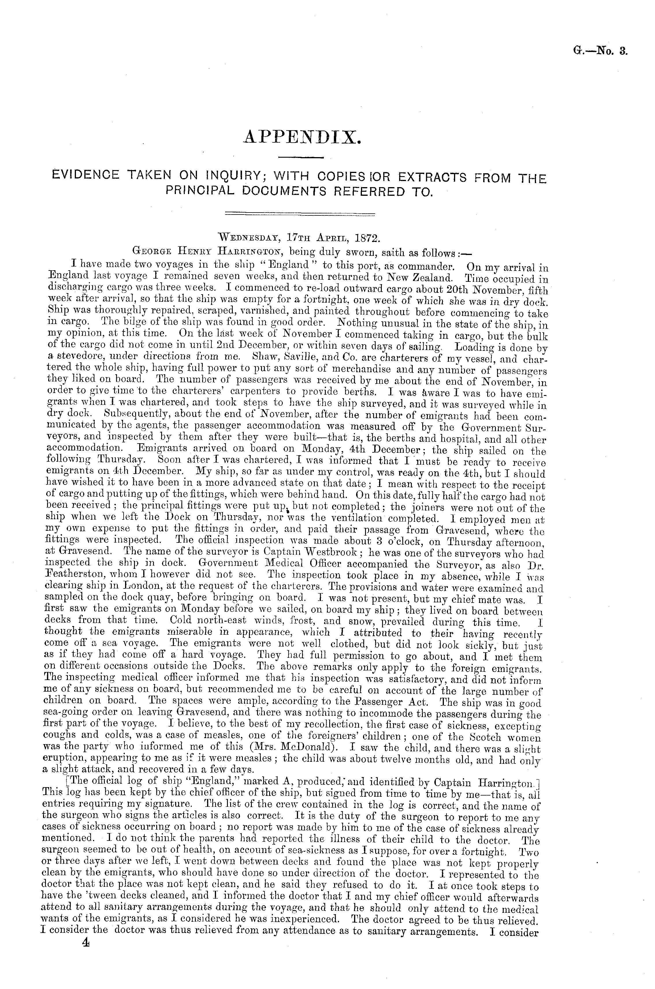 "Wednesday, 17th Apeii, 1872. Geoege Heney. Haeeisgtox, being duly sworn, saith as follows :— I have made two voyages in the ship " England "to this port, as commander. On my arrival in England last voyage I remained seven weeks, and then returned to New Zealand. Time occupied in discharging cargo was three weeks. I commenced to re-load outward cargo about 20th November, fifth week after arrival, so that the ship was empty for a fortnight, one week of which she was in dry'dock. Ship was thoroughly repaired, scraped, varnished, and painted throughout before commencing to take ia cargo. The bilge of the ship was found in good order. Nothing unusual in the state of the ship, in my opinion, at this time. On the last week of November I commenced taking in cargo, but the bulk of the cargo did not come in until 2nd December, or within seven days of sailing. Loading is done by a stevedore, under directions from me. Shaw, Saville, and Co. are charterers of my vessel, and chartered the whole ship, having full power to put any sort of merchandise and any number of'passengers they liked on board. The number of passengers was received by me about the end of November, in order to give time to the charterers' carpenters to provide berths. I was aware I was to have emigrants when I was chartered, and took steps to have the ship surveyed, and it was surveyed while in dry dock. Subsequently, about the end of November, after the number of emigrants had been communicated by the agents, the passenger accommodation was measured off by the Government Surveyors, and inspected by them after they were built—that is, the berths and hospital, and all other accommodation. Emigrants arrived on board on Monday, 4th December; the ship sailed on the following Thursday. Soon after I was chartered, I was informed that I must be ready to receive emigrants on 4th December.^ My ship, so far as under my control, was ready on the 4th, but I should have wished it to have been in a more advanced state on that date; I mean with respect to the receipt of cargo and putting up of the fittings, which were behind hand. On this date, fully half the cargo had not been received ; the principal fittings were put uo- but not completed ; the joiners were not out of the ship when we left the Dock on Thursday, nor was the ventilation completed. 1 employed men at my own expense to put the fittings in order, and paid their passage from Gravesend" where the fittings were inspected. The official inspection was made about 3 o'clock, on Thursday afternoon, at Gravesend. The name of the surveyor is Captain Westbrook ; he was one of the surveyors who had inspected the ship in dock. Government Medical Officer accompanied the Surveyor, as also Dr. Eeatherston, whom I however did not see. The inspection took place in my absence, while I was clearing ship in London, at the request of the charterers. The provisions and water were examined and sampled on the clock quay, before bringing on board. I was not present, but my chief mate was. I first saw the emigrants on Monday before we sailed, on board my ship; they lived on board between decks from that time. Cold north-cast winds, frost, and snow, prevailed during this time. I thought the emigrants miserable in appearance, which I attributed to their having recently come off a sea voyage. The emigrants were not well clothed, but did not look sickly, but just as if they had come off a hard voyage. They hud full permission to go about, and I met them on different occasions outside the Docks. The above remarks only apply to the foreign emigrants. The inspecting medical officer informed me that his inspection was satisfactory, and did not inform me of any sickness on board, but recommended me to bo careful on account of'the large number of children on board. The spaces were ample, according to the Passenger Act. The ship was in good sea-going order on leaving Gravesend, and there was nothing to incommode the passengers during the first part of the voyage. I believe, to the best of my recollection, the first case of sickness, excepting coughs and colds, was a case of measles, one of the foreigners' children; one of the Scotch women was the party who informed me of this (Mrs. McDonald). I saw the child, and there was a slight eruption, appearing to me as if it were measles ; the child was about twelve months old, and had only a slight attack, and recovered in a few days. [The official log of ship "England," marked A, produced,"and identified by Captain Harrington] This log has been kept by the chief officer of the ship, but signed from time to time by me—that is, all entries requiring my signature. The list of the crew contained in the log is correct" and the name of the surgeon who signs the articles is also correct. It is the duty of the surgeon to report to me any casesof sickness occurring on board ; no report was made by him to me of the case of sickness already mentioned. Ido not think the parents had reported the illness of their child to the doctor. The surgeon seemed to be out of health, on account of sea-sickness as I suppose, for over a fortnight. Two or three days after we left, I went down between decks and found the place was not kept properly clean by the emigrants, who should have done so under direction of the doctor. I represented to the doctor that the place was not kept clean, and he said they refused to do it. lat once took steps to have the 'tween decks cleaned, and I informed the doctor that I and my chief officer would afterwards attend to all sanitary arrangements during the voyage, and that he should only attend to the medical wants of the emigrants, as I considered he was inexperienced. The doctor agreed to be thus relieved. I consider the doctor was thus relieved from any attendance as to sanitary arrangements. I. consider 4