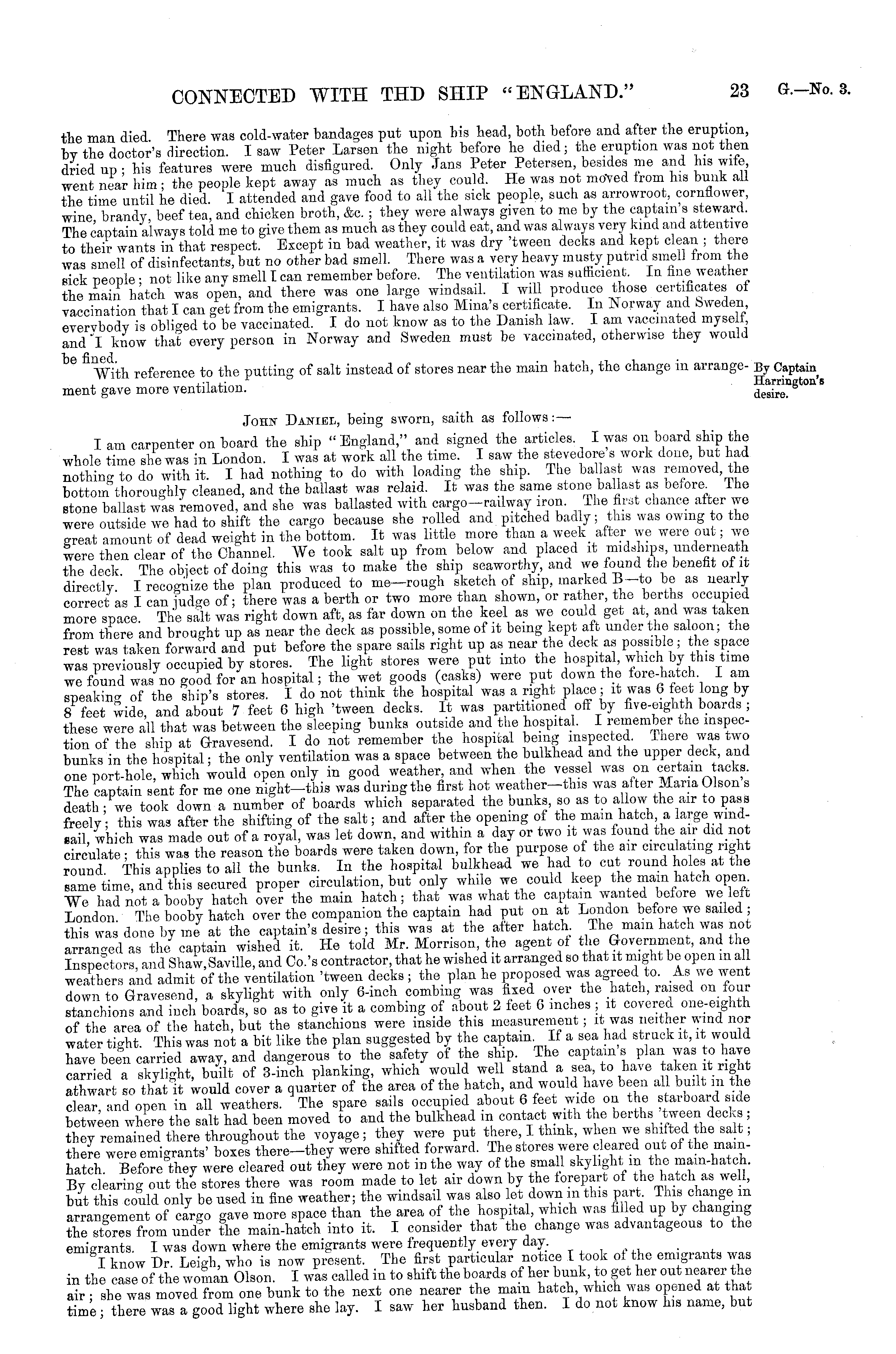 the man died There was cold-water bandages put upon bis head, both before and after the eruption, by the doctor's direction. I saw Peter Larsen the night before he died; the eruption was not then dried up • his features were much disfigured. Only Jans Peter Petersen, besides me and his wife, went near him • the people kept away as much as they could. He was not moved from his bunk all the time until he died. I attended and gave food to all the sick people, such as arrowroot, cornflower, wine brandy, beef tea, and chicken broth, &c. ; they were always given to me by the captain s steward. The captain always told me to give them as much as they could eat, and was always very kind and attentive to their wants in that respect. Except in bad weather, it was dry 'tween decks and kept clean ; there was smell of disinfectants, but no other bad smell. There was a very heavy musty putrid smell from the sick people • not like any smell I can remember before. The ventilation was sufficient. In fine weather the main hatch was open, and there was one large windsail. I will produce those certificates of vaccination that I can get from the emigrants. I have also Mina's certificate. In Norway and Sweden everybody is obliged to be vaccinated. I do not know as to the Danish law. lam vaccinated myse f and "I know that every person in Norway and Sweden must be vaccinated, otherwise they would l-i -fi A With reference to the putting of salt instead of stores near the main hatch, the change in arrange- ; ment gave more ventilation. j Johk Daniel, being sworn, saith as follows:— Tarn carpenter on board the ship " England," and signed the articles. I was on board ship the whole time she was in London. I was at work all the time. I saw the stevedore s work done, but had nothing to do with it. I had nothing to do with loading the ship. The ballast was removed, the bottom thoroughly cleaned, and the ballast was relaid. It was the same stone ballast as before. Tho stone ballast was removed, and she was ballasted with cargo-railway iron. The first chance after we were outside we had to shift the cargo because she rolled and pitched badly; this was owing to the great amount of dead weight in the bottom. It was little more than a week after we were out; we were then clear of the Channel. We took salt up from below and placed it midships, underneath the deck The obiect of doing this was to make the ship seaworthy, and we found the benefit oi it directly I recognize the plan produced to me—rough sketch of ship, marked B-to be as nearly correct as I can fudge of; there was a berth or two more than shown, or rather, the berths occupied more space. The salt was right down aft, as far down on the keel as we could get at and was taken from there and brought up as near the deck as possible, some of it being kept aft under the saloon; the rest was taken forward and put before the spare sails right up as near the deck as possible; the space was previously occupied by stores. The light stores were put into the hospital, which by this time we found was no good for an hospital; the wet goods (casks) were put down the fore-hatch lam speaking of the ship's stores. I do not think the hospital was a right place; it was 6 feet long by 8 feet wide, and about 7 feet 6 high 'tween decks. It was partitioned off by five-eighth boards ; these wore all that was between the sleeping bunks outside and the hospital. I remember the inspection of the ship at Gravesend. Ido not remember the hospital being inspected. I here was two bunks in the hospital; the only ventilation was a space between the bulkhead and the upper deck, and one port-hole, which would open only in good weather, and when the vessel was on certain tacks. The captain sent for me one mght-this was during the first hot weather-this was after Maria Olson s death j we took down a number of boards which separated the bunks, so as to allow the air to pass freely this was after the shifting of the salt; and after the opening of the mam hatch a large windsail, which was made out of a royal, was let down, and within a day or two it was found the air did not circulate • this was the reason the boards were taken down, for the purpose of the air circulating right round This applies to all the bunks. In the hospital bulkhead we had to cut round holes at the same time, and this secured proper circulation, but only while we could keep the main hatch open We had not a booby hatch over the main hatch; that was what the captain wanted before we left London. The booby hatch over the companion the captain had put on at London before we sailed ; this was done by me at the captain's desire; this was at the after hatch. The main hatch was not arranged as the captain wished it. He told Mr. Morrison the agent of the Government, and the Inspectors and Shaw.Saville, and Co.'s contractor, that he wished it arranged so that it might be open m all weathers and admit of the ventilation 'tween decks ; the plan he proposed was agreed to. As we went down to Gravesend, a skylight with only 6-inch combing was fixed over■the hatch, raised on four stanchions and inch boards, so as to give it a combing of about 2 feet 6 inches ; it covered one-eighth of the area of the hatch, but the stanchions were inside this measurement; it was neither wind nor water tight. This was not a bit like the plan suggested by the captain. If a sea had struck it, it would have been carried away, and dangerous to the safety of the ship. The captains plan was to have carried a skylight, built of 3-inch planking, which would well stand a sea, to have taken it right athwart so that it would cover a quarter of the area of the hatch, and would have been all built in the clear, and open in all weathers. The spare sails occupied about 6 feet wide on the starboard side between where the salt had been moved to and the bulkhead in contact with the berths tween decks ; they remained there throughout the voyage; they were put there, I thin