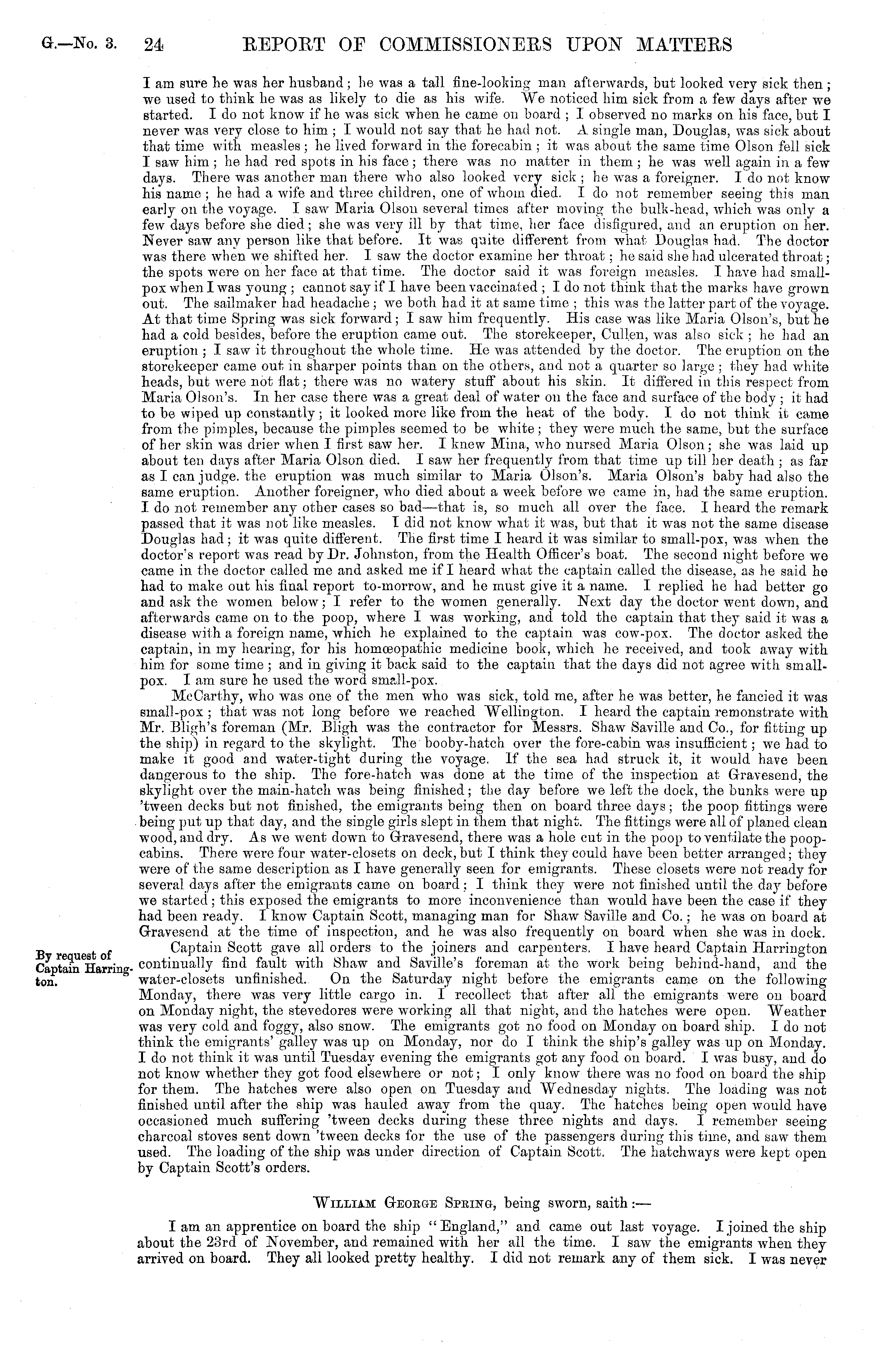 I am sure he was her husband ; he was a tall fine-looking man afterwards, but looked very sick then ; we used to think he was as likely to die as his wife. We noticed him sick from a few days after we started. Ido not know if he was sick when he came on board ; I observed no marks on his face, but I never was very close to him ; I would not say that he had not. A single man, Douglas, was sick about that time with measles ; he lived forward in the forecabin ; it was about the same time Olson fell sick I saw him ; he had red spots in his face; there was no matter in them ; he was well again in a few days. There was another man there who also looked very sick ;he was a foreigner. Ido not know his name ; he had a wife and three children, one of whom died. I do not remember seeing this man early on the voyage. I saw Maria Olson several times after moving the bulk-head, which was only a few days before she died ; she was very ill by that time, her face disfigured, and an eruption on her. Never saw any person like that before. It w ras quite different from what Douglas had. The doctor was there when we shifted her. I saw the doctor examine her throat; he said she had ulcerated throat; the spots were on her face at that time. The doctor said it was foreign measles. I have had smallpox when I was young ; cannot say if I have been vaccinated ; I do not think that the marks have grown out. The sailmaker had headache ; we both had it at same time ; this was the latter part of the voyage. At that time Spring was sick forward ; I saw him frequently. His case was like Maria Olson's, but he had a cold besides, before the eruption came out. The storekeeper, Cullen, was also sick ; he had an eruption ; I saw it throughout the whole time. He was attended by the doctor. The eruption on the storekeeper came out in sharper points than on the others, and not a quarter so large ; they had white heads, but were not flat; there was no watery stuff about his skin. It differed in this respect from Maria Olson's. In her case there was a great deal of water on the face and surface of the body ; it had to be wiped up constantly; it looked more like from the heat of the bod}-. I do not think it came from the pimples, because the pimples seemed to be white; they were much the same, but the surface of her skin was drier when I first saw her. I knew Mina, who nursed Maria Olson; she was laid up about ten days after Maria Olson died. I saw her frequently from that time up till her death ; as far as I can judge, the eruption was much similar to Maria Olson's. Maria Olson's baby had also the same eruption. Another foreigner, who died about a week before we came in, had the same eruption. Ido not remember any other cases so bad —that is, so much all over the face. I heard the remark passed that it was not like measles. I did not know what it was, but that it was not the same disease Douglas had; it was quite different. The first time I heard it was similar to small-pox, was when the doctor's report was read by Dr. Johnston, from the Health Officer's boat. The second night before we came in the doctor called me and asked me if I heard what the captain called the disease, as he said he had to make out his final report to-morrow, and he must give it a name. I replied he had better go and ask the women below; I refer to the women generally. Next day the doctor went down, and afterwards came on to the poop, where I was working, and told the captain that they said it was a disease with a foreign name, which he explained to the captain was cow-pox. The doctor asked the captain, in my hearing, for his homoeopathic medicine book, which he received, and took away with him for some time ; and in giving it back said to the captain that the days did not agree with smallpox. lam sure he used the word small-pox. McCarthy, who was one of the men who was sick, told me, after he was better, he fancied it was small-pox ; that was not long before we reached Wellington. I heard the captain remonstrate with Mr. Bligh's foreman (Mr. Bligh was the contractor for Messrs. Shaw Saville and Co., for fitting up the ship) in regard to the skylight. The booby-hatch over the fore-cabin was insufficient; we had to make it good and water-tight during the voyage. If the sea had struck it, it would have been dangerous to the ship. The fore-hatch was done at the time of the inspection at Gravesend, the skylight over the main-hatch was being finished; the day before we left the dock, the bunks were up 'tween decks but not finished, the emigrants being then on board three days; the poop fittings were being put up that day, and the single girls slept in them that night. The fittings were all of planed clean wood, and dry. As we went down to Gravesend, there was a hole cut in the poop to ventilate the poopcabins. There were four water-closets on deck, but I think they could have been better arranged; they were of the same description as I have generally seen for emigrants. These closets were not ready for several days after the emigrants came on board; I think they were not finished until the day before we started; this exposed the emigrants to more inconvenience than would have been the case if they had been ready. I know Captain Scott, managing man for Shaw Saville and Co.; he was on board at Gravesend at the time of inspection, and he was also frequently on board when she was in dock. Captain Scott gave all orders to the joiners and carpenters. I have heard Captain Harrington continually find fault with Shaw and Saville's foreman at the work being behind-hand, and the water-closets unfinished. On the Saturday night before the emigrants came on the following Monday, there was very little cargo in. I recollect that after all the emigrants were on board on Monday night, the stevedores were working all that night, and the hatches were open. Weather was very cold and foggy, also snow. The emigrants got no food on Monday on board ship. Ido not think the emigrants' ga