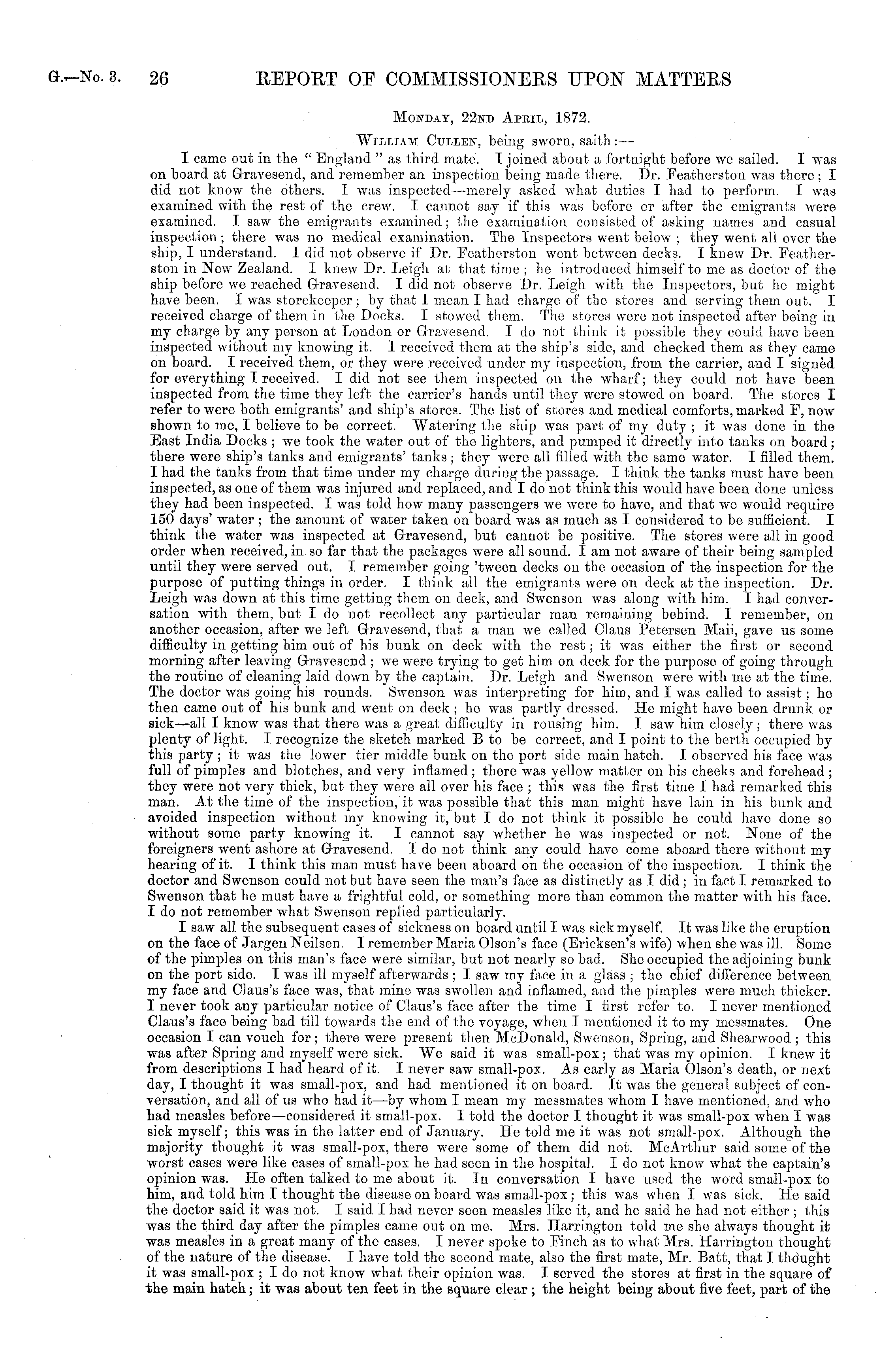 Monday, 22nd April, 1872. William Cullen, being sworn, saith: — I came out in the " England "as third mate. I joined about a fortnight before we sailed. I was on board at Gravesend, and remember an inspection being made there. Dr. Featherston was there ; I did not know the others. I was inspected—merely asked what duties I had to perform. I was examined with the rest of the crew. I cannot say if this was before or after the emigrants were examined. I saw the emigrants examined; the examination consisted of asking names and casual inspection; there was no medical examination. The Inspectors went below ; they went all over the ship, I understand. I did not observe if Dr. Featherston went between decks. I knew Dr. Featherston in New Zealand. I knew Dr. Leigh at that time ;he introduced himself to me as doctor of the ship before we reached Gravesend. I did not observe Dr. Leigh with the Inspectors, but he might have been. I was storekeeper ; by that I mean I had charge of the stores and serving them out. I received charge of them in the Docks. I stowed them. The stores were not inspected after being in my charge by any person at London or Gravesend. I do not think it possible they could have been inspected without my knowing it. I received them at the ship's side, and checked them as they came on board. I received them, or they were received under my inspection, from the carrier, aud I signed for everything I received. I did not see them inspected on the wharf; they could not have been inspected from the time they left the carrier's hands until they were stowed on board. The stores I refer to were both emigrants' and ship's stores. The list of stores and medical comforts, marked F, now shown to me, I believe to be correct. Watering the ship was part of my duty; it was done in the East India Docks ; we took the water out of the lighters, and pumped it directly into tanks on board; there were ship's tanks and emigrants' tanks; they were all filled with the same water. I filled them. I had the tanks from that time under my charge during the passage. I think the tanks must have been inspected, as one of them was injured and replaced, and I do not think this would have been done unless they had been inspected. I was told how many passengers we were to have, and that we would require 150 days' water ; the amount of water taken on board was as much as I considered to be sufficient. I think the water was inspected at Gravesend, but cannot be positive. The stores were all in good order when received, in so far that the packages were all sound. I am not aware of their being sampled until they were served out. I remember going 'tween decks on the occasion of the inspection for the purpose of putting things in order. I think all the emigrants were on deck at the inspection. Dr. Leigh was down at this time getting them on deck, and Swenson was along with him. I had conversation with them, but I do not recollect any particular man remaining behind. I remember, on another occasion, after we left Gravesend, that a man we called Claus Petersen Maii, gave us some difficulty in getting him out of his bunk on deck with the rest; it was either the first or second morning after leaving Gravesend ; we were trying to got him on deck for the purpose of going through the routine of cleaning laid down by the captain. Dr. Leigh and Swenson were with me at the time. The doctor was going his rounds. Swenson was interpreting for him, and I was called to assist; he then came out of his bunk and went on deck ;he was partly dressed. He might have been drunk or sick—all I know was that there was a great difficulty in rousing him. I saw him closely ; there was plenty of light. I recognize the sketch marked Bto be correct, and I point to the berth occupied by this party ; it was the lower tier middle bunk on the port side main hatch. I observed bis face was full of pimples and blotches, and very inflamed ; there was yellow matter on his cheeks and forehead ; they were not very thick, but they were all over his face ; this was the first time I had remarked this man. At the time of the inspection, it was possible that this man might have lain in his bunk and avoided inspection without my knowing it, but I do not think it possible he could have done so without some party knowing it. I cannot say whether he was inspected or not. None of the foreigners went ashore at Gravesend. Ido not think any could have come aboard there without my hearing of it. I think this man must have been aboard on the occasion of the inspection. I think the doctor and Swenson could not but have seen the man's face as distinctly as I did; in fact I remarked to Swenson that he must have a frightful cold, or something more than common the matter with his face. I do not remember what Swenson replied particularly. I saw all the subsequent cases of sickness on board until I was sick myself. It was like the eruption on the face of Jargen Neilsen. I remember Maria Olson's face (Ericksen's wife) when she was ill. Some of the pimples on this man's face were similar, but not nearly so bad. She occupied the adjoining bunk on the port side. I was ill myself afterwards ; I saw my face in a glass ; the chief difference between my face and Claus's face was, that mine was swollen and inflamed, and the pimples were much thicker. I never took any particular notice of Claus's face after the time I first refer to. I never mentioned Claus's face being bad till towards the end of the voyage, when I mentioned it to my messmates. One occasion I can vouch for; there were present then McDonald, Swenson, Spring, and Shearwood; this was after Spring and myself were sick. We said it was small-pox ; that was my opinion. I knew it from descriptions I had heard of it. I never saw small-pox. As early as Maria Olson's death, or next day, I thought it was small-pox, and had mentioned it on board. It was the general subject of conversation, and all of us who had it—by whom I mean my m