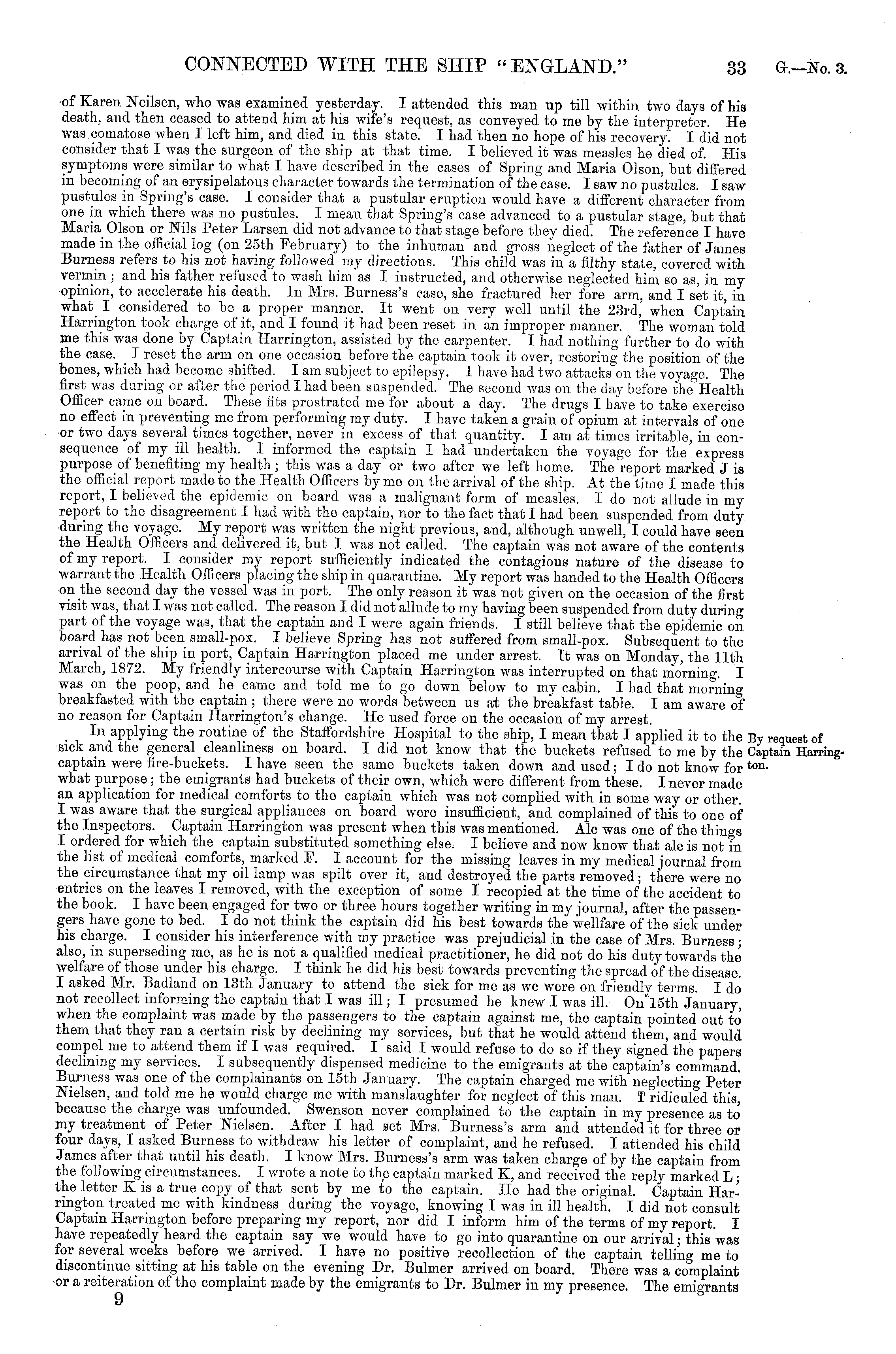 of Karen Neilsen, who was examined yesterday. I attended this man up till within two days of his death, and then ceased to attend him at his wife's request, as conveyed to me by the interpreter. He was.comatose when I left him, and died in this state. I had then no hope of his recovery. I did not consider that I was the surgeon of the ship at that time. I believed it was measles he died of. His symptoms were similar to what I have described in the cases of Spring and Maria Olson, but differed in becoming of an erysipelatous character towards the termination of the case. I saw no pustules. I saw pustules in Spring's case. I consider that a pustular eruption would have a different character from one in which there was no pustules. I mean that Spring's case advanced to a pustular stage, but that Maria Olson or Nils Peter Larsen did not advance to that stage before they died. The reference I have made in the official log (on 25th February) to the inhuman and gross neglect of the father of James Burness refers to his not having followed my directions. This child was in a filthy state, covered with vermin ; and his father refused to wash him as I instructed, and otherwise neglected him so as, in my opinion, to accelerate his death. In Mrs. Burness's case, she fractured her fore arm, and I set it, in what^ I considered to be a proper manner. It went on very well until the 23rd, when Captain Harrington took charge of it, and I found it had been reset in an improper manner. The woman told me this was done by Captain Harrington, assisted by the carpenter. I had nothing further to do with the case. _ I reset the arm on one occasion before the captain took it over, restoring the position of the bones, which had become shifted. lam subject to epilepsy. I have had two attacks on the voyage. The first was during or after the period I had been suspended. The second was on the day before the Health Officer came on board. These fits prostrated me for about a day. The drugs I have to take exercise no effect in preventing me from performing my duty. I have taken a grain of opium at intervals of one or two days several times together, never in excess of that quantity. lam at times irritable, in consequence of my ill health. I informed the captain I had undertaken the voyage for the'express purpose of benefiting my health ; this was a day or two after we left home. The report marked Jis the official report made to the Health Officers by me on the arrival of the ship. At the time I made this report, I believed the epidemic on board was a malignant form of measles. I do not allude in my report to the disagreement I had with the captain, nor to the fact that I had been suspended from duty during the voyage. My report was written the night previous, and, although unwell, I could have seen the Health Officers and delivered it, but I was not called. The captain was not aware of the contents of my report. I consider my report sufficiently indicated the contagious nature of the disease to warrant the Health Officers placing the ship in quarantine. My report was handed to the Health Officers on the second day the vessel was in port. The only reason it'was not given on the occasion of the first visit was, that I was not called. The reason I did not allude to my having been suspended from duty during part of the voyage was, that the captain and I were again friends. I still believe that the epidemic on board has not been small-pox. I believe Spring has not suffered from small-pox. Subsequent to the arrival of the ship in port, Captain Harrington placed me under arrest. It was on Monday, the 11th March, 1872. My friendly intercourse with Captain Harrington was interrupted on that morning. I was on the poop, and he came and told me to go down below to my cabin. I had that morning breakfasted with the captain ; there were no words between us at the breakfast table. lam aware of no reason for Captain Harrington's change. He used force on the occasion of my arrest. In applying the routine of the Staffordshire Hospital to the ship, I mean that I applied it to the sick and the general cleanliness on board. I did not know that the buckets refused to me by the captain were fire-buckets. I have seen the same buckets taken down and used; Ido not know for what purpose ; the emigrants had buckets of their own, which were different from these. I never made an application for medical comforts to the captain which was not complied with in some way or other. I was aware that the surgical appliances on board were insufficient, and complained of this to one of the Inspectors. Captain Harrington was present when this was mentioned. Ale was one of the things I ordered for which the captain substituted something else. I believe and now know that ale is not in the list of medical comforts, marked F. I account for the missing leaves in my medical journal from the circumstance that my oil lamp was spilt over it, and destroyed the parts removed; there were no entries on the leaves I removed, with the exception of some I recopied at the time of the accident to the book. I have been engaged for two or three hours together writing in my journal, after the passengers have gone to bed. Ido not think the captain did his best towards the wellfare of the sick under his charge. I consider his interference with my practice was prejudicial in the case of Mrs. Burness; also, in superseding me, as he is not a qualified medical practitioner, he did not do his duty towards the welfare of those under his charge. I think he did his best towards preventing the spread of the disease. I asked Mr. Badland on 13th January to attend the sick for me as we were on friendly terms. Ido not recollect informing the captain that I was ill; I presumed he knew I was ill. On 15th January, when the complaint was made by the passengers to the captain against me, the captain pointed out to them that they ran a certain risk by declining my services, but that he would attend them, a