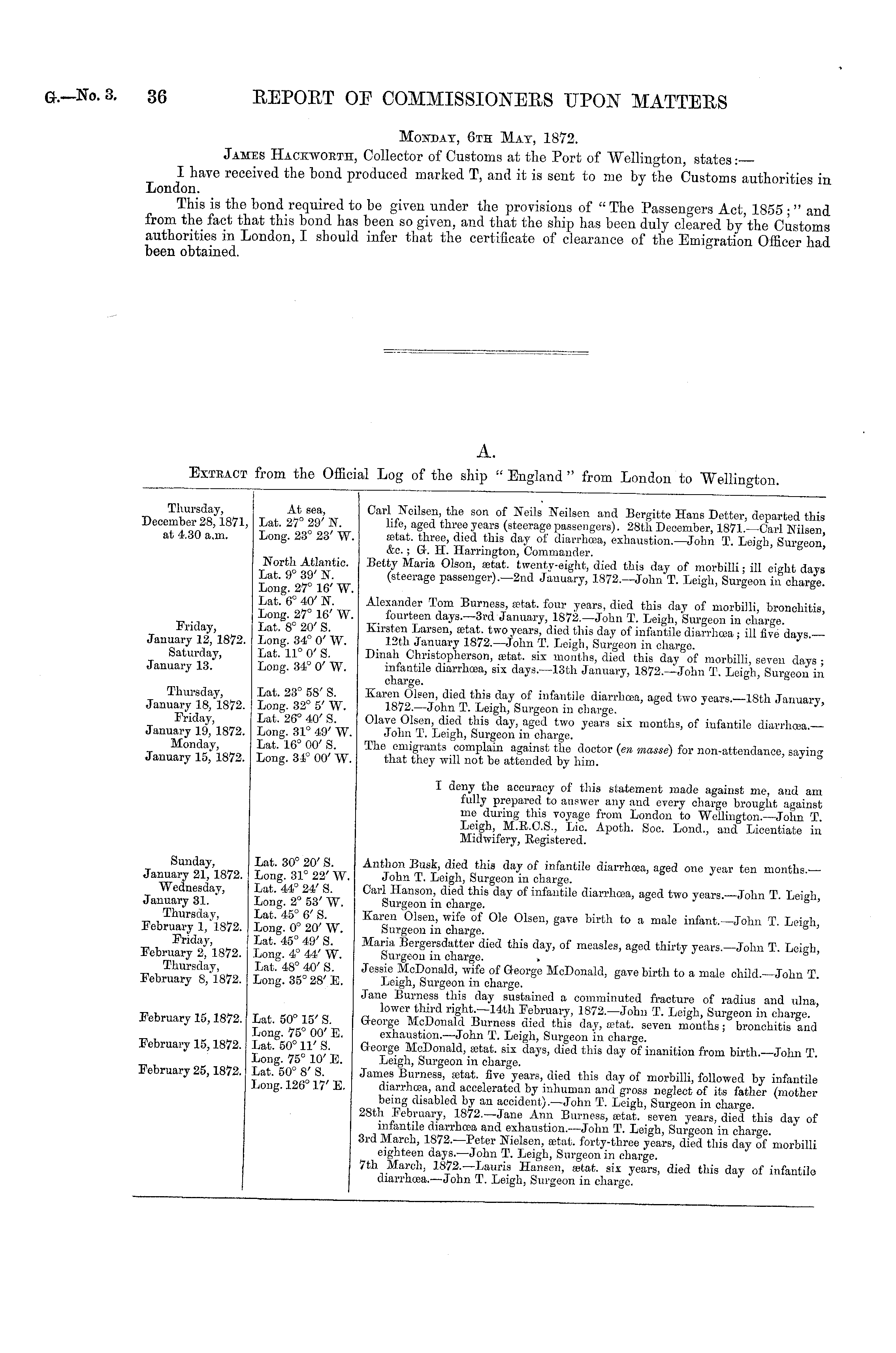Thursday, December 28,1871, at 4.30 a.m. At sea, Lat. 27° 29' N. Long. 23° 23' W. Carl Neilsen, the son of Neils Neilsen and Bergitte Hans Detter, departed this hie, aged three years (steerage passengers). 28th December, 1871.—Carl Nilsen setat. three, died this day of diarrhoea, exhaustion.—John T. Leigh, Surgeon' &e.; G. H. Harrington, Commander. ' Betty Maria Olson, astat. twenty-eight, died this day of morbilli; ill eight days (steerage passenger).—2nd January, 1872.—John T. Leigh, Surgeon in charge. Eriday, January 12, 1872. Saturday, January 13. North Atlantic. Lat. 9° 39' N. Long. 27° 16' W. Lat. 6° 40' N. Long. 27° 16' W. Lat. 8° 20' S. Long. 34° 0' W. Lat. 11° 0' S. Long. 34° 0' W. Alexander Tom Burness, setat; four years, died this day of morbilli, bronchitis fourteen days.—3rd January, 1872.—John T. Leigh, Surgeon in charge. Kirsten Larsen, setat. two years, died this day of infantile diarrhoea; ill five days — 12th January 1872.—John T. Leigh, Surgeon in charge. Dinah Christopherson, astat. six months, died this day of morbilli, seven days - infantile diarrhoea, six days.—13th January, 1872.—John T. Leigh, Surgeon in charge. Karen Olsen, died this day of infantile diarrhoea, aged two years.—18th January 1872. —John T. Leigh, Surgeon in charge. Olave Olsen, died this day, aged two years six months, of infantile diarrhoea.— John T. Leigh, Surgeon in charge. The emigrants complain against the doctor (era masse) for non-attendance, saying that they will not be attended by him. Thursday, January 18, 1872. Eriday, January 19, 1872. Monday, January 15, 1872. Lat. 23° 58' S. Long. 32° 5' W. Lat. 26° 40' S. Long. 31° 49' W. Lat. 16° 00' S. Long. 34° 00' W. Sunday, January 21, 1872. Wednesday, January 31. Thursday, February 1, 1872. Friday, February 2, 1872. Thursday, February 8, 1872. Lat. 30° 20' S. Long. 31° 22' W. Lat. 44° 24' S. Long. 2° 53' W. Lat. 45° 6' S. Long. 0° 20' W. Lat. 45° 49' S. Long. 4° 44' W. Lat. 48° 40' S. Long. 35° 28'E. I deny the accuracy of this statement made against me, and am fully prepared to answer any and every charge brought against me during this voyage from London to Wellington.—John T. Leigh, M.R.C.S., Lie. Apoth. Soc. Lond., and Licentiate in Midwifery, Registered. February 15,1872. Lat. 50° 15' S. Long. 75° 00' E. Lat. 50° 11' S. Long. 75° 10' E. Lat. 50° 8' S. Long. 126° 17' E. Anthon Busk, died this day of infantile diarrhoea, aged one year ten months.— John T. Leigh, Surgeon in charge. Carl Hanson, died this day of infantile diarrhoea, aged two years.-—John T. Leigh Surgeon in charge. ' Karen Olsen, wife of Ole Olsen, gave birth to a male infant.—John T. Leigh, Surgeon in charge. Maria Bergersdatter died this day, of measles, aged thirty years.—John T. T JO igh Surgeon in charge. . ' Jessie McDonald, wife of George McDonald, gave birth to a male child.—John T Leigh, Surgeon in charge. Jane Burness this day sustained a comminuted fracture of radius and ulna lower third right.—14th February, 1872.—John T. Leigh, Surgeon in charge. George McDonald Burness died this day, tetat. seven months; bronchitis and exhaustion.—John T. Leigh, Surgeon in charge. George McDonald, setat. six days, died this clay of inanition from birth.—John T Leigh, Surgeon in charge. James Burness, setat. five years, died this day of morbilli, followed by infantile diarrhoea, and accelerated by inhuman and gross neglect of its father (mother being disabled by an accident).—John T. Leigh, Surgeon in charge. 28th February, 1872.—Jane Ann Burness, setat. seven years, died this day of infantile diarrhoea and exhaustion.—John T. Leigh, Surgeon in charge 3rd March, 1872.—Peter Nielsen, setat. forty-three years, died this day of morbilli eighteen days.—John T. Leigh, Surgeon in charge. 7th March, 1872—Lauris Hansen, setat. six years, died this day of infantile diarrhoea.—John T. Leigh, Surgeon in charge. February 15,1872. February 25,1872.