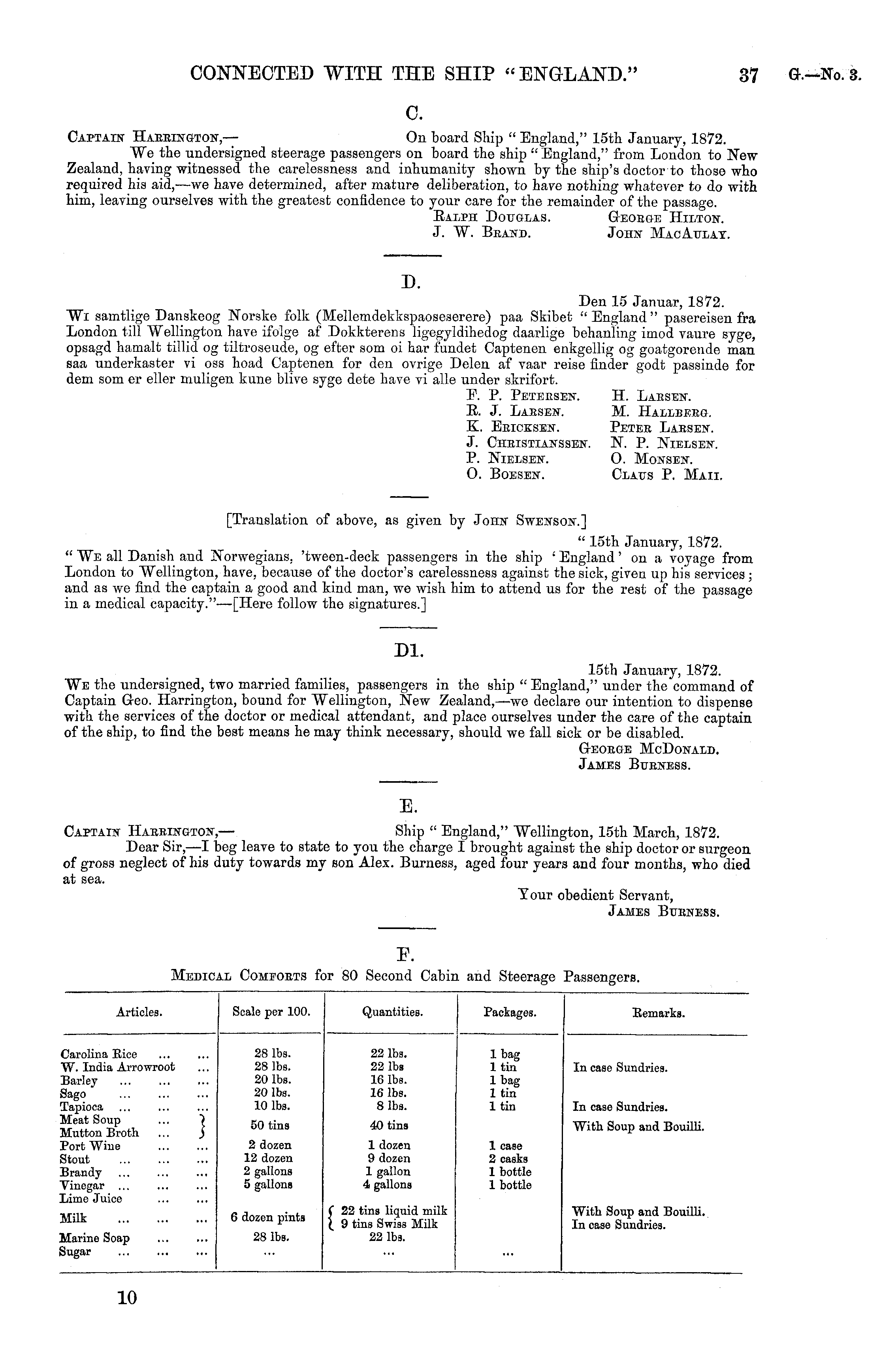 c. Captain Harrington,— On board Ship " England," 15th January, 1872. We the undersigned steerage passengers on board the ship " England," from London to New Zealand, having witnessed the carelessness and inhumanity shown by the ship's doctor to those who required his aid, —we have determined, after mature deliberation, to have nothing whatever to do with him, leaving ourselves with the greatest confidence to your care for the remainder of the passage. Ealph Douglas. Geoege Hilton. J. W. Brand. John MacAulay.