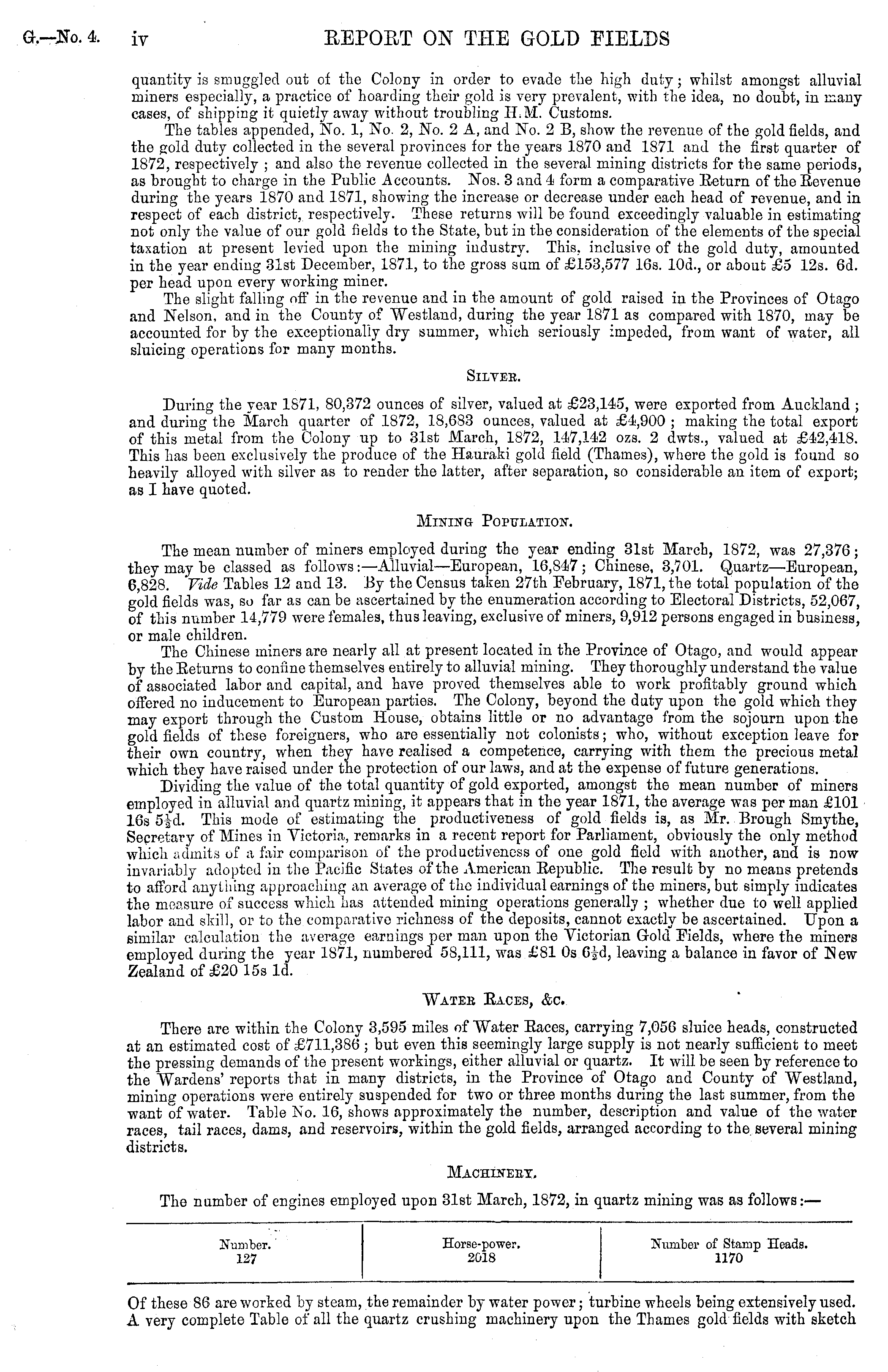 quantity is smuggled out of the Colony in order to evade the high duty; whilst amongst alluvial miners especially, a practice of hoarding their gold is very prevalent, with the idea, no doubt, in many cases, of shipping it quietly away without troubling II.M. Customs. The tables appended, No. 1, No. 2, No. 2 A, and No. 2 B, show the revenue of the gold fields, and the gold duty collected in the several provinces for the years 1870 and 1871 and the first quarter of 1872, respectively ; and also the revenue collected in the several mining districts for the same periods, as brought to charge in the Public Accounts. Nos. 3 and 4 form a comparative Eeturn of the Eevenue during the years 1870 and 1871, showing the increase or decrease under each head of revenue, and in respect of each district, respectively. These returns will be found exceedingly valuable in estimating not only the value of our gold fields to the State, but in the consideration of the elements of the special taxation at present levied upon the mining industry. This, inclusive of the gold duty, amounted in the year ending 31st December, 1871, to the gross sum of £153,577 16s. 10d., or about £5 12s. 6d. per head upon every working miner. The slight falling off in the revenue and in tho amount of gold raised in the Provinces of Otago and Nelson, and in the County of Westland, during the year 1871 as compared with 1870, may be accounted for by the exceptionally dry summer, which seriously impeded, from want of water, all sluicing operations for many months. Silver. During the year 1871, 80,372 ounces of silver, valued at £23,145, were exported from Auckland ; and during the March quarter of 1872, 18,683 ounces, valued at £4,900 ; making the total export of this metal from the Colony up to 31st March, 1872, 147,142 ozs. 2 dwts., valued at £42,418. This has been exclusively the produce of the Hauraki gold field (Thames), where the gold is found so heavily alloyed with silver as to render the latter, after separation, so considerable an item of export; as I have quoted. Mining Population. The mean number of miners employed during the year ending 31st March, 1872, was 27,376; they may be classed as follows:— Alluvial —European, 16,847 ; Chinese, 3,701. Quartz —European, 6,828. Vide Tables 12 and 13. By the Census taken 27th February, 1871, the total population of the gold fields was, so far as can be ascertained by the enumeration according to Electoral Districts, 52,067, of this number 14,779 were females, thus leaving, exclusive of miners, 9,912 persons engaged in business, or male children. The Chinese miners are nearly all at present located in the Province of Otago, and would appear by the Eeturns to confine themselves entirely to alluvial mining. They thoroughly understand the value of associated labor and capital, and have proved themselves able to work profitably ground which offered no inducement to European parties. The Colony, beyond the duty upon the gold which they may export through the Custom House, obtains little or no advantage from the sojourn upon the gold fields of these foreigners, who are essentially not colonists; who, without exception leave for their own country, when they have realised a competence, carrying with them the precious metal which they have raised under the protection of our laws, and at the expense of future generations. Dividing the value of the total quantity of gold exported, amongst the mean number of miners employed in alluvial and quartz mining, it appears that in the year 1871, the average was per man £101 16s sid. This mode of estimating the productiveness of gold fields is, as Mr. Brough Smythe, Secretary of Mines in Victoria, remarks in a recent report for Parliament, obviously the only method which admits of a fair comparison of the productiveness of one gold field with another, and is now invariably adopted in the Pacific States of the American Eepublic. The result by no means pretends to afford anything approaching an average of the individual earnings of the miners, but simply indicates the measure of success which has attended mining operations generally ; whether due to well applied labor and skill, or to the comparative richness of the deposits, cannot exactly be ascertained. TJpon a similar calculation the average earnings per man upon the Victorian Gold Fields, where tho miners employed during the year 1871, numbered 58,111, was £81 0s 6|d, leaving a balance in favor of New Zealand of £20 15s Id. Water Eaces, &c. There are within the Colony 3,595 miles of Water Eaces, carrying 7,056 sluice heads, constructed at an estimated cost of £711,386 ; but even this seemingly large supply is not nearly sufficient to meet the pressing demands of the present workings, either alluvial or quartz. It will be seen by reference to the Wardens' reports that in many districts, in the Province of Otago and County of Westland, mining operations were entirely suspended for two or three months during the last summer, from the want of water. Table Ko. 16, shows approximately the number, description and value of the water races, tail races, dams, and reservoirs, within the gold fields, arranged according to the. several mining districts.