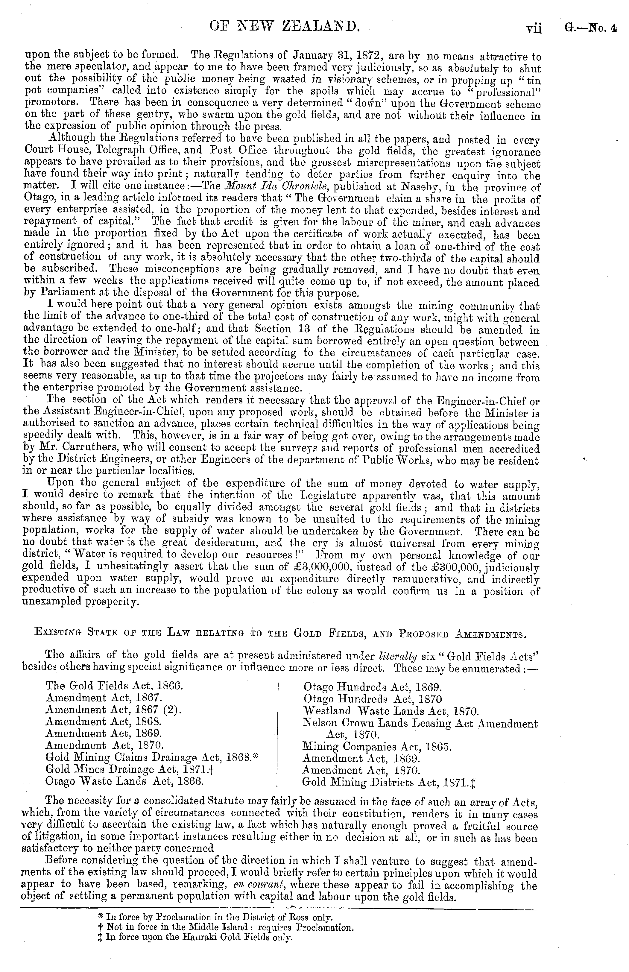 upon the subject to be formed. The Eegulations of January 31, 1872, are by no means attractive to the mere speculator, and appear to me to have been framed very judiciously, so as absolutely to shut out the possibility of the public money being wasted in visionary schemes, or in propping up " tin pot companies" called into existence simply for the spoils which may accrue to " professional" promoters. There has been in consequence a very determined " down" upon the Government scheme on the part of these gentry, who swarm upon the gold fields, and are not without their influence in the expression of public opinion through the press. Although the Eegulations referred to have been published in all the papers, and posted in every Court House, Telegraph Office, and Post Office throughout the gold fields, the greatest ignorance appears to have prevailed as to their provisions, and the grossest misrepresentations upon the subject have found their way into print; naturally tending to deter parties from further enquiry into the matter. I will cite one instance : —The Mount Ida Chronicle, published at Naseby, in the province of Otago, in a leading article informed its readers that " The Government claim a share in the profits of every enterprise assisted, in the proportion of the money lent to that expended, besides interest and repayment of capital." The fact that credit is given for the labour of the miner, and cash advances made in _ the proportion fixed by the Act upon the certificate of work actually executed, has been entirely ignored ; and it has been represented that in order to obtain a loan of one-third of the cost of construction of any work, it is absolutely necessary that the other two-thirds of the capital should be subscribed. These misconceptions are being gradually removed, and I have no doubt that even within a few weeks the applications received will quite come up to, if not exceed, the amount placed by Parliament at the disposal of the Government for this purpose. I would here point out that a very general opinion exists amongst the mining community that the limit of the advance to one-third of the total cost of construction of any work, might with general advantage be extended to one-half; and that Section 13 of the Eegulations should be amended in the direction of leaving the repayment of the capital sum borrowed entirely an open question between the borrower and the Minister, to be settled according to the circumstances of each particular case. It has also been suggested that no interest should accrue until tho completion of the works; and this seems very reasonable, as up to that time the projectors may fairly be assumed to have no income from the enterprise promoted by the Government assistance. The section of the Act which renders it necessary that the approval of the Engineer-in-Chief or the Assistant Engineer-in-Chief, upon any proposed work, should bo obtained before the Minister is authorised to sanction an advance, places certain technical difficulties in the way of applications being speedily dealt with. This, however, is in a fair way of being got over, owing to the arrangements made by Mr. Carruthers, who will consent to accept the surveys and reports of professional men accredited by the District Engineers, or other Engineers of the department of Bublic Works, who may be resident in or near the particular localities. Upon the general subject of the expenditure of the sum of money devoted to water supply, I would desire to remark that tho intention of the Legislature apparently was, that this amount should, so^far as possible, be equally divided amongst the several gold fields ; and that in districts where assistance by way of subsidy was known to be unsuited to the requirements of the mining population, works for the supply of water should be undertaken by the Government. There can be no doubt that water is the great desideratum, and the cry is almost universal from every mining district, " Water is required to develop our resources!" From my own personal knowledge of our gold fields, I unhesitatingly assert that the sum of £3,000,000, instead of the £300,000, judiciously expended upon water supply, would prove an expenditure directly remunerative, and indirectly productive of such an increase to the population of the colony as would confirm us in a position of unexampled prosperity. Existing State op the Law relating to the Gold Fields, and Proposed Amendments. _ The affairs of the gold fields are at present administered under literally six " Gold Fields Acts'' besides others having special significance or influence more or less direct. These may be enumerated :— The Gold Fields Act, 1866. Otago Hundreds Act, 1869. Amendment Act, 1867. Otago Hundreds Act, 1870 Amendment Act, 1867 (2). Westland Waste Lands Act, 1870. Amendment Act, 1868. Nelson Crown Lands Leasing Act Amendment Amendment Act, 1869. Act, 1870. Amendment Act, 1870. Mining Companies Act, 1805. Gold Mining Claims Drainage Act, 1865.* Amendment Act, 1869. Gold Mines Drainage Act, 1871.+ Amendment Act, 1870. Otago Waste Lands Act, 1866. Gold Mining Districts Act, 1871.J The necessity for a consolidated Statute may fairly be assumed in the face of such an array of Acts, which, from the variety of circumstances connected with their constitution, renders it in many cases very difficult to ascertain the existing law, a fact which has naturally enough proved a fruitful source of litigation, in some important instances resulting either in no decision at all, or in such as has been satisfactory to neither party concerned Before considering the question of the direction in which I shall venture to suggest that amendments of the existing law should proceed, I would briefly refer to certain principles upon which it would appear to have been based, remarking, en courant, where these appear to fail in accomplishing the object of settling a permanent population with capital and labour upon the gold fields. * I