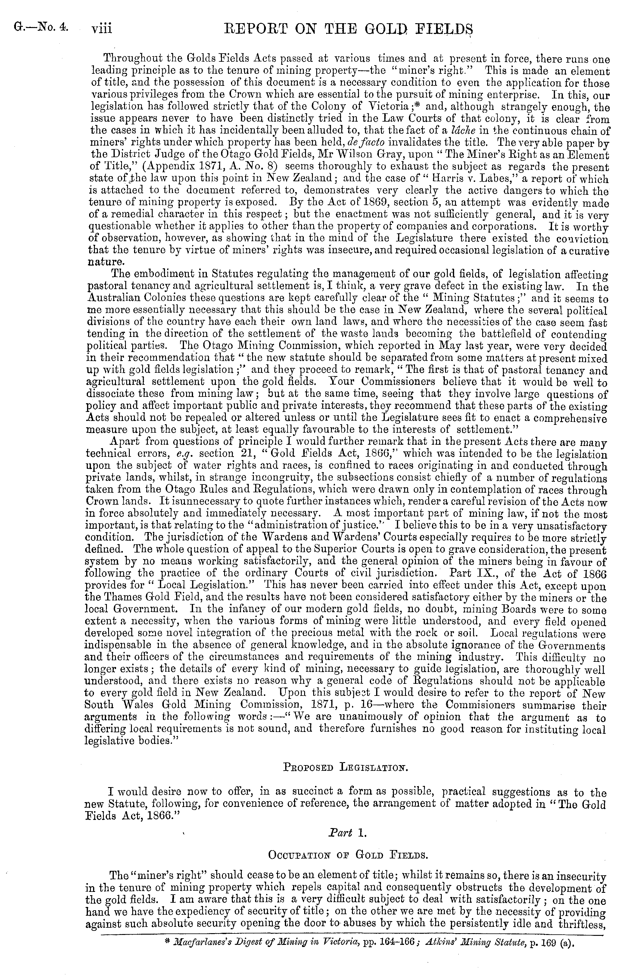 Throughout the Golds Fields Acts passed at various times and at present in force, there runs one leading principle as to the tenure of mining property —the "miner's right." This is made an element of title, and the possession of this document is a necessary condition to even the application for those various privileges from the Crown which are essential to the pursuit of mining enterprise. In this, our legislation has followed strictly that of the Colony of Victoria ;* and, although strangely enough, the issue appears never to have been distinctly tried in the Law Courts of that colony, it is clear from the cases in which it has incidentally been alluded to, that the fact of a lache in the continuous chain of miners' rights under which property has been held, de facto invalidates the title. The very able paper by the District Judge of the Otago Gold Fields, Mr Wilson Gray, upon " The Miner's Eight as an Element of Title," (Appendix 1871, A. No. 8) seems thoroughly to exhaust the subject as regards the present state of Ihe law upon this point in New Zealand ; and the case of " Harris v. Labes," a report of which is attached to the document referred to, demonstrates very clearly the active dangers to which the tenure of mining property is exposed. By the Act of 1569, section 5, an attempt was evidently made of a remedial character in this respect; but the enactment was not sufficiently general, and it is very r questionable whether it applies to other than the property of companies and corporations. It is worthy of observation, however, as showing that in the mind of the Legislature there existed the conviction that the tenure by virtue of miners' rights was insecure, and required occasional legislation of a curative nature. The embodiment in Statutes regulating the management of our gold fields, of legislation affecting pastoral tenancy and agricultural settlement is, I think, a very grave defect in the existing law. In the Australian Colonies these questions are kept carefully clear of the " Mining Statutes;" and it seems to me more essentially necessary that this should be the case in New Zealand, where the several political divisions of the country have each their own land laws, and where the necessities of the case seem fast tending in the direction of the settlement of the waste lands becoming the battlefield of contending political parties. The Otago Mining Commission, which reported in May last year, were very decided, in their recommendation that " the new statute should be separated from some matters at present mixed up with gold fields legislation ;" and they proceed to remark, " The first is that of pastoral tenancy and agricultural settlement upon the gold fields. Tour Commissioners believe that it would be well to dissociate these from mining law; but at the same time, seeing that they involve large questions of policy and affect important public and private interests, they recommend that these parts of the existing Acts should not be repealed or altered unless or until the Legislature sees fit to enact a comprehensive measure upon the subject, at least equally favourable to the interests of settlement." Apart from questions of principle I would further remark that in the present Acts there are many technical errors, e.g. section 21, " Gold Fields Act, 1866," which was intended to be the legislation upon the subject of water rights and races, is confined to races originating in and conducted through private lands, whilst, in strange incongruity, the subsections consist chiefly of a number of regulations taken from the Otago Eules and Eegulations, which were drawn only in contemplation of races through Crown lands. It isunnecessary to quote further instances which, render a careful revision of the Acts now in force absolutely and immediately necessary. A most important part of mining law, if not the most important, is that relating to the "administration of justice." I believe this to be in a very unsatisfactory condition. The jurisdiction of the Wardens and Wardens' Courts especially requires to be more strictly defined. The whole question of appeal to the Superior Courts is open to grave consideration, the present system by no means working satisfactorily, and the general opinion of the miners being in favour of following the practice of the ordinary Courts of civil jurisdiction. Part IX., of the Act of 1866 provides for " Local Legislation." This has never been carried into effect under this Act, except upon the Thames Gold Field, and the results have not been considered satisfactory either by the miners or the local Government. In the infancy of our modern gold fields, no doubt, mining Boards were to some extent a necessity, when the various forms of mining were little understood, and every field opened developed some novel integration of the precious metal with the rock or soil. Local regulations were indispensable in the absence of general knowledge, and in the absolute ignorance of the Governments and their officers of tho circumstances and requirements of the mining industry. This difficulty no longer exists ; the details of every kind of mining, necessary to guide legislation, are thoroughly well understood, and there exists no reason why a general code of Eegulations should not be applicable to every gold field in New Zealand. Upon this subjest I would desire to refer to the report of New South Wales Gold Mining Commission, 1871, p. 16—where the Commisioners summarise their arguments in the following words: —"We are unanimously of opinion that the argument as to differing focal requirements is not sound, and therefore furnishes no good reason for instituting local legislative bodies." Broposed Legislation. I would desire now to offer, in as succinct a form as possible, practical suggestions as to the new Statute, following, for convenience of reference, the arrangement of matter adopted in " The Gold Fields Act, 1866." v Part 1. Occupation oe Gold Fields. The "