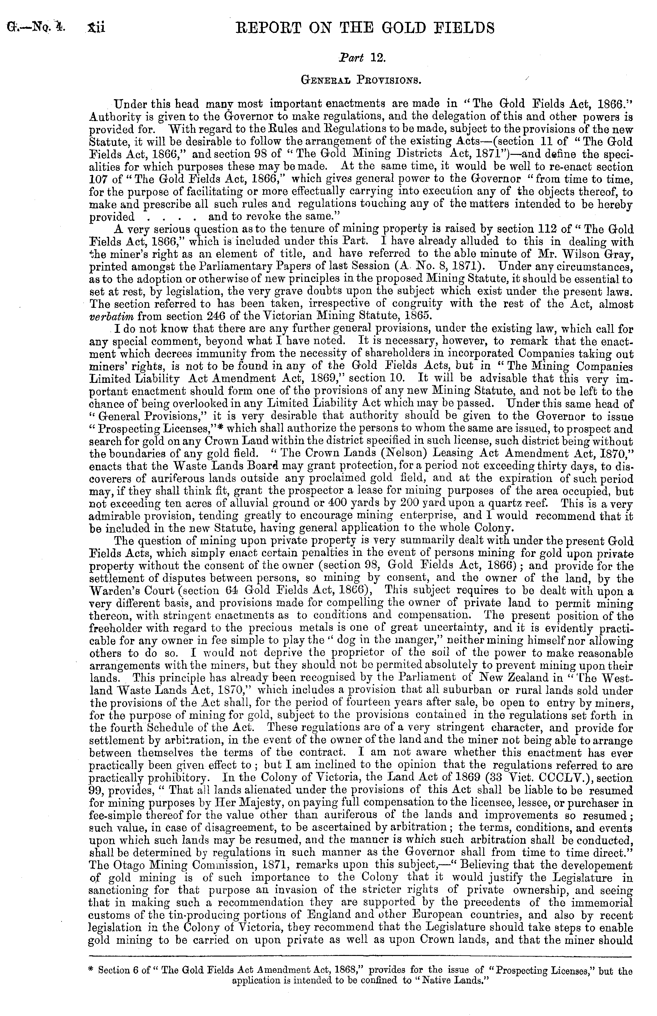 Part 12. GENEEAL PKOTISIONS. Under this head many most important enactments are made in " The Gold Fields Act, 1866." Authority is given to the Governor to make regulations, and the delegation of this and other powers is provided for. With regard to the Bules and Regulations to be made, subject to the provisions of the new Statute, it will be desirable to follow the arrangement of the existing Acts—(section 11 of " The Gold Fields Act, 1866," and section 98 of " The Gold Mining Districts Act, 1871")—and define the specialities for which purposes these may be made. At the same time, it would be well to re-enact section 107 of " The Gold Fields Act, 1866," which gives general power to the Governor " from time to time, for the purpose of facilitating or more effectually carrying into execution any of the objects thereof, to make and prescribe all such rules and regulations touching any of the matters intended to be hereby provided .... and to revoke the same." A very serious question as to the tenure of mining property is raised by section 112 of " The Gold Fields Act, 1866," which is included under this Part. I have already alluded to this in dealing with the miner's right as an element of title, and have referred to the able minute of Mr. Wilson Gray, printed amongst the Parliamentary Papers of last Session (A. No. 8, 1871). Under any circumstances, as to the adoption or otherwise of new principles in the proposed Mining Statute, it should be essential to set at rest, by legislation, the very grave doubts upon the subject which exist under the present laws. The section referred to has been taken, irrespective of congruity with the rest of the Act, almost verbatim from section 246 of the Victorian Mining Statute, 1865. I do not know that there are any further general provisions, under the existing law, which call for any special comment, beyond what I have noted. It is necessary, however, to remark that the enactment which decrees immunity from the necessity of shareholders in incorporated Companies taking out miners' rights, is not to be found in any of the Gold Fields Acts, but in " The Mining Companies Limited Liability Act Amendment Act, 1869," section 10. It will be advisable that this very important enactment should form one of the provisions of any new Mining Statute, and not be left to the chance of being overlooked in any Limited Liability Act which may be passed. Under this same head of " General Provisions," it is very desirable that authority should be given to the Governor to issue " Prospecting Licenses,"* which shall authorize the persons to whom the same are issued, to prospect and search for gold on any Crown Land within the district specified in such license, such district being without the boundaries of any gold field. " The Crown Lands (Nelson) Leasing Act Amendment Act, 1870," enacts that the Waste Lands Board may grant protection, for a period not exceeding thirty days, to discoverers of auriferous lands outside any proclaimed gold field, and at the expiration of such period may, if they shall think fit, grant the prospector a lease for mining purposes of the area occupied, but not exceeding ten acres of alluvial ground or 400 yards by 200 yard upon a quartz reef. This is a very admirable provision, tending greatly to encourage mining enterprise, and 1 would recommend that it be included in the new Statute, having general application to the whole Colony. The question of mining upon private property is very summarily dealt with under the present Gold Fields Acts, which simply enact certain penalties in the event of persons mining for gold upon private property without the consent of the owner (section 98, Gold Fields Act, 1866); and provide for the settlement of disputes between persons, so mining by consent, and the owner of the land, by the Warden's Court (section 64 Gold Fields Act, 1866), This subject requires to be dealt with upon a very different basis, and provisions made for compelling the owner of private land to permit mining thereon, with stringent enactments as to conditions and compensation. The present position of the freeholder with regard to the precious metals is one of great uncertainty, and it is evidently practicable for any owner in fee simple to play the " dog in the manger," neither mining himself nor allowing others to do so. I would not deprive the proprietor of the soil of the power to make reasonable arrangements with the miners, but they should not be permited absolutely to prevent mining upon their lands. This principle has already been recognised by the Parliament of New Zealand in " The Westland Waste Lands Act, 1870," which includes a provision that all suburban or rural lands sold under the provisions of the Act shall, for the period of fourteen years after sale, be open to entry by miners, for the purpose of mining for gold, subject to the provisions contained in the regulations set forth in the fourth Schedule of the Act. These regulations are of a very stringent character, and provide for settlement by arbitration, in the event, of the owner of the land and the miner not being able to arrange between themselves the terms of the contract. I am not aware whether this enactment has ever practically been given effect to ; but I am inclined to the opinion that the regulations referred to are practically prohibitory. In the Colony of Victoria, the Land Act of 1869 (33 Viet. CCCLV.), section 99, provides, " That all lands alienated under the provisions of this Act shall be liable to be resumed for mining purposes by Her Majesty, on paying full compensation to the licensee, lessee, or purchaser in fee-simple thereof for the value other than auriferous of the lands and improvements so resumed; such value, in case of disagreement, to be ascertained by arbitration; the terms, conditions, and events upon which such lands may be resumed, and the manner is which such arbitration shall be conducted, shall be determined by regulations in such ma
