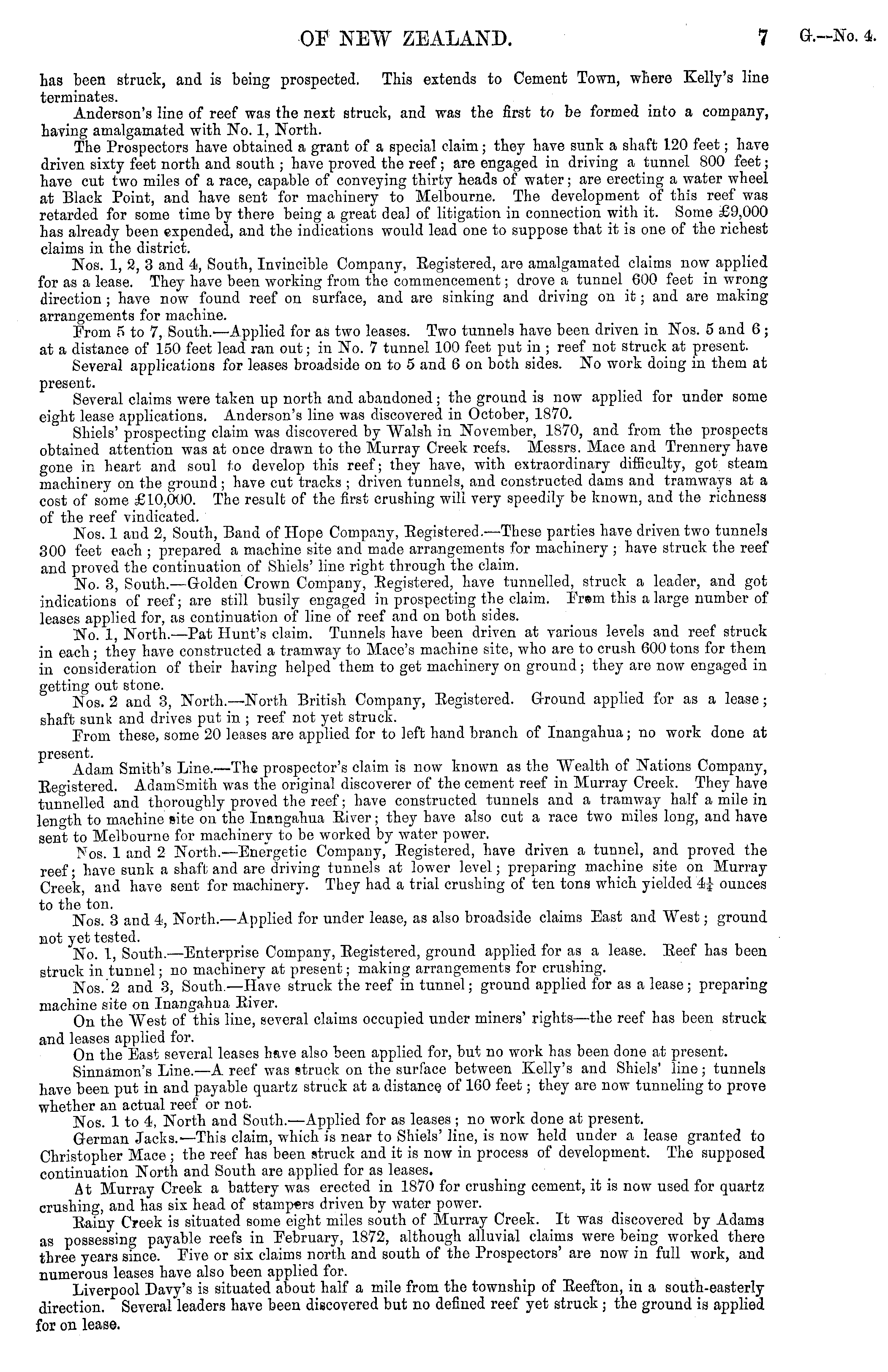 has been struck, and is being prospected. This extends to Cement Town, where Kelly's line terminates. Anderson's line of reef was the next struck, and was the first to be formed into a company, having amalgamated with No. 1, North. The Prospectors have obtained a grant of a special claim; they have sunk a shaft 120 feet; have driven sixty feet north and south ; have proved the reef; are engaged in driving a tunnel 800 feet; have cut two miles of a race, capable of conveying thirty heads of water; are erecting a water wheel at Black Point, and have sent for machinery to Melbourne. The development of this reef was retarded for some time by there being a great deal of litigation in connection with it. Some £9,000 has already been expended, and the indications would lead one to suppose that it is one of the richest claims in the district. Nos. 1, 2, 3 and 4, South, Invincible Company, Begistered, are amalgamated claims now applied for as a lease. They have been working from the commencement; drove a tunnel 600 feet in wrong direction ; have now found reef on surface, and are sinking and driving on it; and are making arrangements for machine. From sto 7, South.—Applied for as two leases. Two tunnels have been driven in Nos. 5 and 6; at a distance of 150 feet lead ran out; in No. 7 tunnel 100 feet put in ; reef not struck at present. Several applications for leases broadside on to 5 and 6on both sides. No work doing in them at present. Several claims were taken up north and abandoned; the ground is now applied for under some eight lease applications. Anderson's line was discovered in October, 1870. Shiels' prospecting claim was discovered by Walsh in November, 1870, and from the prospects obtained attention was at once drawn to the Murray Creek reefs. Messrs. Mace and Trennery have gone in heart and soul to develop this reef; they have, with extraordinary difficulty, got steam machinery on the ground ; have cut tracks ; driven tunnels, and constructed dams and tramways at a cost of some £10,000. The result of the first crushing will very speedily be known, and the richness of the reef vindicated. Nos. 1 and 2, South, Band of Hope Company, Begistered.—These parties have driven two tunnels 300 feet each ; prepared a machine site and made arrangements for machinery ; have struck the reef and proved the continuation of Shiels' line right through the claim. No. 3, South. —Golden Crown Company, Begistered, have tunnelled, struck a leader, and got indications of reef; are still busily engaged in prospecting the claim. Frsm this a large number of leases applied for, as continuation of line of reef and on both sides. No. 1, North. —Pat Hunt's claim. Tunnels have been driven at various levels and reef struck in each; they have constructed a tramway to Mace's machine site, who are to crush 600 tons for them in consideration of their having helped them to get machinery on ground; they aro now engaged in getting out stone. Nos. 2 and 3, North.—North British Company, Begistered. Ground applied for as a lease; shaft sunk and drives put in ; reef not yet struck. From these, some 20 leases are applied for to left hand branch of Inangahua; no work done at present. Adam Smith's Line.—The prospector's claim is now known as the Wealth of Nations Company, Eeo-istered. Adam Smith was the original discoverer of the cement reef in Murray Creek. They have tunnelled and thoroughly proved the reef; have constructed tunnels and a tramway half a mile in length to machine site on the Inangahua Eiver; they have also cut a race two miles long, and have sent to Melbourne for machinery to be worked by water power. Nos. 1 and 2 North. —Energetic Company, Begistered, have driven a tunnel, and proved the reef; have sunk a shaft and are driving tunnels at lower level; preparing machine site on Murray Creek, and have sent for machinery. They had a trial crushing of ten tons which yielded 4|- ounces to the ton. Nos. 3 and 4, North. —Applied for under lease, as also broadside claims East and West; ground not yet tested. No. 1, South. —Enterprise Company, Registered, ground applied for as a lease. Reef has been struck in tunnel; no machinery at present; making arrangements for crushing. Nos. 2 and 3, South. —Have struck the reef in tunnel; ground applied for as a lease; preparing machine site on Inangahua River. On the West of this line, several claims occupied under miners' rights—the reef has been struck and leases applied for. On the East several leases have also been applied for, but no work has been done at present. Sinnamon's Line. —A reef was struck on the surface between Kelly's and Shiels' line; tunnels have been put in and payable quartz struck at a distance of 160 feet; they are now tunneling to prove whether an actual reef or not. Nos. Ito 4, North and South. —Applied for as leases; no work done at present. German Jacks. —This claim, which is near to Shiels' line, is now held under a lease granted to Christopher Mace ; the reef has been struck and it is now in process of development. The supposed continuation North and South are applied for as leases. At Murray Creek a battery was erected in 1870 for crushing cement, it is now used for quartz crushing, and has six head of stampers driven by water power. Eainy Creek is situated some eight miles south of Murray Creek. It was discovered by Adams as possessing payable reefs in February, 1872, although alluvial claims were being worked there three years since. Five or six claims north and south of the Prospectors' are now in full work, and numerous leases have also been applied for. Liverpool Davy's is situated about half a mile from the township of Eeefton, in a south-easterly direction. Several leaders have been discovered but no defined reef yet struck ; the ground is applied for on lease.