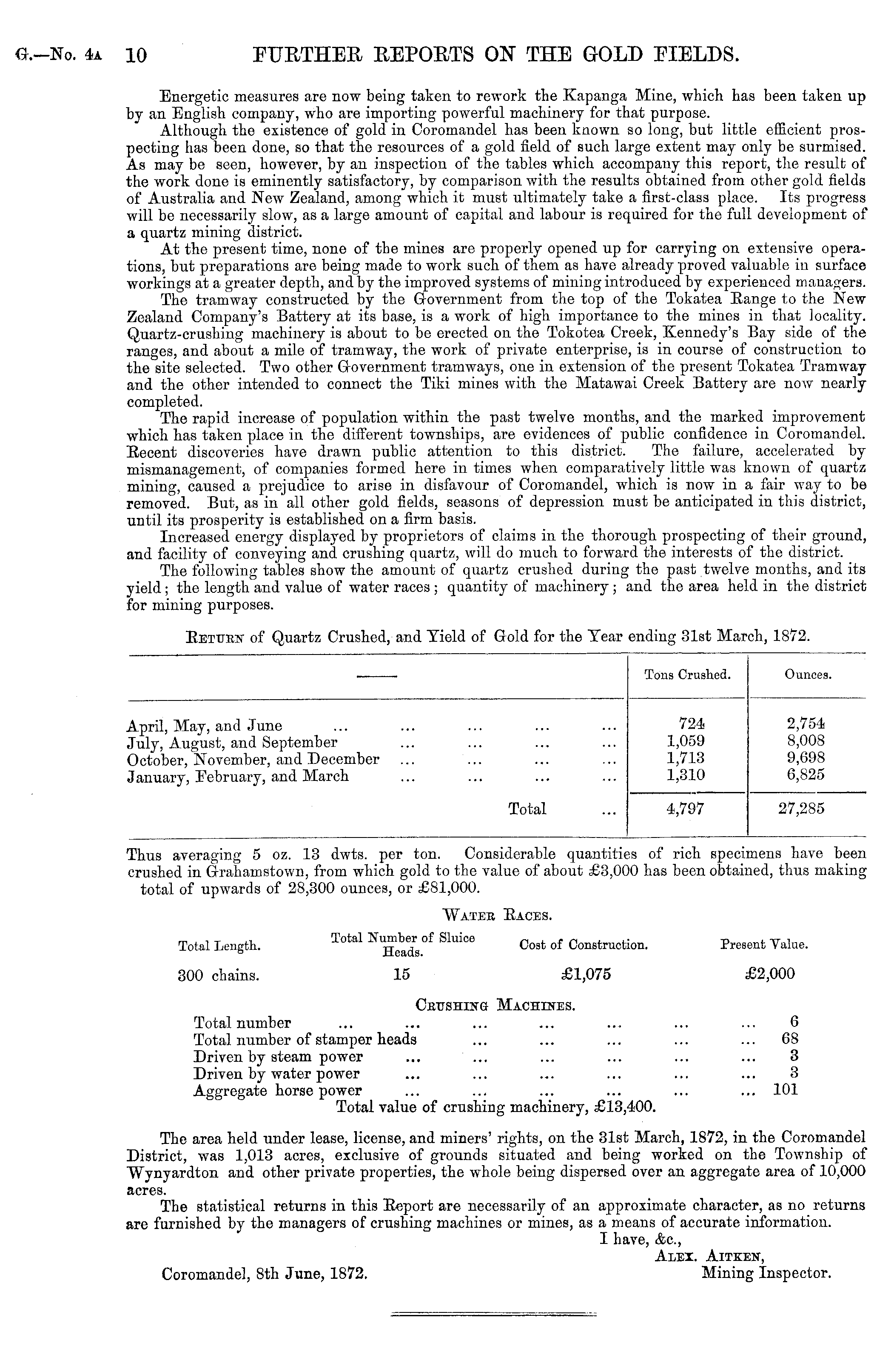 Thus averaging 5 oz. 13 dwts. per ton. Considerable quantities of rich specimens have been crushed in G-rahamstown, from which gold to the value of about £3,000 has been obtained, thus making total of upwards of 28,300 ounces, or £81,000. Wateb Races. Total Length. Total Number of Sluice Cost of Construction. Present Value. 300 chains. 15 £1,075 £2,000 CEUSHiNa Machines. Total number ... ... ... ... ... ... ... 6 Total number of stamper heads ... ... ... ... ... 68 Driven by steam power ... ... ... ... ... ... 3 Driven by water power ... ... ... ... ... ... 3 Aggregate horse power ... ... ... ... ... ... 101 Total value of crushing machinery, £13,400. The area held under lease, license, and miners' rights, on the 31st March, 1872, in the Coromandel District, was 1,013 acres, exclusive of grounds situated and being worked on the Township of "Wynyardton and other private properties, the whole being dispersed over an aggregate area of 10,000 acres. The statistical returns in this Eeport are necessarily of an approximate character, as no returns are furnished by the managers of crushing machines or mines, as a means of accurate information. I have, &c, Alex. Aitkejt, Coromandel, Bth June, 1872. Mining Inspector.