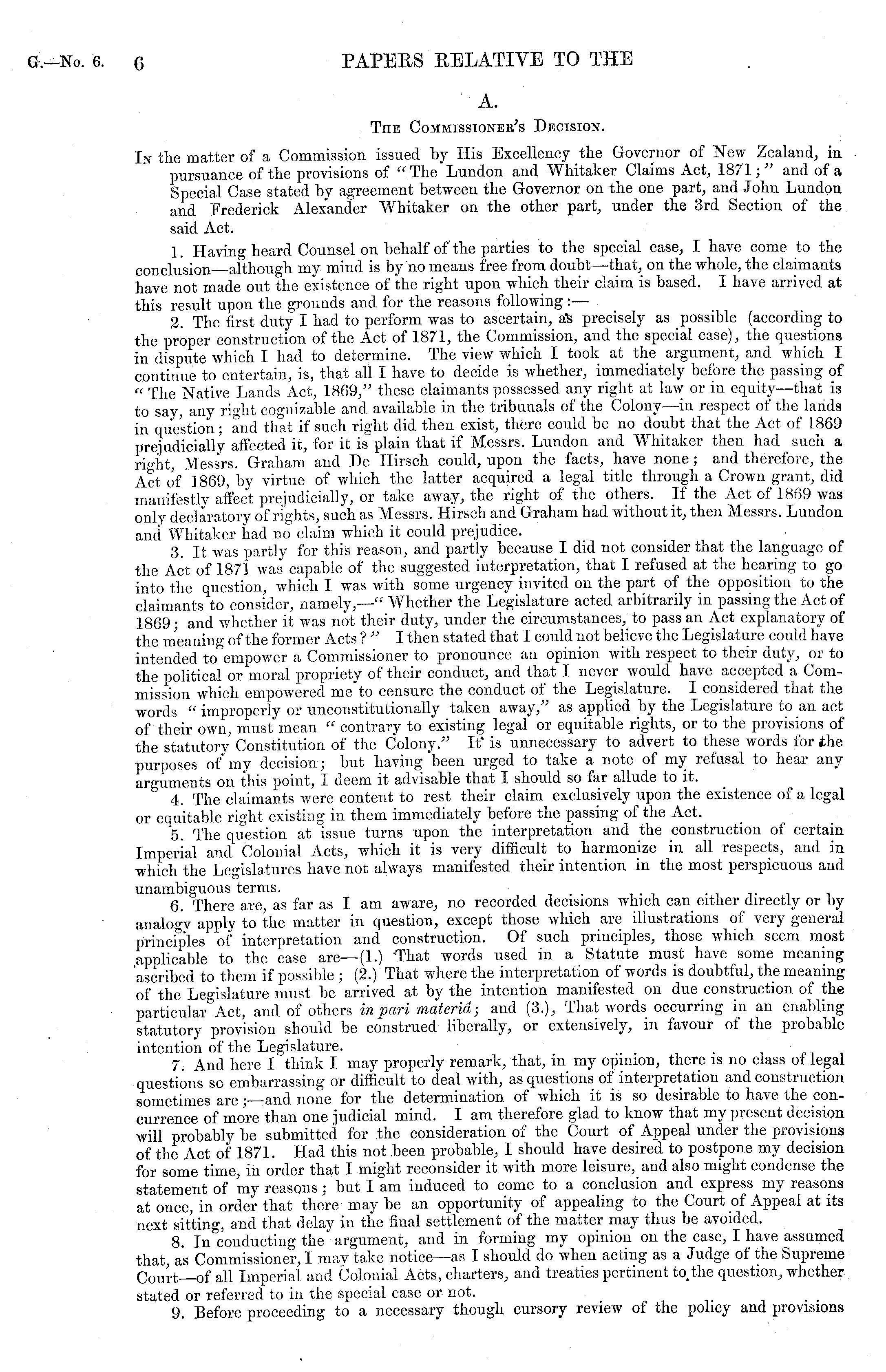 A. The Commissioner's Decision. In the matter of a Commission issued by His Excellency the Governor of New Zealand, in pursuance of the provisions of " The Lundon and Whitaker Claims Act, 1871 ; " and of a Special Case stated by agreement between the Governor on the one part, and John Lundon and Frederick Alexander Whitaker on the other part, under the 3rd Section of the said Act. 1. Having heard Counsel on behalf of the parties to the special case, I have come to the conclusion although my mind is by no means free from doubt —that, on the whole, the claimants have not made out the existence of the right upon which their claim is based. I have arrived at this result upon the grounds and for the reasons following : — 2. The first duty I had to perform was to ascertain, a"s precisely as possible (according to the proper construction of the Act of 1871, the Commission, and the special case), the questions in dispute which I had to determine. The view which I took at the argument, and which I continue to entertain, is, that all I have to decide is whether, immediately before the passing of " The Native Lands Act, 1869," these claimants possessed any right at law or in equity —that is to say, any right cognizable and available in the tribunals of the Colony—in respect of the lands in question; and that if such right did then exist, there could be no doubt that the Act of 1869 prejudicially affected it, for it is plain that if Messrs. Lundon and Whitaker then had such a right, Messrs. Graham and Do Hirsch could, upon the facts, have none ; and therefore, the Act of 1869, by virtue of which the latter acquired a legal title through a Crown grant, did manifestly affect prejudicially, or take away, the right of the others. If the Act of 1869 was only declaratory of rights, such as Messrs. Hirsch and Graham had without it, then Messrs. Lundon and Whitaker had no claim which it could prejudice. 3. It was partly for this reason, and partly because I did not consider that the language of the Act of 1871 was capable of the suggested interpretation, that I refused at the hearing to go into the question, which I was with some urgency invited on the part of the opposition to the claimants to consider, namely,—" Whether the Legislature acted arbitrarily in passing the Act of 1869; and whether it was not their duty, under the circumstances, to pass an Act explanatory of the meaning of the former Acts 1" I then stated that I could not believe the Legislature could have intended to°cmpower a Commissioner to pronounce an opinion with respect to their duty, or to the political or moral propriety of their conduct, and that I never would have accepted a Commission which empowered me"to censure the conduct of the Legislature. I considered that the words " improperly or unconstitutionally taken away," as applied by the Legislature to an act of their own, must mean " contrary to existing legal or equitable rights, or to the provisions of the statutory Constitution of the Colony." It' is unnecessary to advert to these words for ihe purposes of my decision; but having been urged to take a note of my refusal to hear any arguments on this point, I deem it advisable that I should so far allude to it. ' 4. The claimants were content to rest their claim exclusively upon the existence of a legal or equitable right existing in them immediately before the passing of the Act. 5. The question at issue turns upon the interpretation and the construction of certain Imperial and Colonial Acts, which it is very difficult to harmonize in all respects, and in which the Legislatures have not always manifested their intention in the most perspicuous and unambiguous terms. . 6. There are as far as I am aware, no recorded decisions which can either directly or by analogy apply to the matter in question, except those which are illustrations of very general principles of interpretation and construction. Of such principles, those which seem most applicable to the case are—(l.) That words used in a Statute must have some meaning 'ascribed to them if possible ; (2.) That where the interpretation of words is doubtful, the meaning of the Legislature must be arrived at by the intention manifested on due construction of the particular Act, and of others in pan materid; and (3.), That words occurring in an enabling statutory provision should be construed liberally, or extensively, in favour of the probable intention of the Legislature. 7. And here I think I may properly remark, that, in my opinion, there is no class of legal questions so embarrassing or difficult to deal with, as questions of interpretation and construction sometimes arc ; and none for the determination of which it is so desirable to have the concurrence of more than one judicial mind. I am therefore glad to know that my present decision will probably be submitted for the consideration of the Court of Appeal under the provisions of the Act of 1871. Had this not been probable, I should have desired to postpone my decision for some time, in order that I might reconsider it with more leisure, and also might condense the statement of my reasons; but lam induced to come to a conclusion and express my reasons at once, in order that there may be an opportunity of appealing to the Court of Appeal at its next sitting, and that delay in the final settlement of the matter may thus be avoided. 8. In conducting the argument, and in forming my opinion on the case, I have assumed that, as Commissioner, I may take notice—as I should do when acting as a Judge of the Supreme Court—of all Imperial and Colonial Acts, charters, and treaties pertinent to.the question, whether stated or referred to in the special case or not. 9. Before proceeding to a necessary though cursory review of the policy and provisions