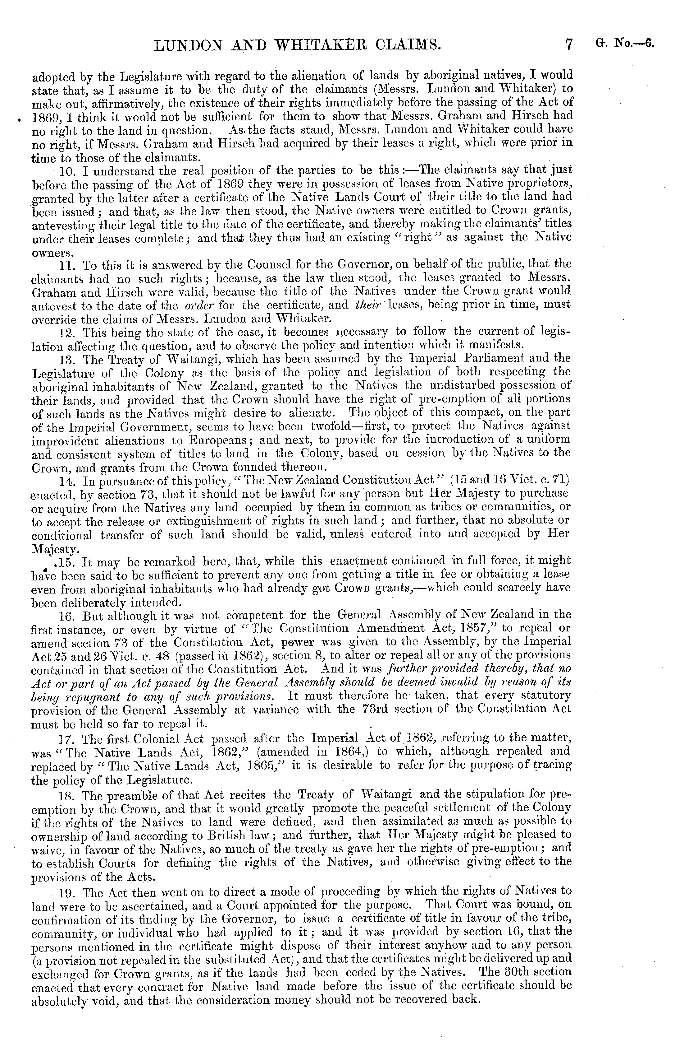 adopted by the Legislature with regard to the alienation of lands by aboriginal natives, I would state that, as I assume it to be the duty of the claimants (Messrs. Lundon and Whitaker) to make out, affirmatively, the existence of their rights immediately before the passing of the Act of 1869, I think it would not be sufficient for them to show that Messrs. Graham and Hirsch had no right to the land in question. As. the facts stand, Messrs. Lundon and Whitaker could have no right, if Messrs. Graham and Hirsch had acquired by their leases a right, which were prior in time to those of the claimants. 10. I understand the real position of the parties to be this : —-The claimants say that just before the passing of the Act of 1869 they were in possession of leases from Native proprietors, granted by the latter after a certificate of the Native Lands Court of their title to the land had been issued; and that, as the law then stood, the Native owners were entitled to Crown grants, antevesting their legal title to the date of the certificate, and thereby making the claimants' titles under their leases complete; and thai they thus had an existing " right" as against the Native owners. 11. To this it is answered by the Counsel for the Governor, on behalf of the public, that the claimants had no such rights ; because, as the law then stood, the leases granted to Messrs. Graham and Hirsch were valid, because the title of the Natives under the Crown grant would antevest to the date of the order for the certificate, and their leases, being prior in time, must override the claims of Messrs. Lundon and Whitaker. 12. This being the state of the case, it becomes necessary to follow the current of legislation affecting the question, and to observe the policy and intention which it manifests. 13. The Treaty of Waitangi, which has been assumed by the Imperial Parliament and the Legislature of the Colony as the basis of the policy and legislation of both respecting the aboriginal inhabitants of New Zealand, granted to the Natives the undisturbed possession of their lands, and provided that the Crown should have the right of pre-emption of all portions of such lands as the Natives might desire to alienate. The object of this compact, on the part of the Imperial Government, seems to have been twofold —first, to protect the Natives against improvident alienations to Europeans; and next, to provide for the introduction of a uniform and consistent system of titles to land in the Colony, based on cession by the Natives to the Crown, and grants from the Crown founded thereon. 14. In pursuance of this policy, " The New Zealand Constitution Act " (15 and 16 Viet. c. 71) enacted, by section 73, that it should not be lawful for any person but Her Majesty to purchase or acquire from the Natives any land occupied by them in common as tribes or communities, or to accept the release or extinguishment of rights in such land; and further, that no absolute or conditional transfer of such land should be valid, unless entered into and accepted by Her Majesty. .15. It may be remarked here, that, while this enactment continued in full force, it might have been said to be sufficient to prevent any one from getting a title in fee or obtaining a lease even from aboriginal inhabitants who had already got Crown grants, —which could scarcely have been deliberately intended. 16 But although it was not competent for the General Assembly of New Zealand in the first instance, or even by virtue of "The Constitution Amendment Act, 1857," to repeal or amend section 73 of the Constitution Act, power was given to the Assembly, by the Imperial Act 25 and 26 Viet. c. 48 (passed in 1862), section 8, to alter or repeal all or any of the provisions contained in that section of the Constitution Act. And it was further provided thereby, that no Act or part of an Act passed by the General Assembly should be deemed invalid by reason of its being repugnant to any of such provisions. It must therefore be taken, that every statutory provision of the General Assembly at variance with the 73rd section of the Constitution Act must be held so far to repeal it. 17. The first Colonial Act passed after the Imperial Act of 1862, referring to the matter, was "The Native Lands Act, 1862," (amended in 1864,) to which, although repealed and replaced by " The Native Lands Act, 1865," it is desirable to refer for the purpose of tracing the policy of the Legislature. 18. The preamble of that Act recites the Treaty of Waitangi and the stipulation for preemption by the Crown, and that it would greatly promote the peaceful settlement of the Colony if the rights of the Natives to land were defined, and then assimilated as much as possible to ownership of land according to British law ; and further, that Her Majesty might be pleased to waive, in favour of the Natives, so much of the treaty as gave her the rights of pre-emption; and to establish Courts for defining the rights of the Natives, and otherwise giving effect to the provisions of the Acts. 19. The Act then went on to direct a mode of proceeding by which the rights of Natives to land were to be ascertained, and a Court appointed for the purpose. That Court was bound, on confirmation of its finding by the Governor, to issue a certificate of title in favour of the tribe, community, or individual who had applied to it ; and it was provided by section 16, that the persons mentioned in the certificate might dispose of their interest anyhow and to any person (a provision not repealed in the substituted Act), and that the certificates might bo delivered up and exchanged for Crown grants, as if the lands had been ceded by the Natives. The 30th section enacted that every contract for Native land made before the issue of the certificate should be absolutely void, and that the consideration money should not be recovered back.
