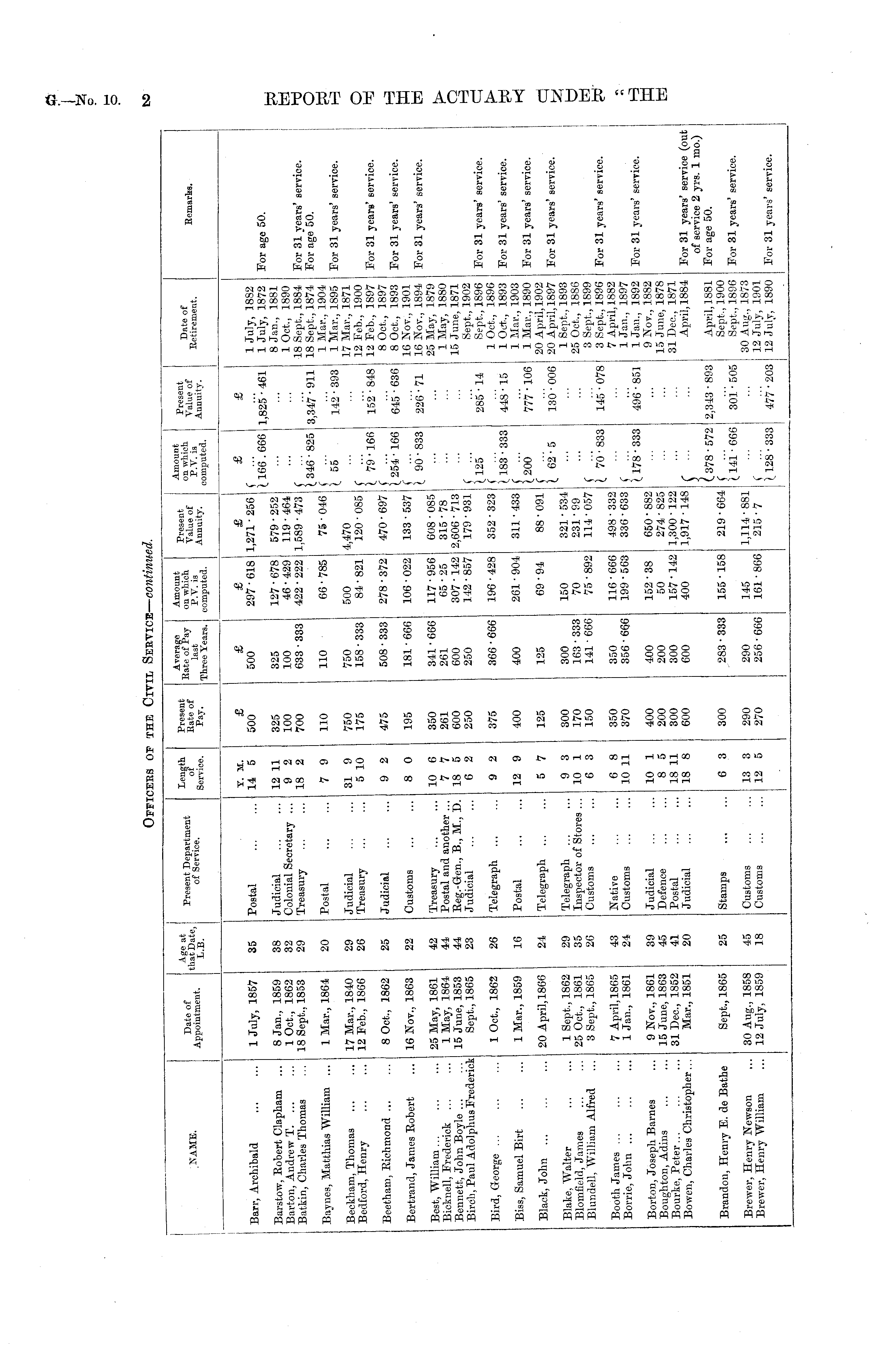 ff: :CER8 OF THE !IYIL iERYU !E— contim Date of Appointment. Age at that Date, L.B. Present Department of Service. Length of Service. Present Rate of Pay. Average Rate of Pay last Three Years. Amount on which P.Y. is computed. Present Value of Annuity. Amount on which P.V. is computed. Present Value of Annuity. Date of Retirement. Remarks. ;NAME. 1 July, 1857 35 Postal ... ... T. M. 14 5 500 £ 500 £ 297 • 618 £ 1,271 • 256 £ f ... (. 166 . 666 | £ 1,825' 461 1 July, 1882 1 July, 1872 8 Jan., 1881 1 Oct., 1890 18 Sept., 1884 18 Sept., 1874 1 Mar., 1904 1 Mar., 1895 17 Mar., 1871 12 Feb., 1900 12 Feb., 1897 8 Oct., 1897 8 Oct., 1893 16 Nov., 1901 16 Nov., 1894 25 May, 1879 1 May, 1880 15 June, 1871 Sept., 1902 Sept., 1896 1 Oct., 1896 1 Oct,., 1893 1 Mar., 1903 1 Mar., 1890 20 April, 1902 20 April, 1897 1 Sept., 1893 25 Oct., 1886 3 Sept., 1899 3 Sept., 1896 7 April, 1882 1 Jan., 1897 1 Jan., 1892 9 Nov., 1882 15 June, 1878 31 Dec, 1871 April, 1884 Barr, Archibald For age 50. Barstow, Robert Clapham ... Barton, Andrew T. ... Batkin, Charles Thomas 8 Jan., 1859 1 Oct., 1862 18 Sept.. 1853 38 32 29 Judicial Colonial Secretary ... Treasury 12 11 9 2 18 2 325 100 700 325 100 633 • 333 127 • 678 46 ■ 429 422 • 222 579 • 252 119 • 464 1,589 • 473 ... . - 1 I I For 31 years' service. For age 50. Baynes, Matthias William ... 1 Mar., 1864 20 Postal 7 9 110 110 66-785 75' 046 ( 346 • 825 f ... ( 55 3,347'• 911 29 26 Judicial Treasury 31 9 5 10 750 175 750 158 • 333 500 84 • 821 4,470 120 • 085 142 • 393 For 31 years' service. Beckham, Thomas Bedford, Henry 17 Mar., 1840 12 Feb., 1866 f ... ( 79-166 ). 254 • 166 ( 90-833 For 31 years' service. 152 • 848 Beetham, Richmond ... 8 Oct., 1862 25 Judicial 9 2 475 508 • 333 ! 278 • 372 470 • 697 645 ■ 636 133 ■ 537 For 31 years' service. Bertrand, James Robert 16 Nov., 1863 22 Customs 8 0 195 181 • 666 106 ■ 022 226 ■ 71 For 31 years' service. Best, William Bicknell, Frederick ... Bennett, John Boyle ... Birch, Paul Adolphus Frederick 25 May, 1861 1 May, 1864 15 June, 1853 Sept., 1865 42 44 44 23 Treasury Postal and another ... Reg.-Gen., B., M., D. Judicial 10 6 7 7 18 5 6 2 350 261 600 250 341 • 666 261 600 250 117 • 956 65 • 25 307 • 142 142 • 857 608 • 085 315 • 78 2,606 • 713 179 • 931 I I ... | ... ( ... (183 • 333 (200" f ... I 62-5 285 "-14 For 31 years' service. Bird, George ... 1 Oct., 1862 26 Telegraph 9 2 375 366 • 666 196 • 428 352 • 323 448 • 15 For 31 years' service. Biss, Samuel Birt 1 Mar., 1859 16 Postal 12 9 400 400 261 ■ 904 311' 433 777 "■ 106 For 31 years' service. Black, John ... 20 April, 1866 24 Telegraph 5 7 125 125 69-94 j 88 ■ 091 ... 130 • 006 For 31 years' service. Blake, Walter Blomfield, James Blundell, William Alfred 1 Sept., 1862 25 Oct., 1861 3 Sept., 1865 29 35 26 Telegraph Inspector of Stores ... Customs 9 3 10 1 6 3 300 170 150 300 163 ■333 141 • 666 150 70 75 • 892 321 ■534 231 • 99 114 ■ 057 ( ... I 70-833 145-078 For 31 years' service. Booth James ... Borrie, John ... 7 April, 1865 1 Jan., 1861 43 24 Native Customs 6 8 10 11 350 370 350 356• 666 116 • 666 199• 563 498 • 332 336 • 633 k ... (178 • 333 For 31 years' service. 496-851 Borton, Joseph Barnes Boughton, Adins Bourke, Peter... Bowen, Charles Christopher... 9 Nov., 1861 15 June, 1863 31 Dec, 1852 Mar., 1851 39 45 41 20 Judicial Defence Postal Judicial 10 1 8 5 18 11 18 8 400 200 300 600 400 200 300 600 152 • 38 50 157 • 142 400 650 • 882 274 • 825 1,300 ■ 122 1,917 • 148 For 31 years' service (out of service 2 yrs. 1 mo.) For age 50. Brandon, Henry E. de Bathe Sept., 1865 25 Stamps 6 3 300 283• 333 155 ■158 219 • 664 (. 378 • 572 ( ... 141 ■ 666 2,343 • 893 April, 1881 Sept., 1900 Sept., 1896 30 Aug., 1873 12 July, 1901 12 July, 1890 301 • 505 I For 31 years' service. Brewer, Henry Newson Brewer, Henry William 30 Aug., 1858 12 July, 1859 45 18 Customs Customs 13 3 12 5 290 270 290 256• 666 145 161 ■866 1,114 • 881 215-7 i - ( ... 1128 • 333 477 ■ 203 For 31 years' service.