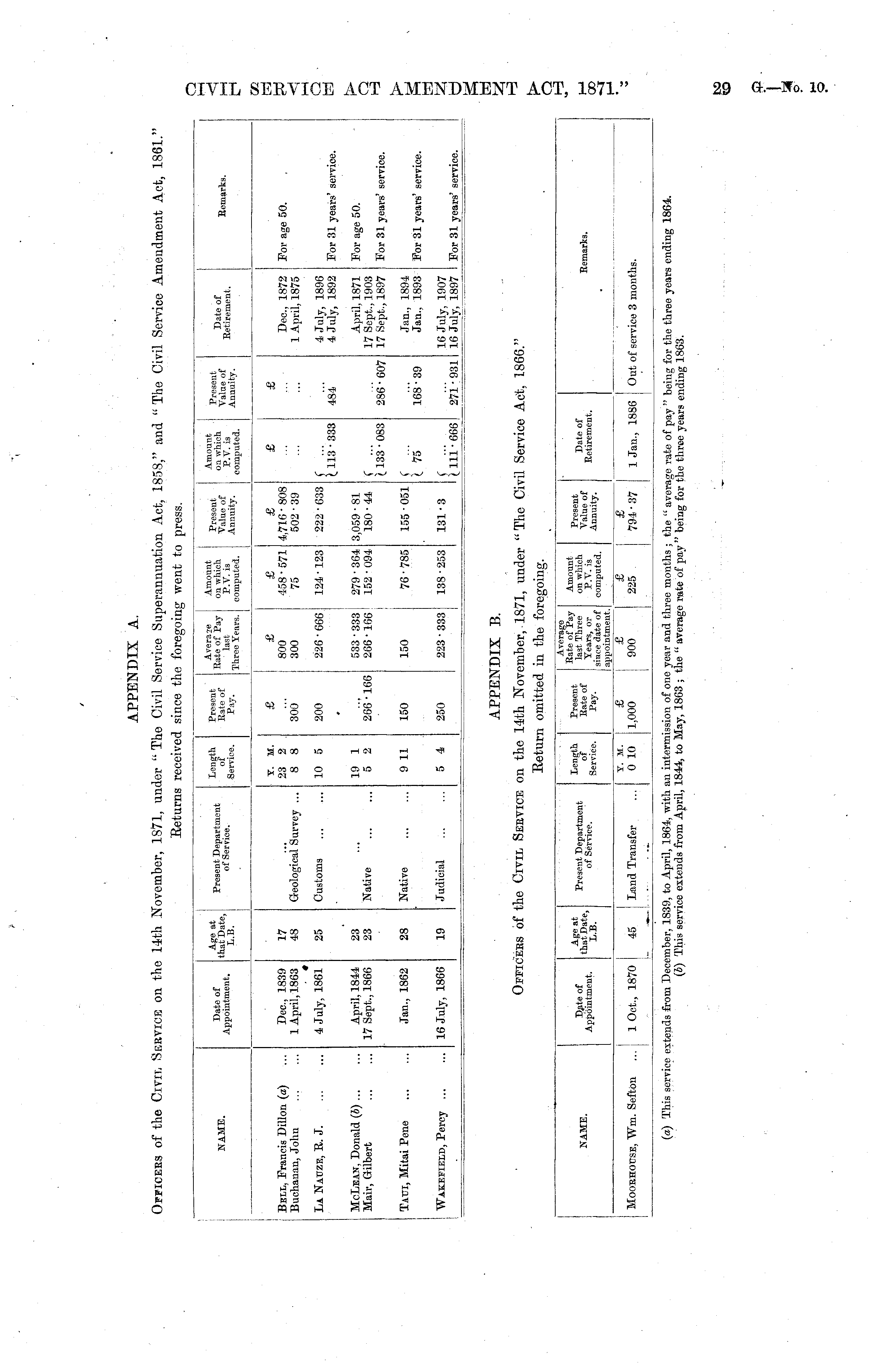 NAME. Date of Appointment. Age at that Date, L.B. Present Department of Service. Length of Service. Present Avera.e Amount Rate of Baie Qf Pay on which p last P.Y. is 1 y ' Three _"ears. computed. Present Value of Annuity. Amount on which P.V. is computed. Present Value of Annuity. Date of Retirement. Remarks. Bell, Francis Dillon (a) Buchanan, John Dec, 1839 1 April, 1863 4 July, 1861 17 48 ... Geological Survey ... Y. M. 23 2 8 8 £ 300" £ 800 300 £ 458 • 571 75 £ 4,716 • 808 502 • 39 £ £ Dec, 1872 1 April, 1875 For age 50. La Natjze, R. J. 25 Customs 10 5 200 226 • 666 124 ■123 222 • 633 1.113 "-333 484 4 July, 1896 4 July, 1892 For 31 years' service. McLean, Donald (b) ... Mail-, Gilbert April, 1844 17 Sept., 1866 23 23 Native 19 1 5 2 266-166 533 • 333 266 • 166 279 • 364 152 • 094 3,059 • 81 180 • 44 C ... (. 133 • 083 286-607 April, 1871 17 Sept., 1903 17 Sept., 1897 For age 50. For 31 years' service. Taui, Mitai Pcne Jan., 1862 28 Native 9 11 150 150 76 • 785 155 • 051 C ... i 75 168-39 Jan., 1894 Jan., 1893 For 31 years' service. Wakeeield, Percy ... 16 July, 1866 19 Judicial 5 4 250 223 ■ 333 138 ■253 131-3 f ... (111• 666 271-931 16 July, 1907 16 July, 1897 For 31 years' service. APPENDIX B. Officers of the Civil Seryice on the 14th November, 1871, under "The Civil Service Act, 1866." Return omitted in the foregoing. NAME. D^ite of Appointment. Age at that Date, L.B. Present Department of Service. Length of Service. Present Rate of Pay. Average Rate of Pay Amount last Three on which Years, or P.Y. is since date of computed. appointment. Present Value of Annuity. Date of Retirement. Remarks. Mooehouse, Wm. Sefton 1 Oct., 1870 45 Land Transfer Y. M. 0 10 £ 1,000 £ 900 £ 225 £ 794 • 37 J 1 Jan., 1886 Out of service 3 months. (a) This service extends from December, 1839, to April, 1864, with an intermi (o) This service extends from April, 1844, to 1 ssion of one year and three months; the " average rate of pay " 1 lay, 1863 ; the " average rate of pay " being for the three years ei ieing for the three years ending 1864. iding 1863.