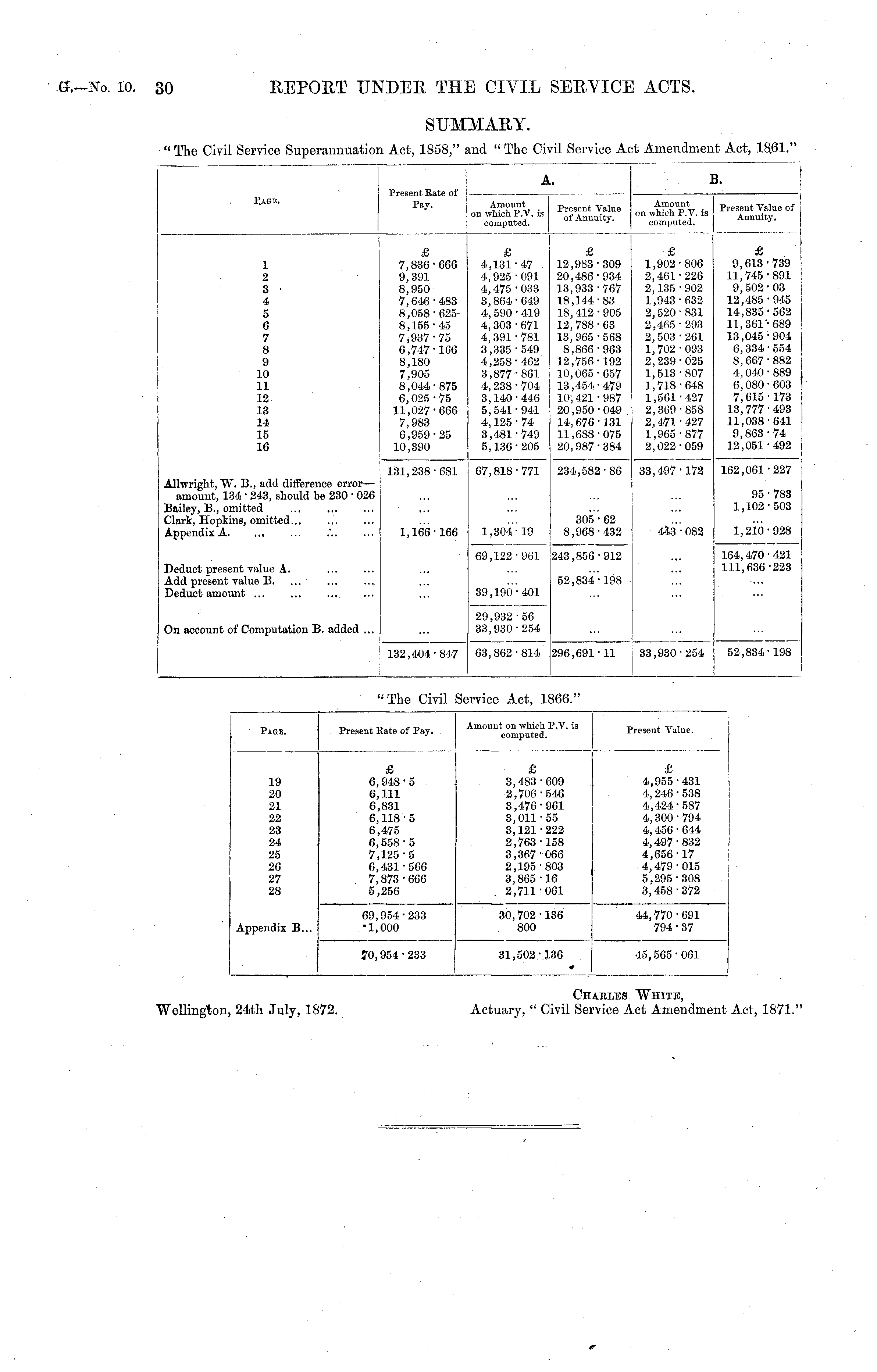 P.AGE. Present Rate of Pay. Amount on which P.Y. is computed. B. Present Value of Annuity. Present Value of Annuity. Amount on which P.Y. is computed. 1 2 3 4 5 6 7 8 9 10 11 12 13 14 15 16 £ 7,836-666 9,391 8,950 7,646 • 483 8,058-625-8,155-45 7,937-75 6,747-166 8,180 7,905 8,044-875 6,025-75 11,027-666 7,983 6,959-25 10,390 £ 4,131-47 4,925 • 091 4,475 • 033 3,864-649 4,590 • 419 4,303 • 671 4,391 • 781 3,335-549 4,258-462 3,877-861 4,238 • 704 3,140-446 5, 541 • 941 4,125 • 74 3,481-749 5,136 • 205 £ 12,983-309 20,486-034 13,033-767 18,144-83 18,412-905 12,788 • 63 13, 965 • 568 8,866-963 12,756-192 10,065-657 13,454-479 10,421-987 20,950-049 14,676-131 11,688-075 20,987 ■384 £ 1,902-806 2,461-226 2,135 • 902 1,943-632 2,520 • 831 2,465-293 2,503 ■ 261 1,702-093 2,239-025 1,513-807 1,718-648 1,561-427 2,369-858 2,471 • 427 1,965-877 2,022 • 059 £ 9,613-739 11,745-891 : 9,502 • 03 12,485-945 14,835-562 j 11,361-689 I 13,045-904 6,334-564 8,667-882 j 4,040 • 889 i 6,080-603 I 7,615-173 i 13,777-493 ! 11,038-641 ' 9,863-74 12,051-492 I Allwright, W. B., add difference erroramount, 134 • 243, should be 230 • 026 Bailey, B., omitted dark, Hopkins, omitted... Appendix A. .., 131,238-681 67,818 • 771 234,582-86 33,497-172 162,061-227 95 • 783 1,102-503 1,166-166 1,304-19 305-62 8,968-432 443-082 1,210-928 Deduct present value A. Add present value B. ... Deduct amount ... 69,122-961 243,856-912 164,470-421 111,636-223 39,190-401 52,834" 198 On account of Computation B. added ... 29,932-56 33,930 • 254 296,691-11 33,930-254 52,834-198 132,404-847 63,862-814 :'The Civil Si srvice Act, 1 166." Pagb. Present late of Pay. .mount on which computed. '.V. is Present Value. 19 20 21 22 23 24 25 26 27 28 £ 6,948 • 5 6,111 6,831 6,118-5 6,475 6,558-5 7,125-5 6,431-566 7,873 • 666 5,256 £ 3,483-609 2,706-546 3,476-961 3,011-55 3,121-222 2,763-158 3,367-066 2,195-803 3,865-16 2,711-061 £ 4,955-431 4,246 • 538 4,424-587 4,300 ■ 794 4,456 • 644 4,497 • 832 4,656-17 4,479 • 015 5,295-308 3,458 ■ 372 Appendix B... 69,954-233 •1,000 30,702 ■ 136 800 44,770 • 691 794 • 37 SO, 954•233 31,502-136 45,565 ■ 061 # Ch. Actuary, " Civil Ser arles White, ■vice Act Amendment Act, 1871.' ellington, 24th July, 1872.