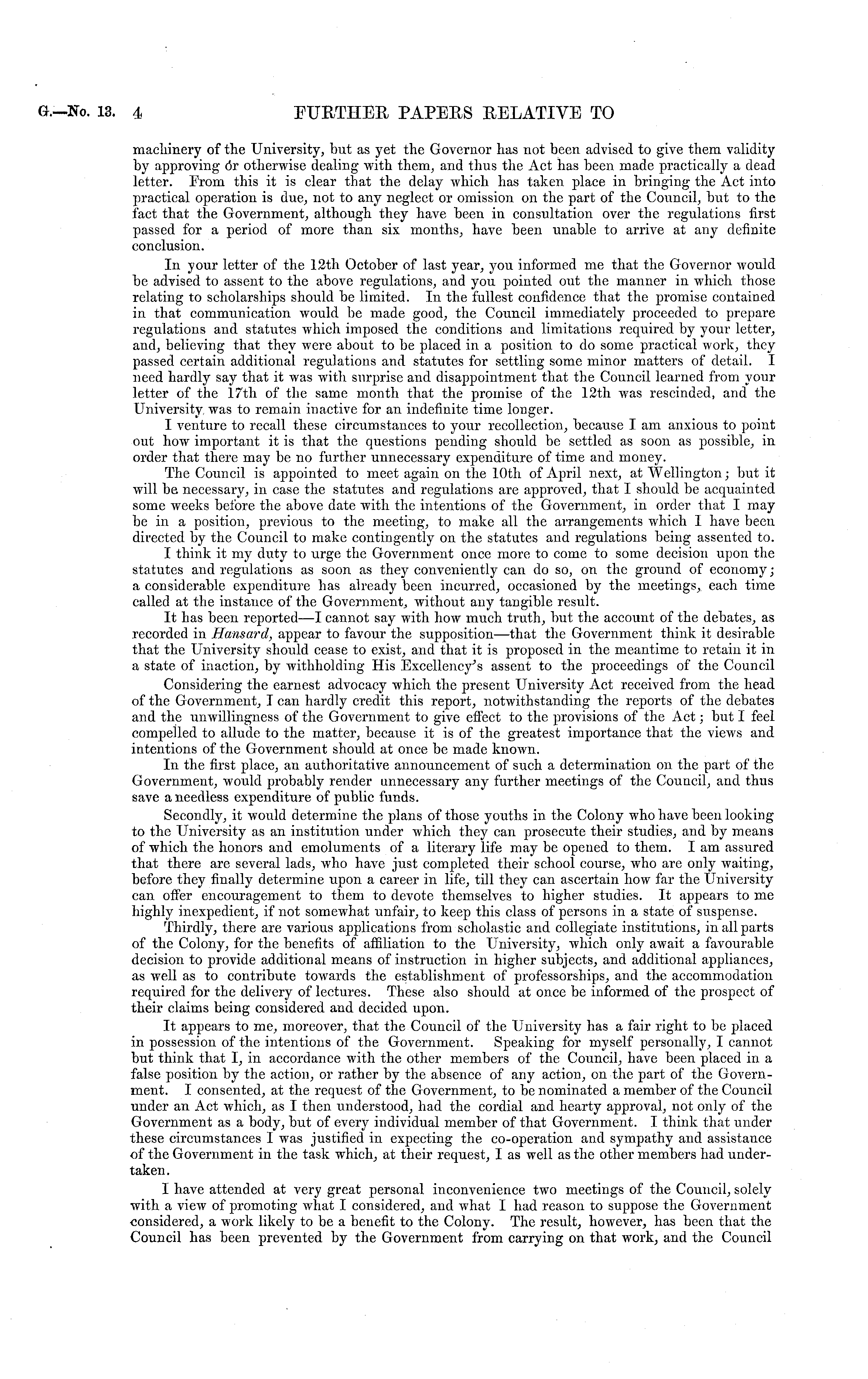 machinery of the University, but as yet the Governor has not been advised to give them validity by approving dr otherwise dealing with them, and thus the Act has been made practically a dead letter. From this it is clear that the delay which has taken place in bringing the Act into practical operation is due, not to any neglect or omission on the part of the Council, but to the fact that the Government, although they have been in consultation over the regulations first passed for a period of more than six months, have been unable to arrive at any definite conclusion. In your letter of the 12th October of last year, you informed me that the Governor would be advised to assent to the above regulations, and you pointed out the manner in which those relating to scholarships should be limited. In the fullest confidence that the promise contained in that communication would be made good, the Council immediately proceeded to prepare regulations and statutes which imposed the conditions and limitations required by your letter, and, believing that they were about to be placed in a position to do some practical work, they passed certain additional regulations and statutes for settling some minor matters of detail. I need hardly say that it was with surprise and disappointment that the Council learned from your letter of the 17th of the same month that the promise of the 12th was rescinded, and the University was to remain inactive for an indefinite time longer. I venture to recall these circumstances to your recollection, because I am anxious to point out how important it is that the questions pending should be settled as soon as possible, in order that there may be no further unnecessary expenditure of time and money. The Council is appointed to meet again on the 10th of April next, at Wellington; but it will be necessary, in case the statutes and regulations are approved, that I should be acquainted some weeks before the above date with the intentions of the Government, in order that I may be in a position, previous to the meeting, to make all the arrangements which I have been directed by the Council to make contingently on the statutes and regulations being assented to. I think it my duty to urge the Government once more to come to some decision upon the statutes and regulations as soon as they conveniently can do so, on the ground of economy; a considerable expenditure has already been incurred, occasioned by the meetings, each time called at the instance of the Government; without any tangible result. It has been reported—l cannot say with how much truth, but the account of the debates, as recorded in Hansard, appear to favour the supposition—that the Government think it desirable that the University should cease to exist, and that it is proposed in the meantime to retain it in a state of inaction, by withholding His Excellency's assent to the proceedings of the Council Considering the earnest advocacy which the present University Act received from the head of the Government, I can hardly credit this report, notwithstanding the reports of the debates and the unwillingness of the Government to give effect to the provisions of the Act; but I feel compelled to allude to the matter, because it is of the greatest importance that the views and intentions of the Government should at once be made known. In the first place, an authoritative announcement of such a determination on the part of the Government, would probably render unnecessary any further meetings of the Council, and thus save a needless expenditure of public funds. Secondly, it would determine the plans of those youths in the Colony who have been looking to the University as an institution under which they can prosecute their studies, and by means of which the honors and emoluments of a literary life may be opened to them. lam assured that there are several lads, who have just completed their school course, who are only waiting, before they finally determine upon a career in life, till they can ascertain how far the University can offer encouragement to them to devote themselves to higher studies. It appears to me highly inexpedient, if not somewhat unfair, to keep this class of persons in a state of suspense. Thirdly, there are various applications from scholastic and collegiate institutions, in all parts of the Colony, for the benefits of affiliation to the University, which only await a favourable decision to provide additional means of instruction in higher subjects, and additional appliances, as well as to contribute towards the establishment of professorships, and the accommodation required for the delivery of lectures. These also should at once be informed of the prospect of their claims being considered and decided upon. It appears to me, moreover, that the Council of the University has a fair right to be placed in possession of the intentions of the Government. Speaking for myself personally, I cannot but think that I, in accordance with the other members of the Council, have been placed in a false position by the action, or rather by the absence of any action, on the part of the Government. I consented, at the request of the Government, to be nominated a member of the Council under an Act which, as I then understood, had the cordial and hearty approval, not only of the Government as a body, but of every individual member of that Government. I think that under these circumstances I was justified in expecting the co-operation and sympathy and assistance of the Government in the task which, at their request, I as well as the other members had undertaken . I have attended at very great personal inconvenience two meetings of the Council, solely with a view of promoting what I considered, and what I had reason to suppose the Government considered, a work likely to be a benefit to the Colony. The result, however, has been that the Council has been prevented by the Government from carrying on that work, and the Council