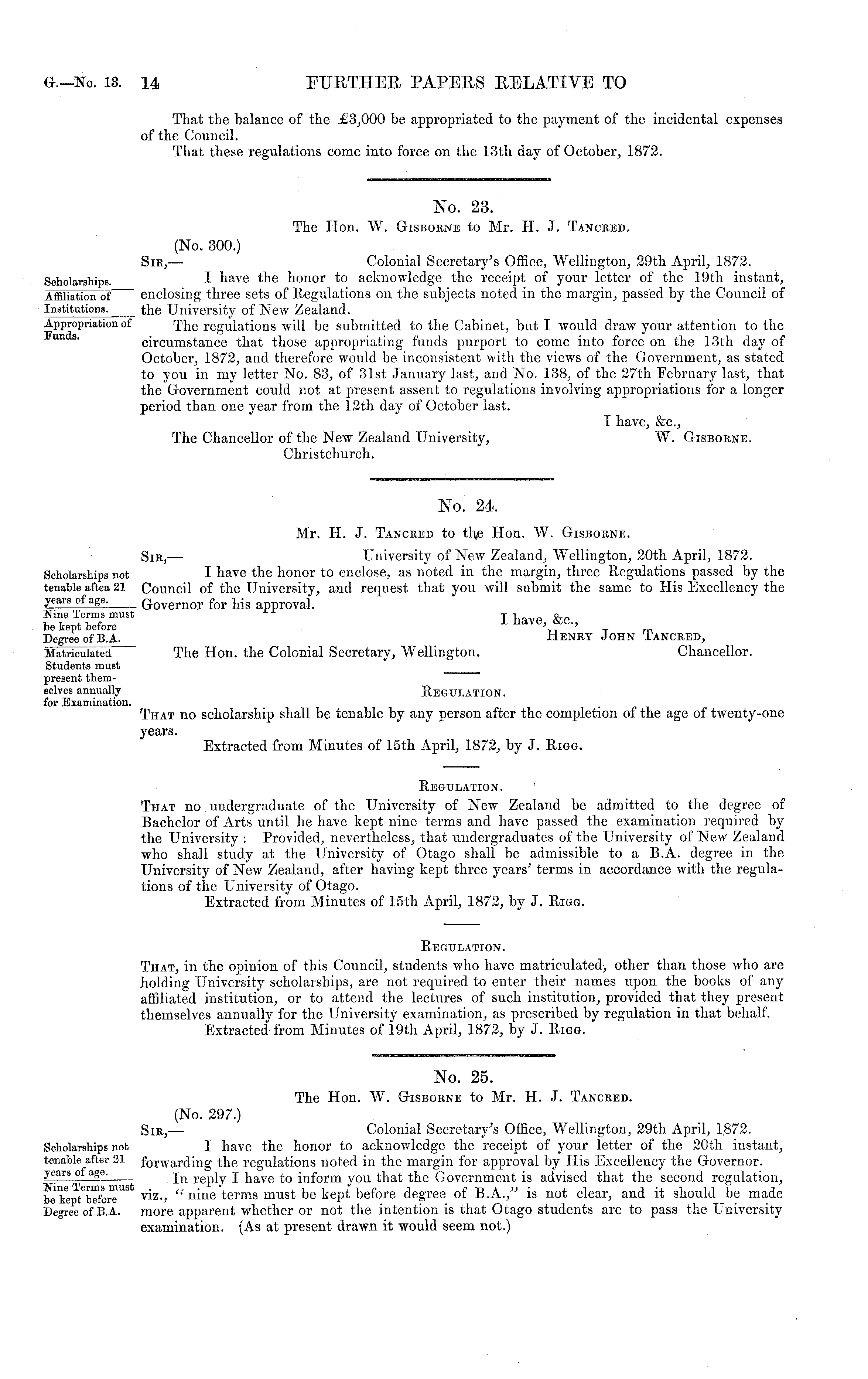 No. 24 Mr. H. J. Tancred to the Hon. W. Gisborne. Sir, — University of New Zealand, Wellington, 20th April, 1872. I have the honor to enclose, as noted in the margin, three Regulations passed by the Council of the University, and request that you will submit the same to His Excellency the Governor for his approval. I have, &c., Henry John Tancred, The Hon. the Colonial Secretary, Wellington. Chancellor. Regulation. That no scholarship shall be tenable by any person after the completion of the age of twenty-one years. Extracted from Minutes of 15th April, 1872, by J. Rigg.