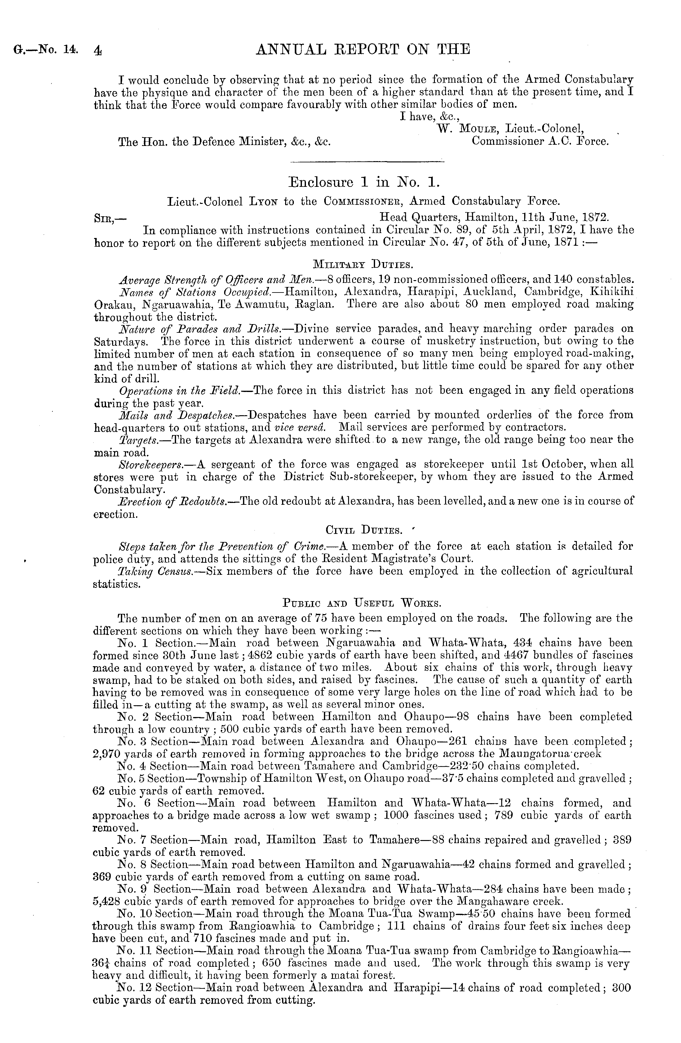 I would conclude by observing that at no period since the formation of the Armed Constabulary have the physique and character of the men been of a higher standard than at the present time, and I think that the Force would compare favourably with other similar bodies of men. I have, &c, W. Moule, Lieut.-Colonel, The Hon. the Defence Minister, &c, &c. Commissioner A.C. Force.
