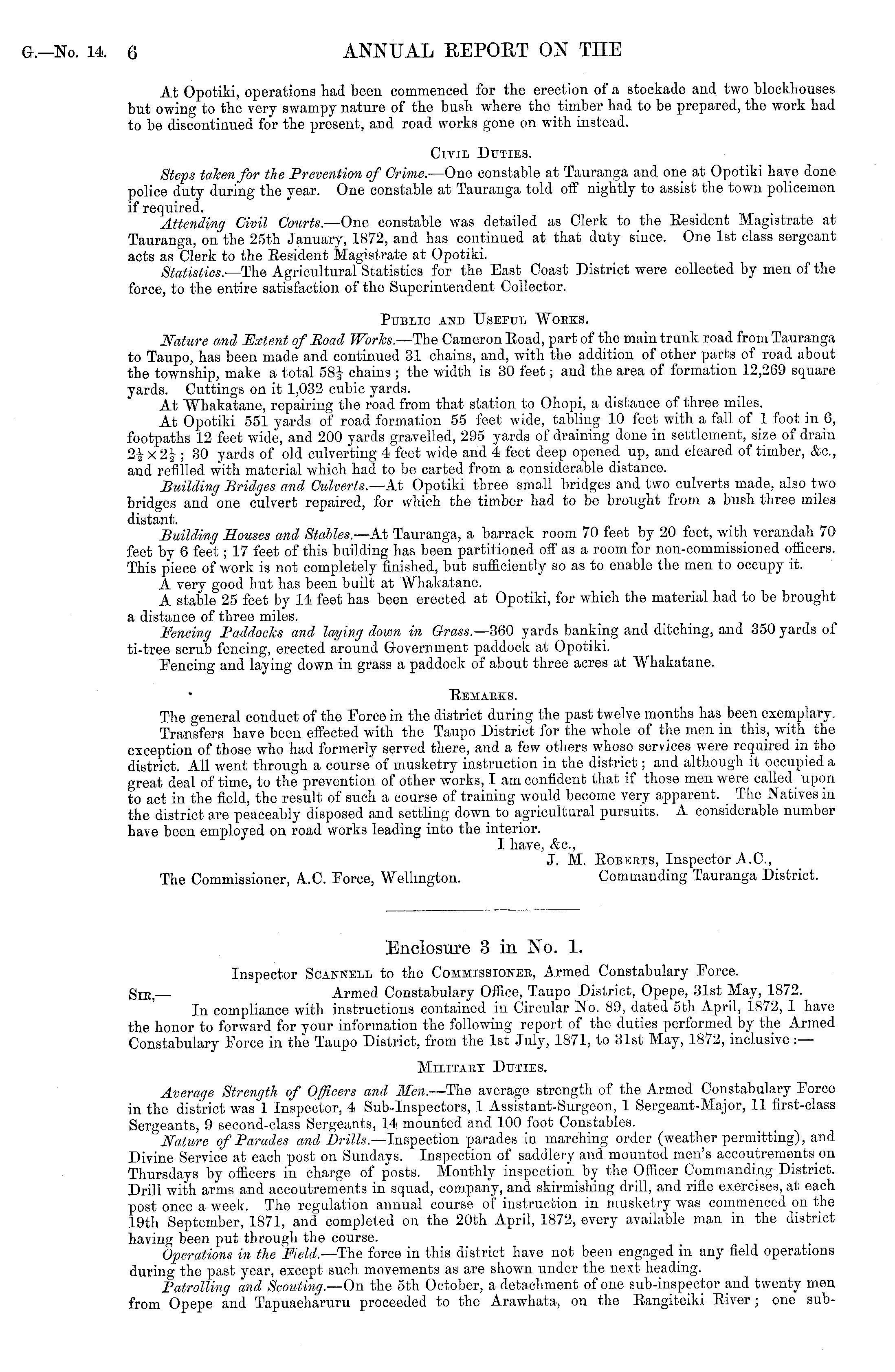 Enclosure 3 in No. 1. Inspector Scannell to the Commissioner, Armed Constabulary Force. Sir,— Armed Constabulary Office, Taupo District, Opepe, 31st May, 1872. In compliance with instructions contained in Circular No. 89, dated sth April, 1872, I have the honor to forward for your information the following report of the duties performed by the Armed Constabulary Force in the Taupo District, from the Ist July, 1871, to 31st May, 1872, inclusive :— Militaet Duties. Average Strength of Officers and Men. —The average strength of the Armed Constabulary Force in the district was 1 Inspector, 4 Sub-Inspectors, 1 Assistant-Surgeon, 1 Sergeant-Major, 11 first-class Sergeants, 9 second-class Sergeants, 14 mounted and 100 foot Constables. Nature of Parades mi Brills.— lnspection parades in marching order (weather permitting), and Divine Service at each post on Sundays. Inspection of saddlery and mounted men's accoutrements on Thursdays by officers in charge of posts. Monthly inspection by the Officer Commanding District. Drill with arms and accoutrements in squad, company, and skirmishing drill, and rifle exercises, at each post once a week. The regulation annual course of instruction in musketry was commenced on the 19th September, 1871, and completed on the 20th April, 1872, every available man in the district having been put through the course. Operations in the Field.—The force in this district have not been engaged in any field operations during the past year, except such movements as are shown under the next heading. Patrolling and Scouting.—On the sth October, a detachment of one sub-inspector and twenty men from Opepe and Tapuaeharuru proceeded to the Arawhata, on the Rangiteiki River ; one sub-