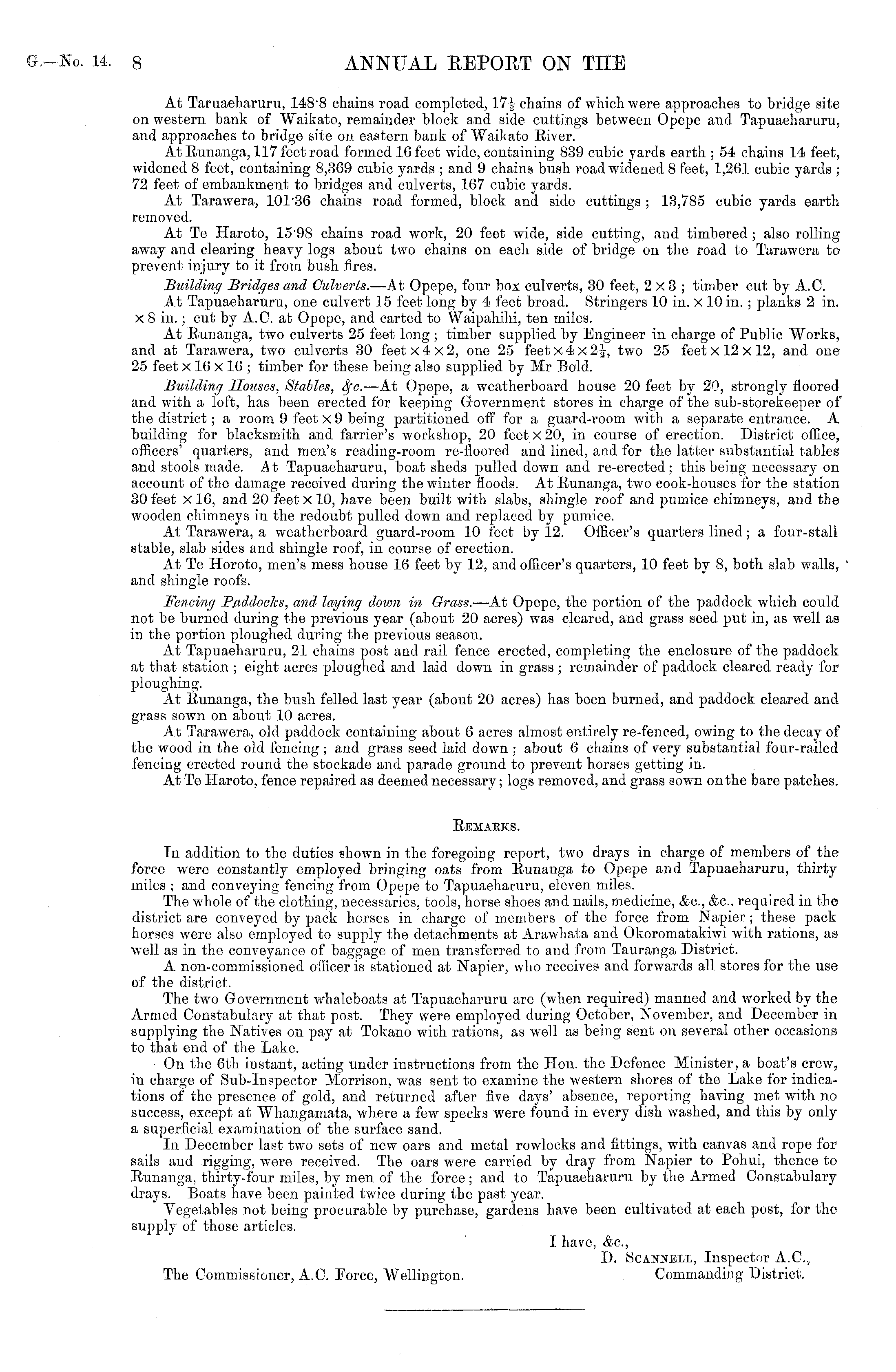 At Taruaebaruru, 148"8 chains road completed, I7i chains of which were approaches to bridge site on western bank of Waikato, remainder block and side cuttings between Opepe and Tapuaeharuru, and approaches to bridge site on eastern bank of Waikato River. At Eunanga, 117 feet road formed 1G feet wide, containing 839 cubic yards earth ; 54 chains 14 feet, widened 8 feet, containing 8,369 cubic yards ; and 9 chains bush road widened 8 feet, 1,261 cubic yards ; 72 feet of embankment to bridges and culverts, 167 cubic yards. At Tarawera, 10136 chains road formed, block and side cuttings ; 13,785 cubic yards earth removed. At Te Haroto, 1598 chains road work, 20 feet wide, side cutting, and timbered ; also rolling away and clearing heavy logs about two chains on each side of bridge on the road to Tarawera to prevent injury to it from bush fires. Building Bridges and Culverts. —At Opepe, four box culverts, 30 feet, 2x3; timber cut by A.C. At Tapuaeharuru, one culvert 15 feet long by 4 feet broad. Stringers 10 in. XlO in.; planks 2 in. X 8 in.; cut by A.C at Opepe, and carted to Waipahihi, ten miles. At Eunanga, two culverts 25 feet long ; timber supplied by Engineer in charge of Public "Works, and at Tarawera, two culverts 30 feetx4x2, one 25 feet X 4 x 2-j, two 25 feet X 12x12, and one 25 feet X 16 x 16 ; timber for these being also supplied by Mr Bold. Building Souses, Stables, Sfc. —At Opepe, a weatherboard house 20 feet by 20, strongly floored and with a loft, has been erected for keeping Government stores in charge of the sub-storekeeper of the district; a room 9 feet x 9 being partitioned off for a guard-room with a separate entrance. A building for blacksmith and farrier's workshop, 20 feet x 20, in course of erection. District office, officers' quarters, and men's reading-room re-floored and lined, and for the latter substantial tables and stools made. At Tapuaeharuru, boat sheds pulled down and re-erected; this being necessary on account of the damage received during the winter floods. At Eunanga, two cook-houses for the station 30 feet X 16, and 20 feet x 10, have been built with slabs, shingle roof and pumice chimneys, and the wooden chimneys in the redoubt pulled down and replaced by pumice. At Tarawera, a weatherboard guard-room 10 feet by 12. Officer's quarters lined; a four-stall stable, slab sides and shingle roof, in course of erection. At Te Horoto, men's mess house 16 feet by 12, and officer's quarters, 10 feet by 8, both slab walls, and shingle roofs. Fencing P&ddocks, and laying down in Grass. —At Opepe, the portion of the paddock which could not be burned during the previous year (about 20 acres) was cleared, and grass seed put in, as well as in the portion ploughed during the previous season. At Tapuaeharuru, 21 chains post and rail fence erected, completing the enclosure of the paddock at that station ; eight acres ploughed and laid down in grass ; remainder of paddock cleared ready for ploughing. At Eunanga, the bush felled last year (about 20 acres) has been burned, and paddock cleared and grass sown on about 10 acres. At Tarawera, old paddock containing about 6 acres almost entirely re-fenced, owing to the decay of the wood in the old fencing ; and grass seed laid down ; about 6 chains of very substantial four-railed fencing erected round the stockade and parade ground to prevent horses getting in. At Te Haroto, fence repaired as deemed necessary; logs removed, and grass sown on the bare patches. Eemaeks. In addition to the duties shown in the foregoing report, two drays in charge of members of the force were constantly employed bringing oats from Eunanga to Opepe and Tapuaeharuru, thirty miles ; and conveying fencing from Opepe to Tapuaeharuru, eleven miles. The whole of the clothing, necessaries, tools, horse shoes and nails, medicine, &c, &c. required in the district are conveyed by pack horses in charge of members of the force from Napier; these pack horses were also employed to supply the detachments at Arawhata and Okoromatakiwi with rations, as well as in the conveyance of baggage of men transferred to and from Tauranga District. A non-commissioned officer is stationed at Napier, who receives and forwards all stores for the use of the district. The two Government whaleboats at Tapuaeharuru are (when required) manned and worked by the Armed Constabulary at that post. They were employed during October, November, and December in supplying the Natives on pay at Tokano with rations, as well as being sent on several other occasions to that end of the Lake. On the 6th instant, acting under instructions from the Hon. the Defence Minister, a boat's crew, in charge of Sub-Inspector Morrison, was sent to examine the western shores of the Lake for indications of the presence of gold, and returned after five days' absence, reporting having met with no success, except at Whangamata, where a few specks were found in every dish washed, and this by only a superficial examination of the surface sand. In December last two sets of new oars and metal rowlocks and fittings, with canvas and rope for sails and rigging, were received. The oars were carried by dray from Napier to Pohui, thence to Eunanga, thirty-four miles, by men of the force; and to Tapuaeharuru by the Armed Constabulary drays. Boats have been painted twice during the past year. Vegetables not being procurable by purchase, gardens have been cultivated at each post, for the supply of those articles. I have, &c, D. Scaotell, Inspector A.C, The Commissioner, A.C. Force, Wellington. , Commanding District,