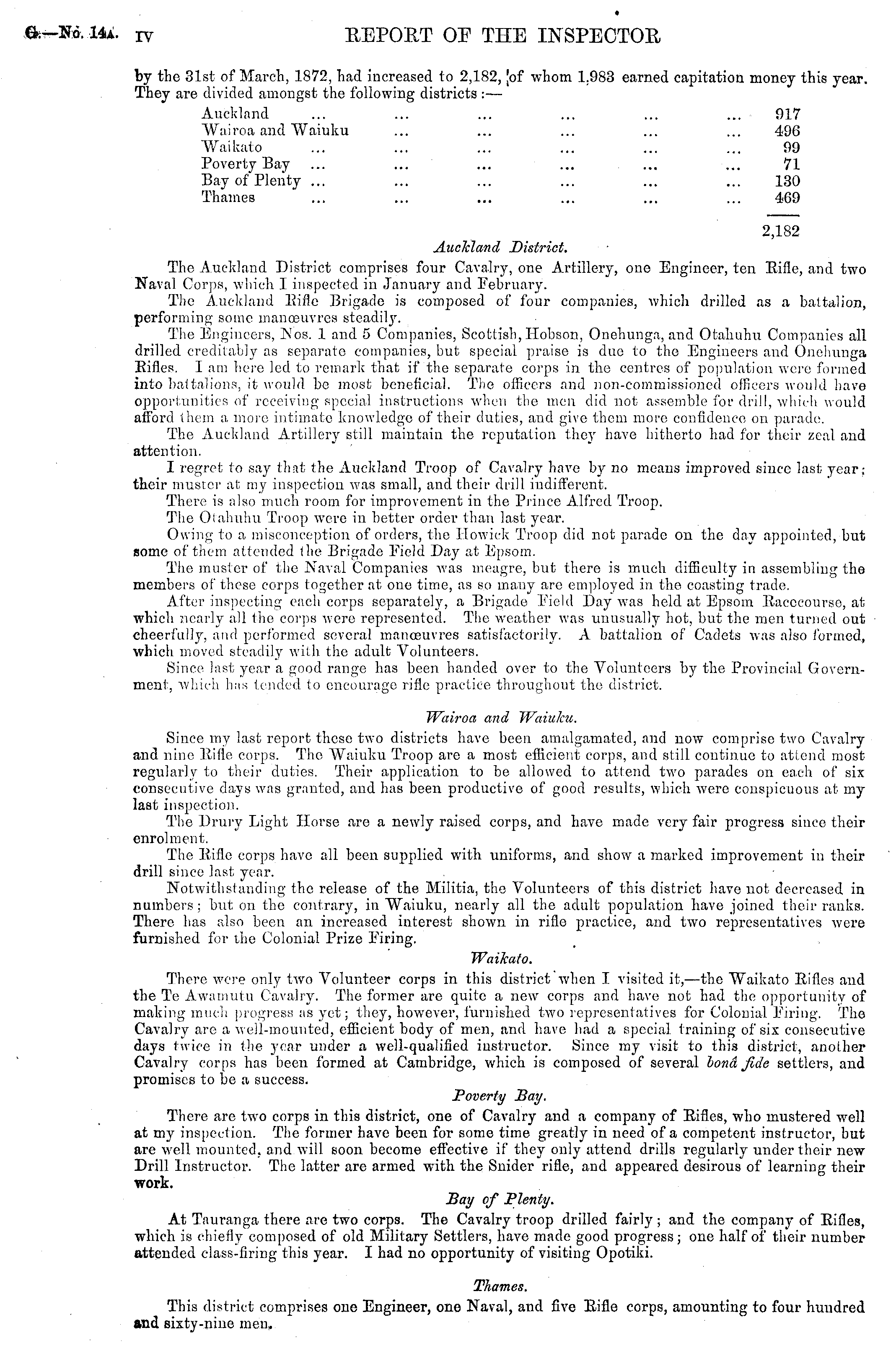 by the 31st of March, 1872, had increased to 2,182, [of whom 1.983 earned capitation money this year. They are divided amongst the following districts : — Auckland ... ... ... ... ... ... 917 Wairoa and Waiuku ... ... ... ... ... 496 Waikato ... ... ... ... ... ... 99 Poverty Bay ... ... ... ... ... ... 71 Bay of Plenty ... ... ... ... ... ... 130 Thames ... ... ... ... ... ... 469 2,182 Auckland Bistrict. The Auckland District comprises four Cavalry, one Artillery, one Engineer, ten Rifle, and two Naval Corps, which I inspected in January and February. The Auckland Rifle Brigade is composed of four companies, which drilled as a battalion, performing some manoeuvres steadily. The Engineers, Nos. 1 and 5 Companies, Scottish, Hobson, Onehunga, and Otahuhu Companies all drilled creditably as separate companies, but special praise is duo to the Engineers and Onehunga Rifles. lam here led to remark that if the separate corps in the centres of population were formed into battalions, it would be most beneficial. The officers and non-commissioned officers would have opportunities of receiving special instructions when the men did not assemble for drill, which would afford them a more intimate knowledge of their duties, and give them more confidence on parade. The Auckland Artillery still maintain the reputation they have hitherto had for their zeal and attention. I regret to say that the Auckland Troop of Cavalry have by no means improved since last year; their muster at my inspection was small, and their drill indifferent. There is also much room for improvement in the Prince Alfred Troop. The Otahuhu Troop were in better order than last year. Owing to a misconception of orders, the Howick Troop did not parade on the day appointed, but some of them attended the Brigade Field Day at Epsom. The muster of the Naval Companies was meagre, but there is much difficulty in assembling the members of these corps together at ono time, as so many are employed in the coasting trade. After inspecting each corps separately, a Brigade Field Day was held at Epsom Racecourse, at which nearly all the corps were represented. The weather was unusually hot, but the men turned out cheerfully, and performed several manoeuvres satisfactorily. A battalion of Cadets was also formed, which moved steadily with the adult Volunteers. Since last year a good range has been handed over to the Volunteers by the Provincial Government, which has tended to encourage rifle practice throughout the district. Wairoa and Waiuku. Since my last report these two districts have been amalgamated, and now comprise two Cavalry and nine Rifle corps. The Waiuku Troop are a most efficient corps, and still continue to attend most regularly to their duties. Their application to be allowed to attend two parades on each of six consecutive days was granted, and has been productive of good results, which were conspicuous at my last inspection. The Drury Light Horse are a newly raised corps, and havo made very fair progress since their enrolment. The Rifle corps havo all been supplied with uniforms, and show a marked improvement in their drill since last year. Notwithstanding the release of the Militia, the Volunteers of this district have not decreased in numbers; but on the contrary, in Waiuku, nearly all the adult population have joined their ranks. There has also been an increased interest shown in rifle practice, and two representatives were furnished for the Colonial Prize Firing. Waikato. There were only two Volunteer corps in this district when I visited it, —the Waikato Rifles and the Te Awamutu Cavalry. The former are quite a new corps and have not had the opportunity of making much progress as yet; they, however, furnished two representatives for Colonial Firing. The Cavalry arc a well-mounted, efficient body of men, and have had a special training of six consecutive days twice in the year under a well-qualified instructor. Since my visit to this district, another Cavalry corps has been formed at Cambridge, which is composed of several bond fide settlers, and promises to be a success. Poverty Bay. There are two corps in this district, one of Cavalry and a company of Rifles, who mustered well at my inspection. The former have been for some time greatly in need of a competent instructor, but are well mounted, and will soon become effective if they only attend drills regularly under their new Drill Instructor. The latter are armed with the Snider rifle, and appeared desirous of learning their work. Bay of Plenty. At Tauranga there are two corps. The Cavalry troop drilled fairly; and the company of Rifles, which is chiefly composed of old Military Settlers, have made good progress; one half of their number attended class-firing this year. I had no opportunity of visiting Opotiki. Thames. This district comprises one Engineer, one Naval, and five Rifle corps, amounting to four hundred and sixty-nine men.