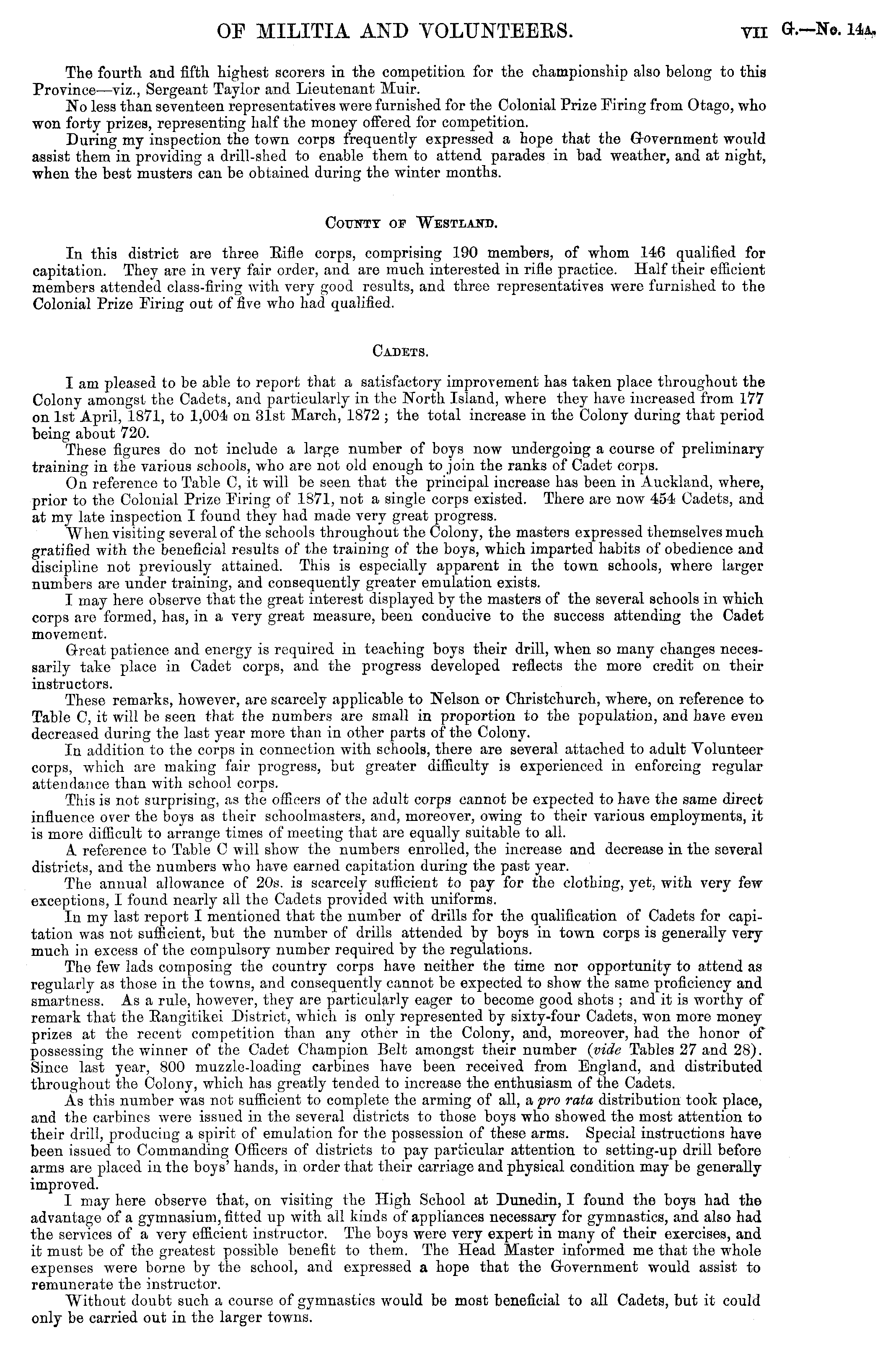 The fourth and fifth highest scorers in the competition for the championship also belong to this Province —viz., Sergeant Taylor and Lieutenant Muir. No less than seventeen representatives were furnished for the Colonial Prize Firing from Otago, who won forty prizes, representing half the money offered for competition. During my inspection the town corps frequently expressed a hope that the Government would assist them in providing a drill-shed to enable them to attend parades in bad weather, and at night, when the best musters can be obtained during the winter months. County of Westland. In this district are three Rifle corps, comprising 190 members, of whom 146 qualified for capitation. They are in very fair order, and are much interested in rifle practice. Half their efficient members attended class-firing with very good results, and three representatives were furnished to the Colonial Prize Firing out of five who had qualified. Cadets. I am pleased to be able to report that a satisfactory improvement has taken place throughout the Colony amongst the Cadets, and particularly in the North Island, where they have increased from 177 on Ist April, 1871, to 1,004 on 31st March, 1872 ; the total increase in tho Colony during that period being about 720. These figures do not include a large number of boys now undergoing a course of preliminary training in the various schools, who are not old enough to join the ranks of Cadet corps. On reference to Table C, it will be seen that the principal increase has been in Auckland, where, prior to the Colonial Prize Firing of 1371, not a single corps existed. There are now 454 Cadets, and at my late inspection I found they had made very great progress. When visiting several of the schools throughout the Colony, the masters expressed themselves much gratified with the beneficial results of the training of the boys, which imparted habits of obedience and discipline not previously attained. This is especially apparent in the town schools, where larger numbers are under training, and consequently greater emulation exists. I may here observe that the great interest displayed by the masters of the several schools in which corps are formed, has, in a very great measure, been conducive to the success attending the Cadet movement. Great patience and energy is required in teaching boys their drill, when so many changes necessarily take place in Cadet corps, and the progress developed reflects the more credit on their instructors. These remarks, however, are scarcely applicable to Nelson or Christchurch, where, on reference to Table C, it will be seen that the numbers are small in proportion to the population, and have even decreased during the last year more than in other parts of the Colony. In addition to the corps in connection with schools, there are several attached to adult Volunteer corps, which are making fair progress, but greater difficulty is experienced in enforcing regular attendance than with school corps. This is not surprising, as the officers of the adult corps cannot be expected to have the same direct influence over the boys as their schoolmasters, and, moreover, owing to their various employments, it is more difficult to arrange times of meeting that are equally suitable to all. A reference to Table C will show the numbers enrolled, the increase and decrease in the several districts, and the numbers who have earned capitation during the past year. The annual allowance of 20s. is scarcely sufficient to pay for the clothing, yet, with very few exceptions, I found nearly all the Cadets provided with uniforms. In my last report I mentioned that the number of drills for the qualification of Cadets for capitation was not sufficient, but the number of drills attended by boys in town corps is generally very much in excess of the compulsory number required by the regulations. Tho few lads composing the country corps have neither the time nor opportunity to attend as regularly as those in the towns, and consequently cannot be expected to show the same proficiency and smartness. As a rule, however, they are particularly eager to become good shots ; and it is worthy of remark that the Rangitikei District, which is only represented by sixty-four Cadets, won more money prizes at the recent competition than any other in the Colony, and, moreover, had the honor of possessing the winner of the Cadet Champion Belt amongst their number (vide Tables 27 and 28). Since last year, 800 muzzle-loading carbines have been received from England, and distributed throughout the Colony, which has greatly tended to increase the enthusiasm of the Cadets. As this number was not sufficient to complete the arming of all, a, pro rata distribution took place, and the carbines were issued in the several districts to those boys who showed the most attention to their drill, producing a spirit of emulation for the possession of these arms. Special instructions have been issued to Commanding Officers of districts to pay particular attention to setting-up drill before arms are placed in the boys' hands, in order that their carriage and physical condition may be generally improved. I may here observe that, on visiting the High School at Dunedin, I found the boys had the advantage of a gymnasium, fitted up with all kinds of appliances necessary for gymnastics, and also had the services of a very efficient instructor. The boys were very expert in many of their exercises, and it must be of the greatest possible benefit to them. The Head Master informed me that tho whole expenses were borne by the school, and expressed a hope that the Government would assist to remunerate the instructor. Without doubt such a course of gymnastics would be most beneficial to all Cadets, but it could only be carried out in the larger towns.
