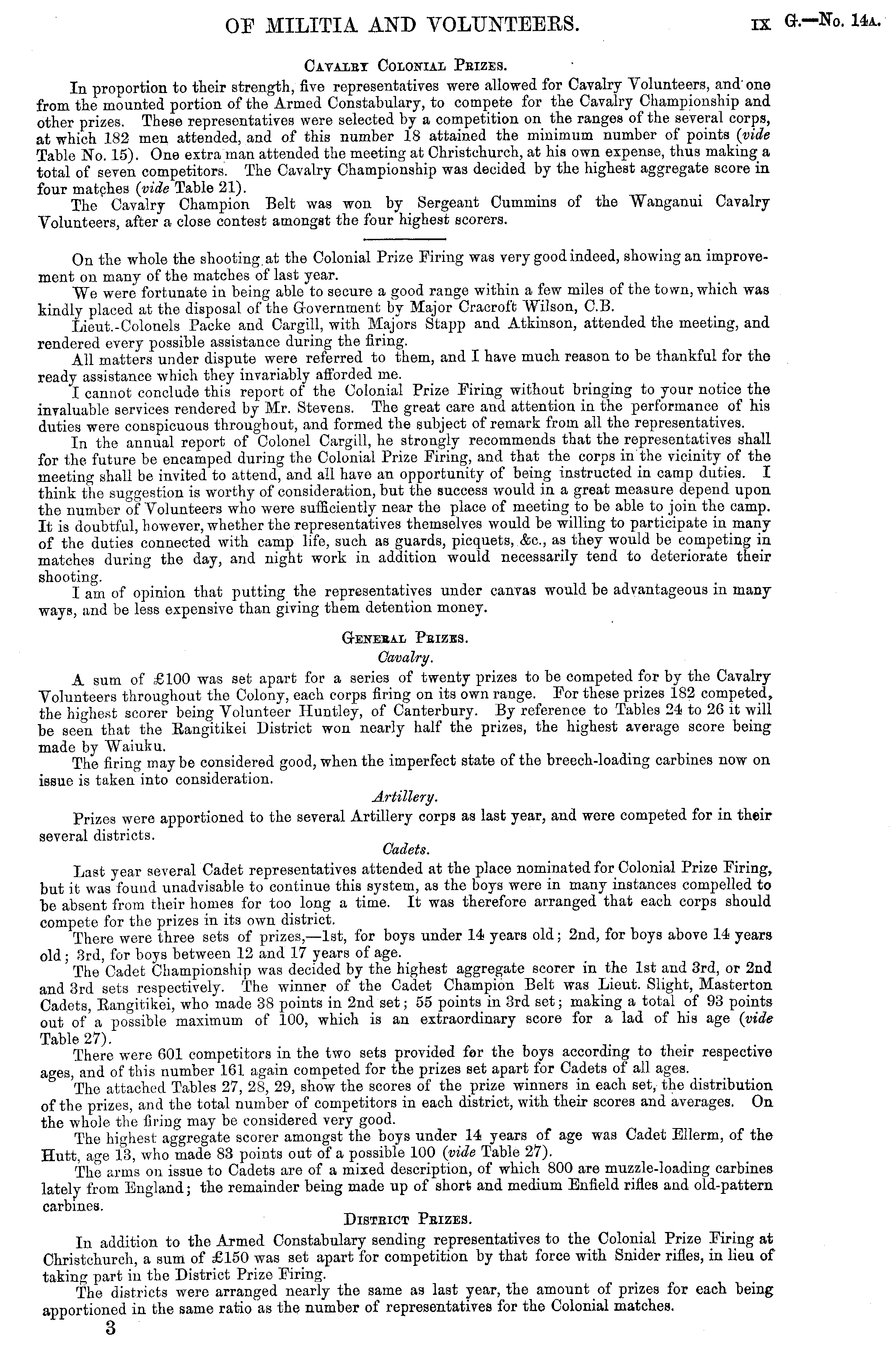On the whole the shooting, at the Colonial Prize Firing was very good indeed, showing an improvement on many of the matches of last year. We were fortunate in being able to secure a good range within a few miles of the town, which was kindly placed at tho disposal of the Government by Major Cracroft Wilson, C.B. Lieut.-Colonels Packe and Cargill, with Majors Stapp and Atkinson, attended the meeting, and rendered every possible assistance during the firing. All matters under dispute were referred to them, and I have much reason to be thankful for the ready assistance which they invariably afforded me. I cannot conclude this report of the Colonial Prize Firing without bringing to your notice the invaluable services rendered by Mr. Stevens. The great care and attention in the performance of his duties were conspicuous throughout, and formed the subject of remark from all the representatives. In the annual report of Colonel Cargill, he strongly recommends that the representatives shall for the future be encamped during the Colonial Prize Firing, and that the corps in the vicinity of the meeting shall be invited to attend, and all have an opportunity of being instructed in camp duties. I think the suggestion is worthy of consideration, but the success would in a great measure depend upon the number of Volunteers who were sufficiently near the place of meeting to be able to join the camp. It is doubtful, however, whether the representatives themselves would be willing to participate in many of the duties connected with camp life, such as guards, picquets, &c, as they would be competing in matches during the day, and night work in addition would necessarily tend to deteriorate their shooting. I am of opinion that putting the representatives under canvas would be advantageous in many ways, and be less expensive than giving them detention money. Geneeal Peizes. Cavalry. A sum of £100 was set apart for a series of twenty prizes to be competed for by the Cavalry Volunteers throughout the Colony, each corps firing on its own range. For these prizes 182 competed, the highest scorer being Volunteer Huntley, of Canterbury. By reference to Tables 24 to 26 it will be seen that the Rangitikei District won nearly half the prizes, the highest average score being made by Waiuku. The firing may be considered good, when the imperfect state of the breech-loading carbines now on issue is taken into consideration. Artillery. Prizes were apportioned to the several Artillery corps as last year, and were competed for in their several districts. Cadets. Last year several Cadet representatives attended at the place nominated for Colonial Prize Firing, but it was found unadvisable to continue this system, as the boys were in many instances compelled to be absent from their homes for too long a time. It was therefore arranged that each corps should compete for the prizes in its own district. There were three sets of prizes,—Ist, for boys under 14 years old; 2nd, for boys above 14 years old; 3rd, for boys between 12 and 17 years of age. The Cadet Championship was decided by the highest aggregate scorer in the Ist and 3rd, or 2nd and 3rd sets respectively. The winner of the Cadet Champion Belt was Lieut. Slight, Masterton Cadets, Rangitikei, who made 38 points in 2nd set; 55 points in 3rd set; making a total of 93 points out of'a possible maximum of 100, which is an extraordinary score for a lad of his age (vide Table 27). . , . There were 601 competitors in the two sets provided fer the boys according to their respective ages, and of this number 161 again competed for the prizes set apart for Cadets of all ages. The attached Tables 27, 28, 29, show the scores of the prize winners in each set, the distribution of the prizes, and the total number of competitors in each district, with their scores and averages. On the whole the firing may be considered very good. The highest aggregate scorer amongst the boys under 14 years of age was Cadet Ellerm, of the Hutt, age 13, who made 83 points out of a possible 100 (vide Table 27). The arms on issue to Cadets are of a mixed description, of which 800 are muzzle-loading carbines lately from England; the remainder being made up of short and medium Enfield rifles and old-pattern carbines. Disteict Peizes. In addition to the Armed Constabulary sending representatives to the Colonial Prize Firing at Christchurch, a sum of £150 was set apart "for competition by that force with Snider rifles, in lieu of taking part in the District Prize Firing. The districts were arranged nearly the same as last year, the amount of prizes for each being apportioned in the same ratio as the number of representatives for the Colonial matches. 3
