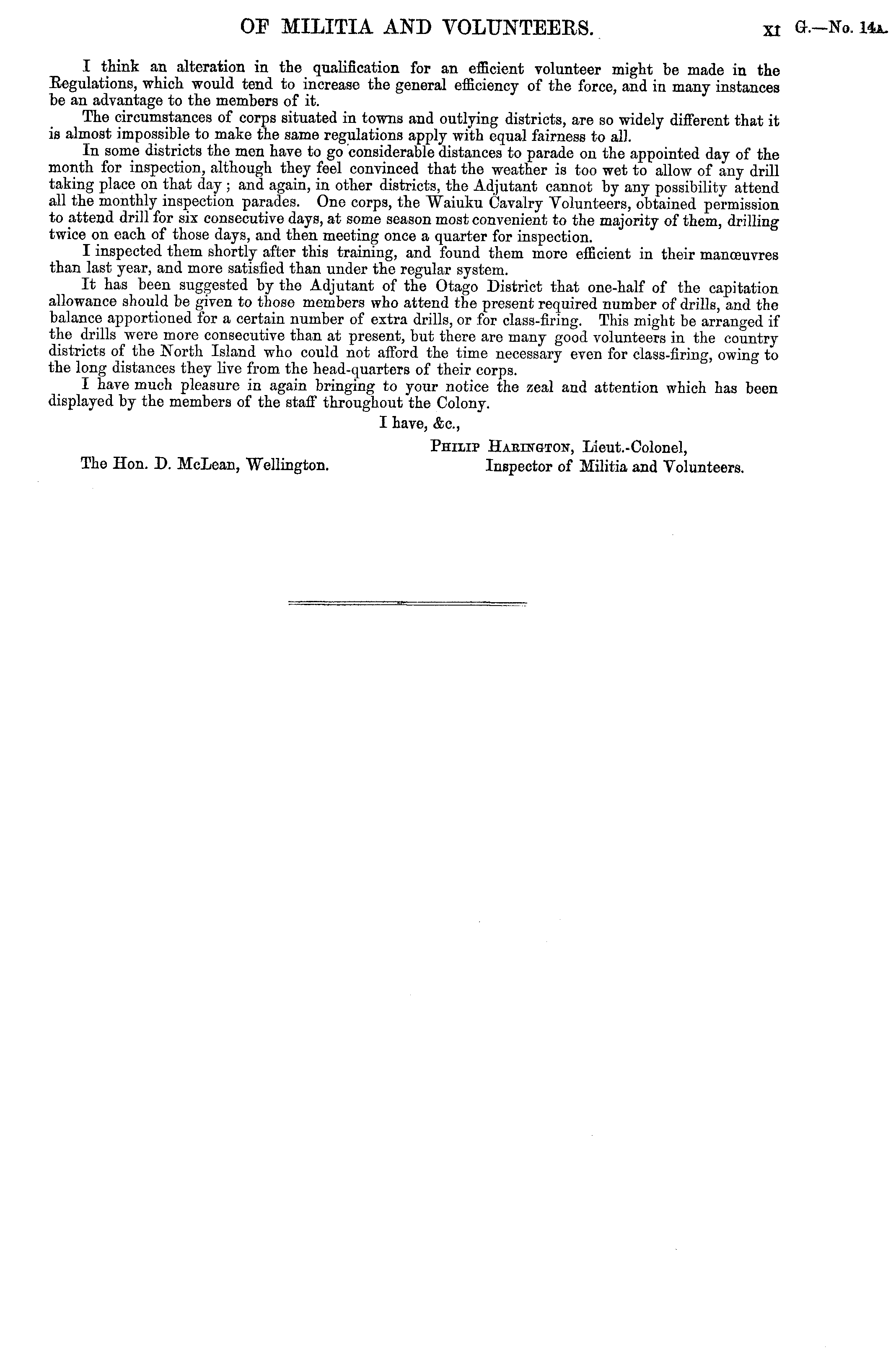 I think an alteration in the qualification for an efficient volunteer might be made in the Regulations, which would tend to increase the general efficiency of the force, and in many instances be an advantage to the members of it. The circumstances of corps situated in towns and outlying districts, are so widely different that it is almost impossible to make the same regulations apply with equal fairness to all. In some districts the men have to go considerable distances to parade on the appointed day of the month for inspection, although they feel convinced that the weather is too wet to allow of any drill taking place on that day ; and again, in other districts, the Adjutant cannot by any possibility attend all the monthly inspection parades. One corps, the Waiuku Cavalry Volunteers, obtained permission to attend drill for six consecutive days, at some season most convenient to the majority of them, drilling twice on each of those days, and then meeting once a quarter for inspection. I inspected them shortly after this training, and found them more efficient in their manoeuvres than last year, and more satisfied than under the regular system. It has been suggested by the Adjutant of the Otago District that one-half of the capitation allowance should be given to those members who attend the present required number of drills, and the balance apportioned for a certain number of extra drills, or for class-firing. This might be arranged if the drills were more consecutive than at present, but there are many good volunteers in the country districts of the North Island who could not afford the time necessary even for class-firing, owing to the long distances they live from the head-quarters of their corps. I have much pleasure in again bringing to your notice the zeal and attention which has been displayed by the members of the staff throughout the Colony. I have, &c, Philip Habtngton, Lieut.-Colonel, The Hon. D. McLean, Wellington. Inspector of Militia and Volunteers.