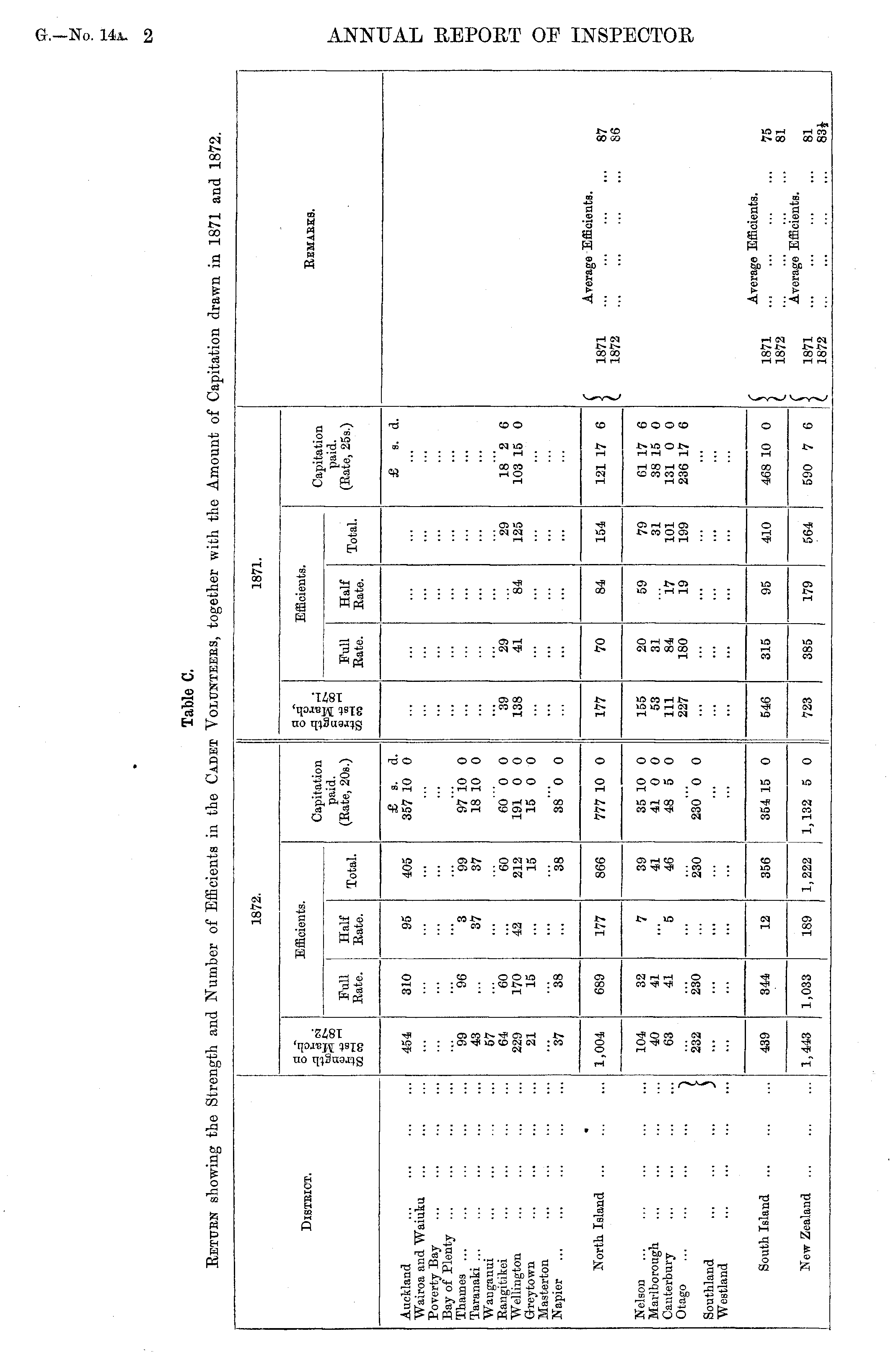 Table C. Return showing the Strength and Number of Efficients in the Cadet Volunteers, together with the Amount of Capitation drawn in 1871 and 1872.