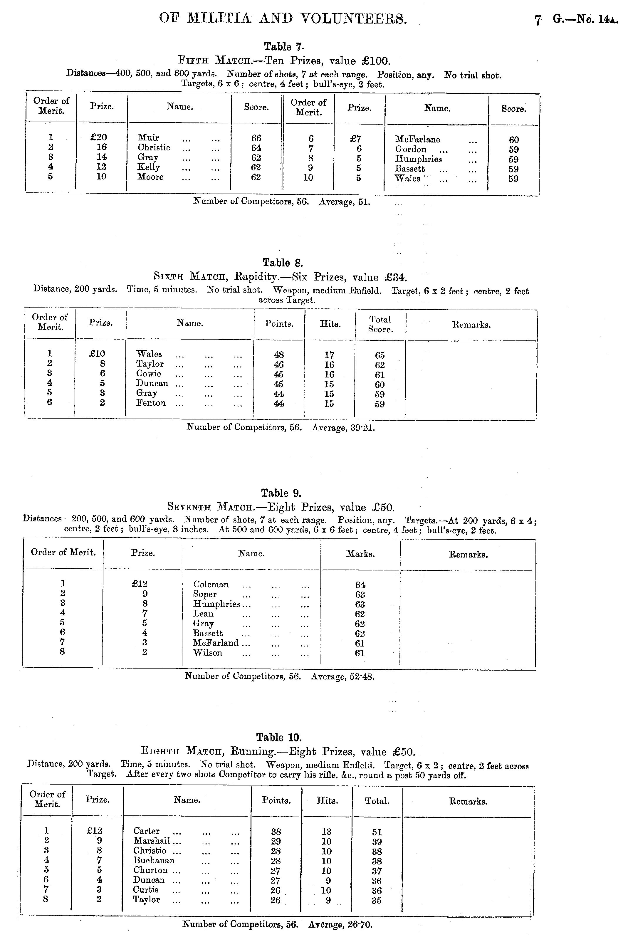 Order of Merit. Prize. Name. Score. Order of Merit. Prize. Name. Score. 1 2 3 4 5 £20 16 14 12 10 Muir Christie Gray Kelly Moore 66 64 62 62 62 6 7 8 9 10 £7 6 5 5 5 McFarlane Gordon Humphries Bassett Wales " 60 59 59 59 59 Number of Competitors, 56. Average, 51. Distance, Table 8. Sixth Match, Rapidity.—Six Prizes, value £34. 100 yards. Time, 5 minutes. No trial shot. Weapon, medium Enfiold. Targ across Target. get, 6x2 feet; centre, 2 feet Order of Merit, Prize. Name. Points. Hits. otal Prize. Name. Hits. Total Score. Remarks. Remarks. 1 2 3 4 5 6 £10 8 6 5 3 2 Wales Taylor ... Cowie Duncan ... Gray Fenton ... 48 46 45 45 4.4 44 17 16 16 15 15 15 65 62 61 60 59 59 Number of Competitors, 56. Average, 39'21. Table 9. listances —200, 50 centre, 2 Sei ), and 600 yards. feet; bull's-eye, 8 i tenth Match.—Eight Prizes, value £50. Number of shots, 7 at each range. Position, any. Targets.—At 200 yards, 6 x inches. At 500 and 600 yards, 6x6 feet; centre, 4 feet; bull's-eye, 2 feet. Order of Merit. Prize. Name. Marks. Remarks. 1 2 3 4 G 6 7 8 £12 9 8 7 5 4 3 2 Coleman Soper Humphries ... Lean Gray Bassett McFarland ... Wilson [ I | 64 63 63 62 62 62 61 61 I Number of Competitors, 56. Average, 52'48. Table 10. Distance, !00 yards. Target. Eighth Match, Running.—Eig ?ime, 5 minutes. No trial shot. Weapon, After every two shots Competitor to carry ght Prizes, value £ , medium Enfield. Tarj his rifle, &e., round a pi 50. ;et, 6x2; centre, 2 feet across >st 50 yards off. Order of Merit. Prize. Name. Points. Hits. Total. Remarks. 1 2 3 4 5 6 7 8 £12 9 8 7 5 4 3 2 Carter Marshall ... Christie ... Buchanan Churton ... Duncan ... Curtis Taylor ... 38 29 28 28 27 27 26 26 13 10 10 10 10 9 10 9 51 39 38 38 37 36 36 35 Number of Competitors, 56. Average, 26 70.